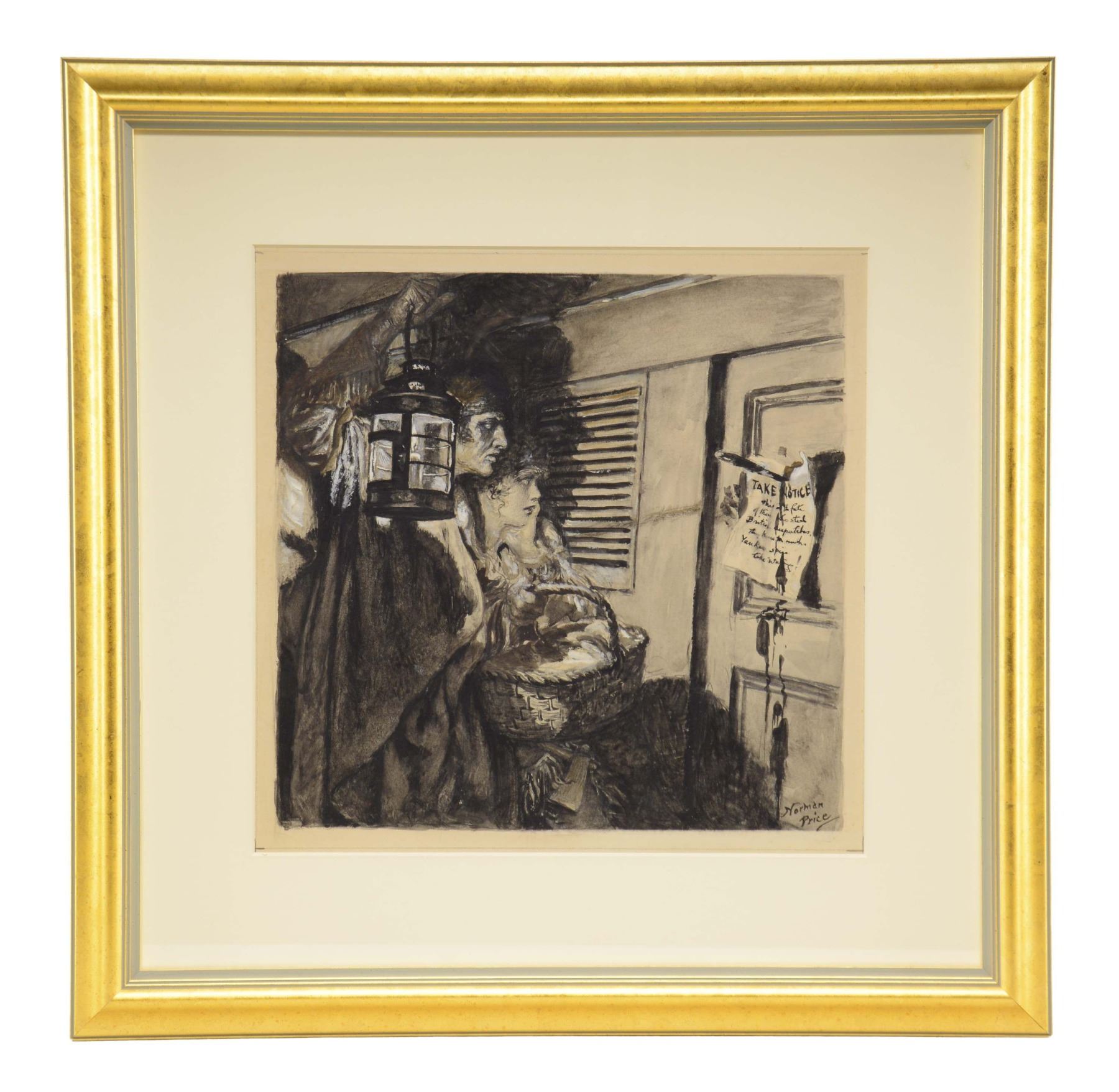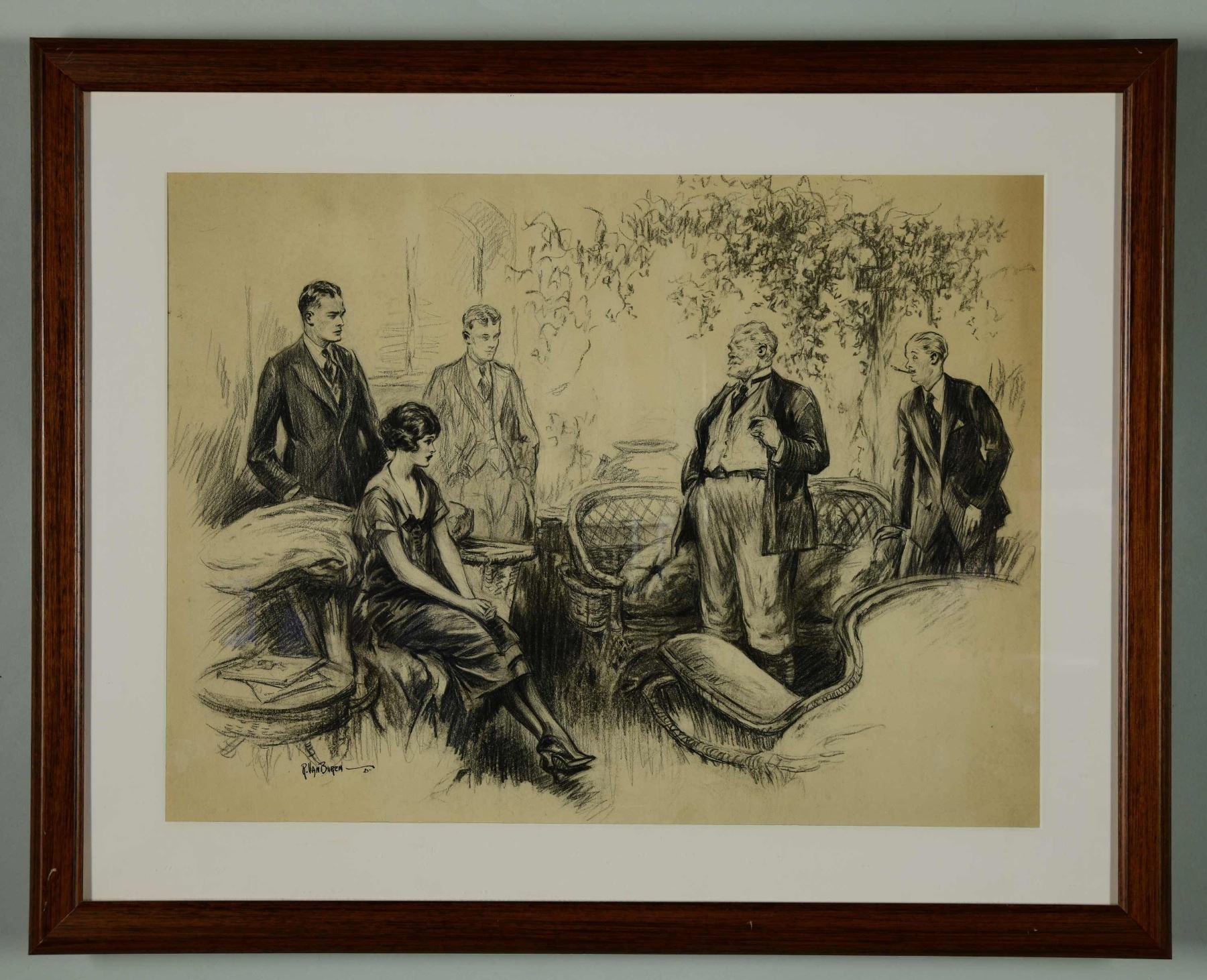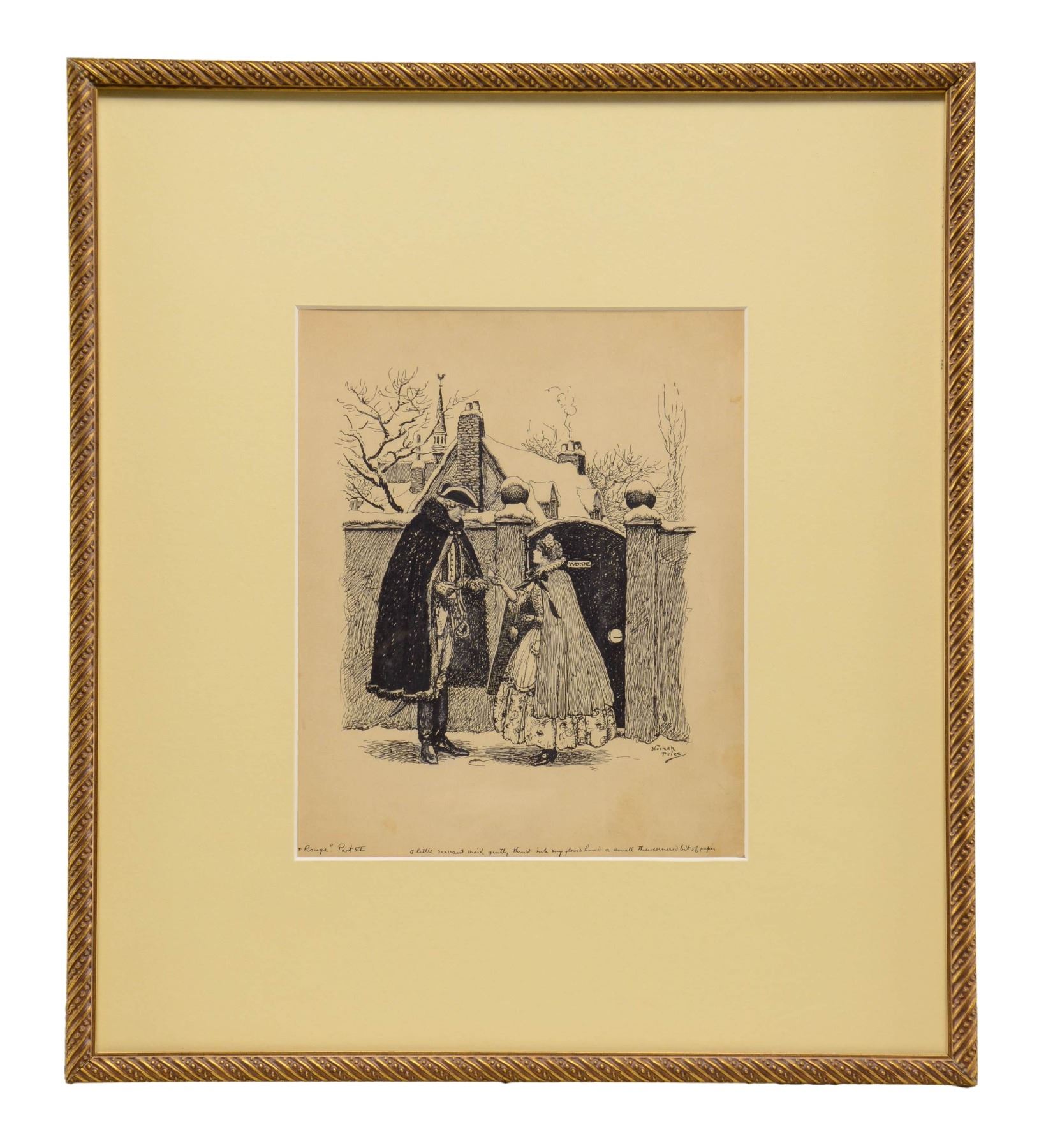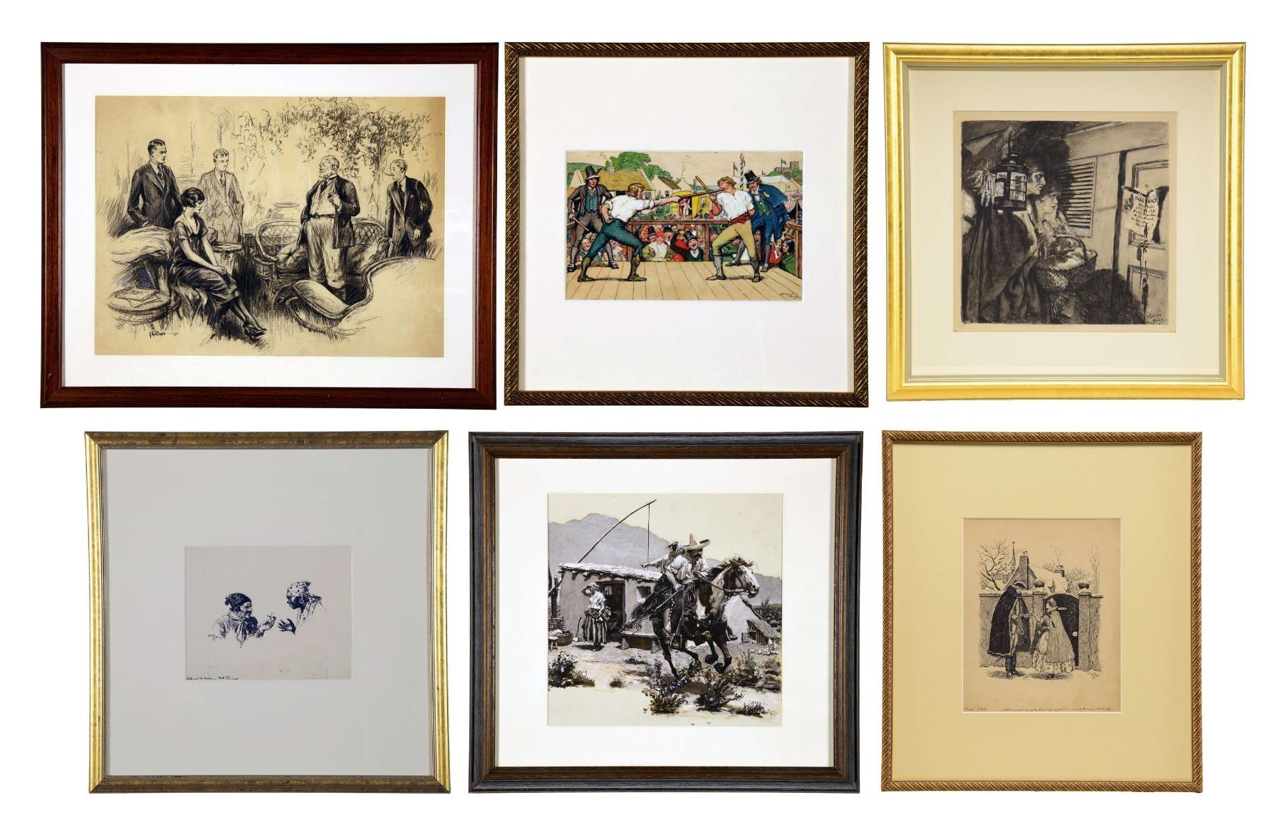 1) RAEBURN VAN BUREN (American, 1891-1987) A GROUP OF FOUR MEN AND WOMAN CONVERSING ON VERANDA. Pencil and charcoal illustration depicts men in conversation around an arrangement of wicker furniture; wisteria and a garden urn in the background. Signed and dated lower left. Housed in an oak molded frame, matted under glass. SIZE: overall 21 1/2" x 26 1/2", sight 15 1/2" x 20 1/2". CONDITION: very good. (05-890/TG). 2) NORMAN PRICE (American, 1877-1951) "PUBLIC CARNIVAL FIGHT FROM OLDEN TIMES". Pen, ink and gouache illustration depicting a fight with batons in the town square, a crowd looking on. Signed lower left. Housed in a gilt rope twist frame, matted under glass. SIZE: overall 13 1/2" x 13 1/2", sight 6" x 9 1/4". CONDITION: very good original condition with good color. (05-894/TG). 3) NORMAN PRICE (American, 1877-1951) "THE RED BIRD 'PART 4' OF THE RAKE AND THE HUSSEY". Watercolor illustration "'What cursed jest is this?' I muttered, examining the paper under my lifted lantern. 'This is no jest,' she whispered." Signed lower right. Housed in a gold gilt molded frame, matted under glass. SIZE: overall 18 1/4" x 18 1/2", sight 11 1/2" x 12". CONDITION: very good original condition. (05-905/TG). 4) NORMAN PRICE (American, 1877-1951) "THE RAKE AND THE HUSSEY PART II". Circa 1929. The pen and ink image depicting a tradeoff of a small parcel between two individuals. An illustration from Liberty Magazine, 07 December 1929. Signed lower left. Housed in a gold molded frame, matted under glass. SIZE: overall 16 1/2" x 16 1/2", sight 6 3/4" x 8". CONDITION: very good. (05-906/TG).. 5) NORMAN PRICE (American, 1877-1951) "WE CAN'T ALL BE THOROUGHBREDS". This watercolor and ink illustration was published in 1931 in the Cosmopolitan. The scene depicts a comanchero and lady on horseback galloping away from a small pueblo, a distraught woman in the doorway. Signed lower right "Norman Price". Housed in an antiqued molded wood frame, matted under glass. SIZE: overall 20" x 22", sight 17" x 19". CONDITION: very good. (05-933/TG). 6) NORMAN PRICE (American, 1877-1951) "WAR PAINT AND ROUGE". Circa 1931. Pen and ink illustration from "War Paint and Rouge Part VI", "a little servant maid quietly thrust into my gloved hand a small three-cornered bit of paper." The two posed in front of a gate in a winter scene. Signed lower right. Housed in a gold rope twist gilt frame, matted under glass. SIZE: overall 18" x 16", sight 9 3/4" x 8 3/4". CONDITION: very good overall surface with light even toning. (05-951/TG). $800-1,200.