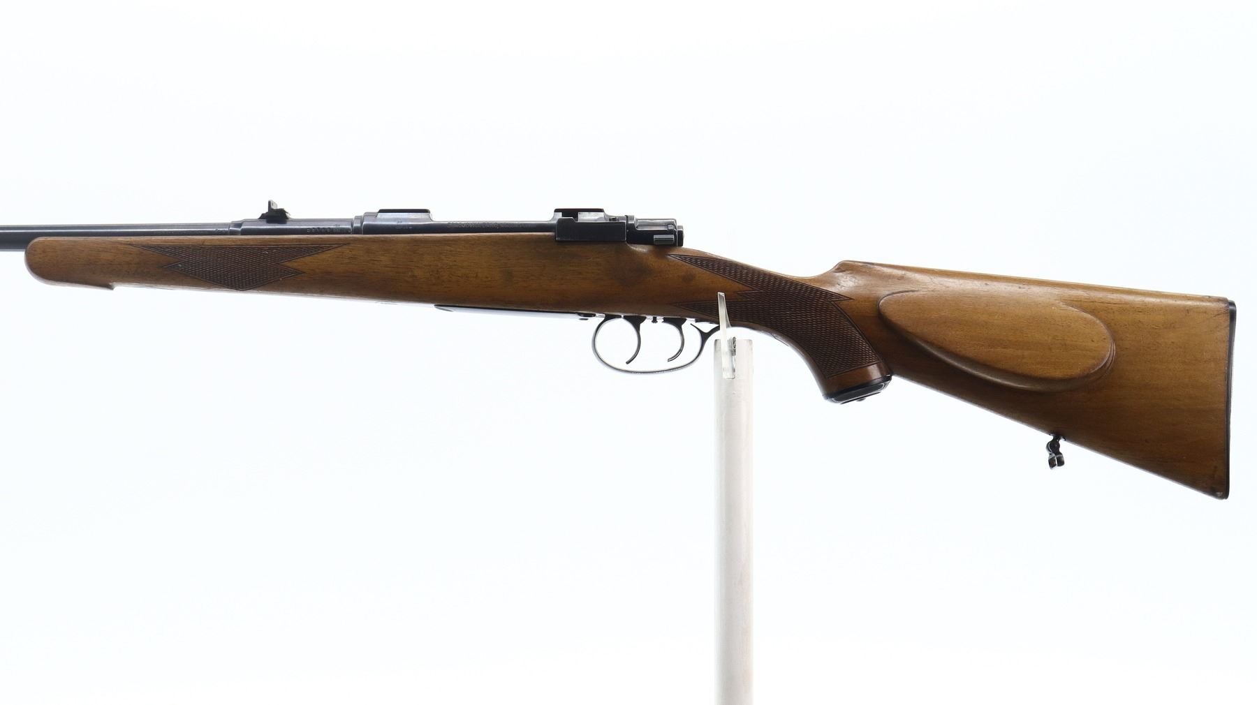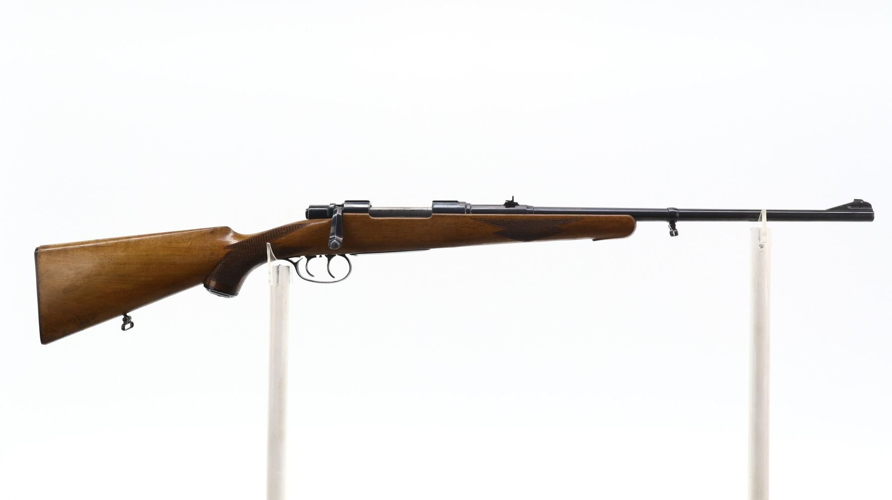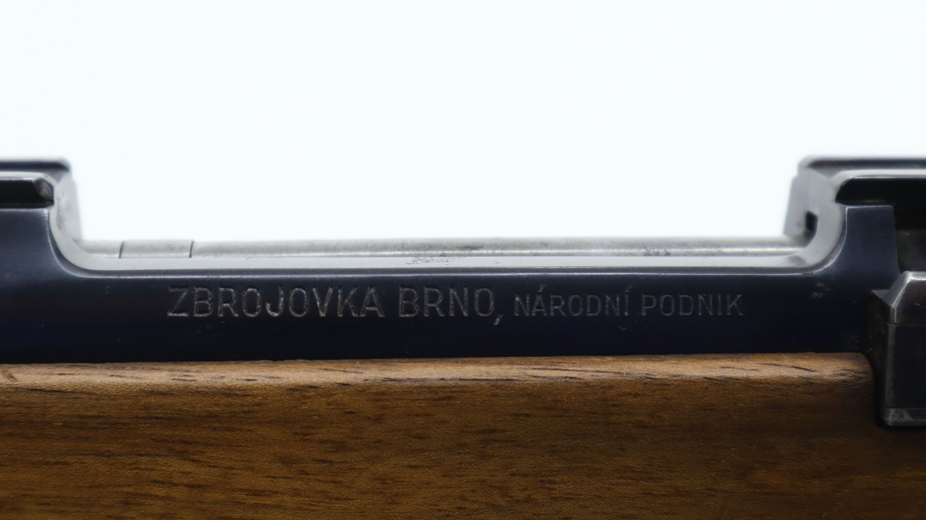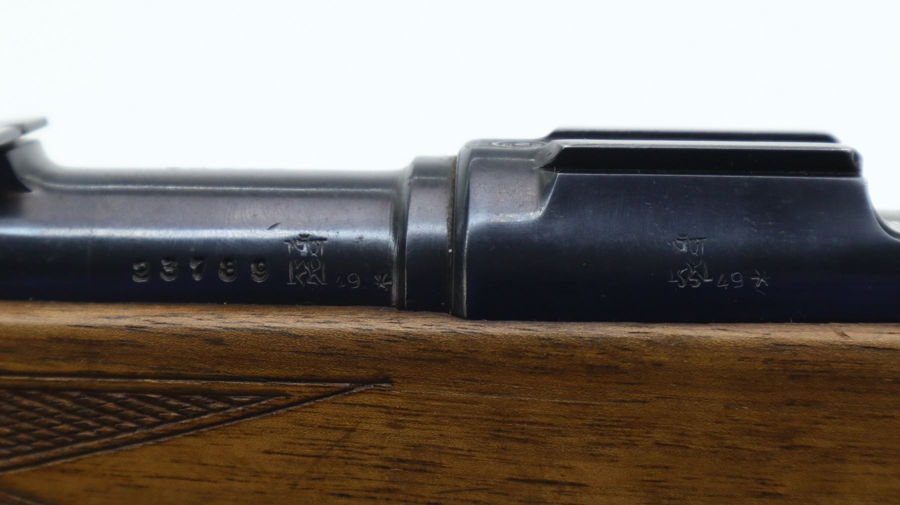 7+/10. CZ BRNO. MODEL: 21. CALIBER: 8MM MAUSER. BORE IS EXCELLENT, SHINY. MANUFACTURED 1949. BLADE FRONT SIGHT WITH RAMP, ADJUSTABLE U NOTCHED REAR SIGHT WITH ONE FIXED AND ONE FOLDING LEAF, POLISH BLUED FINISH, RECEIVER GROOVED FOR FACTORY SCOPE MOUNTS, BUTTERKNIFE BOLT HANDLE (LIGHT PITTING AT TIP). ONE PIECE WOOD STOCK, CHECKERED FOREARM AND PISTOL GRIP, EUROPEAN CHEEK REST, CHECKERED BLACK POLYMER BUTT PLATE, GRIP CAP, DOUBLE SET TRIGGERS, SLING SWIVELS. METAL FINISH SHOWS SOME SCRATCHES, HANDLING MARKS AND WEAR. STOCK SHOWS SOME MARKS, SCRATCHES AND WEAR. ACTION: BOLT ACTION RIFLE. BARREL LENGTH: 20.5". SERIAL # 23789. CLASS: CANADIAN NON RESTRICTED CLASS. CONDITION:7+/10