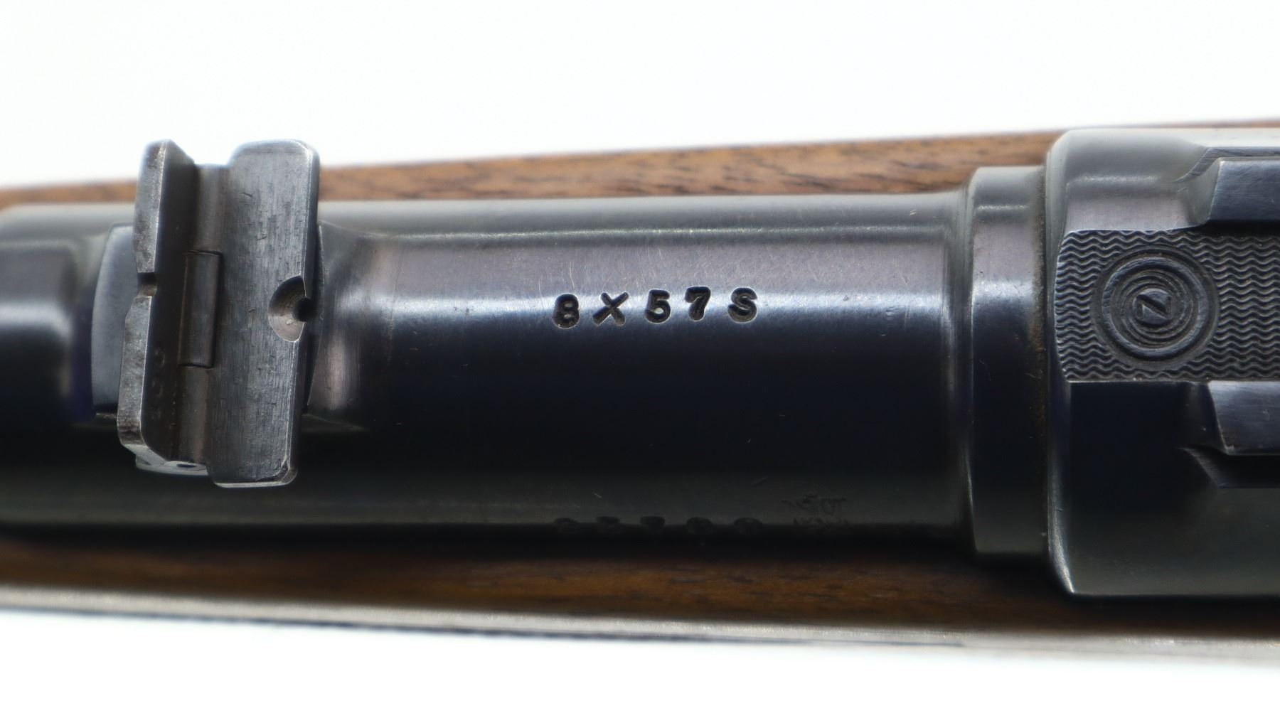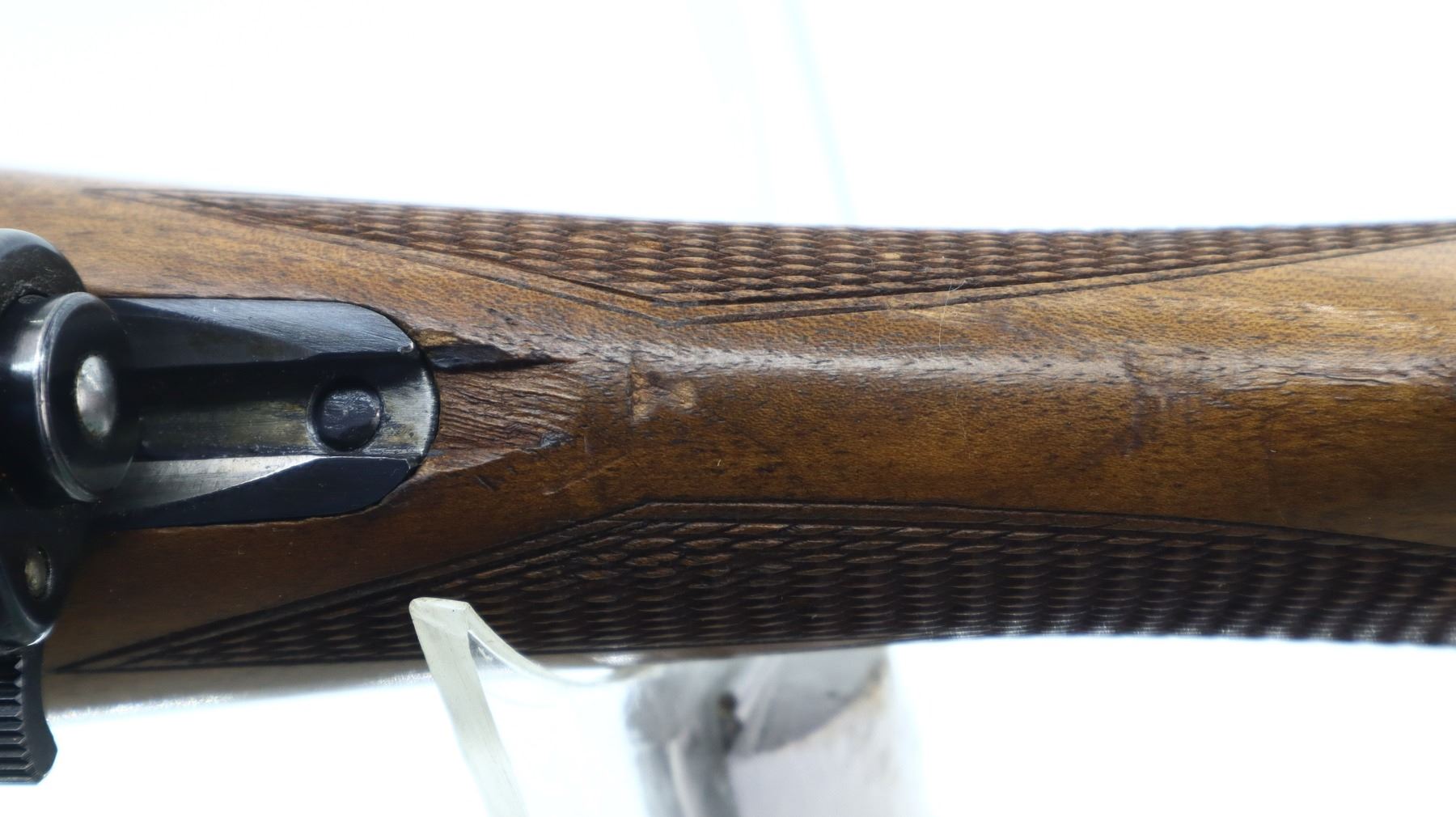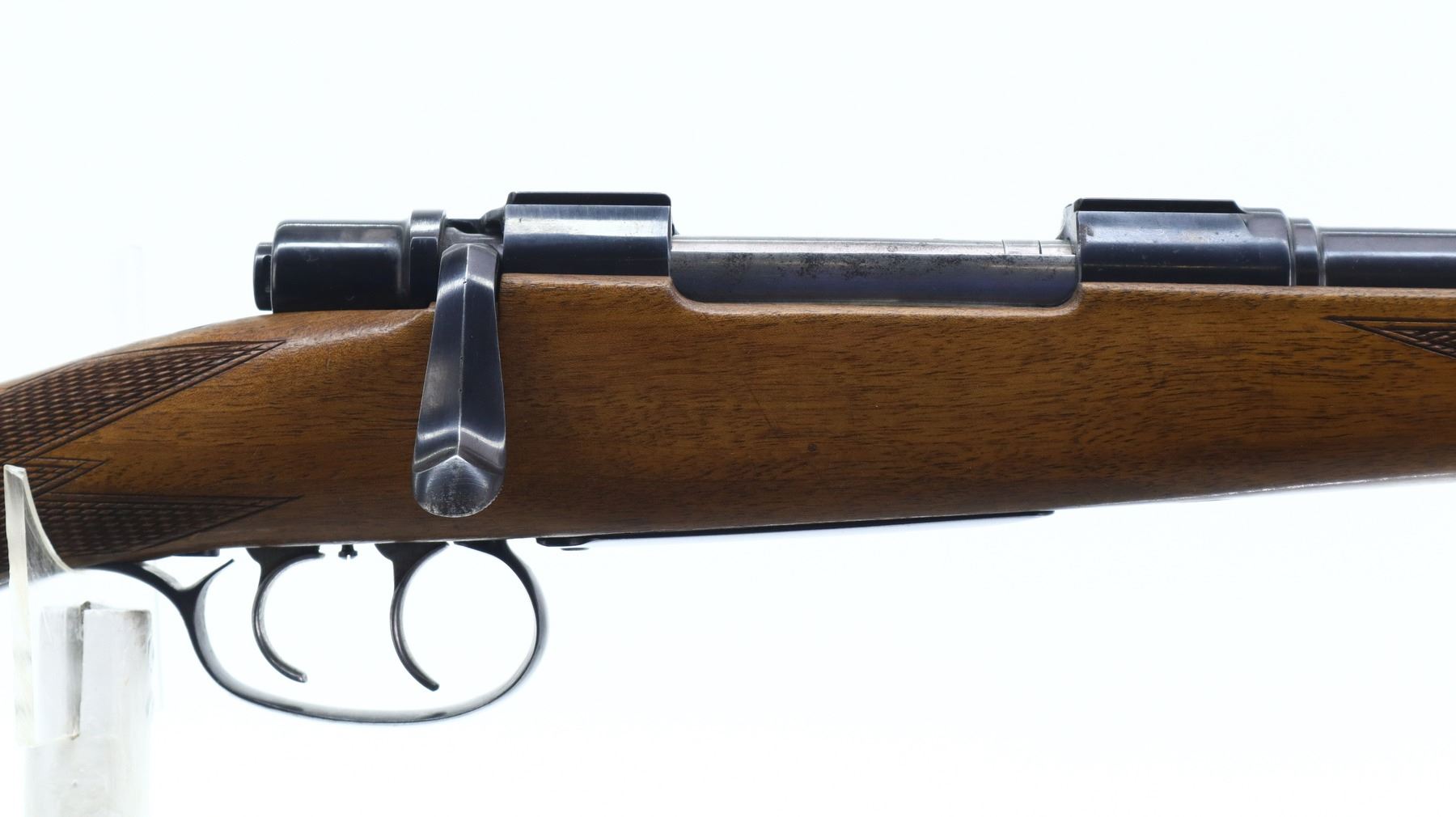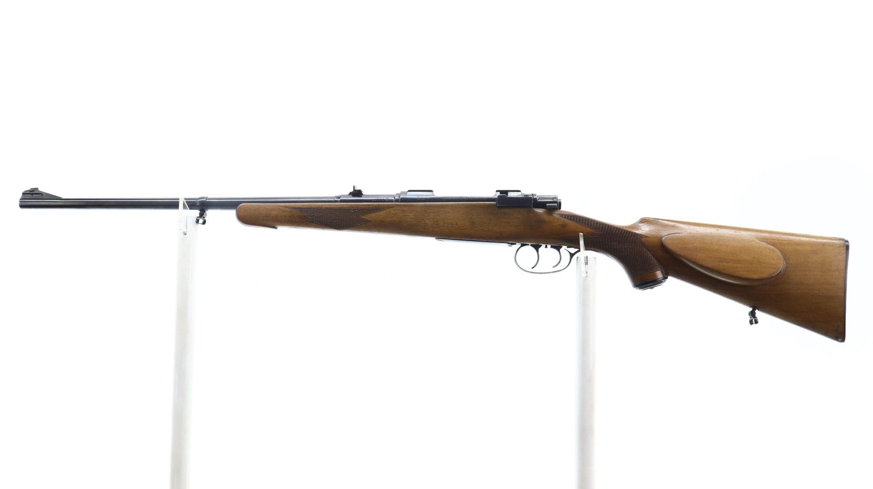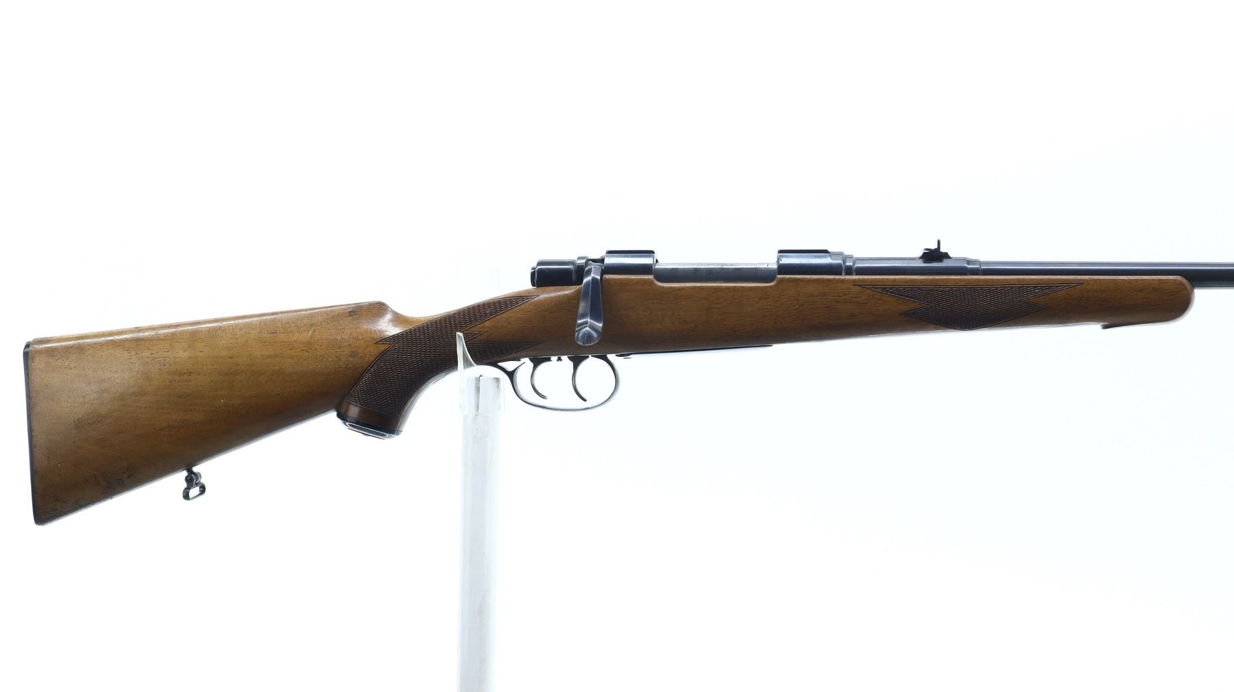 7+/10. CZ BRNO. MODEL: 21. CALIBER: 8MM MAUSER. BORE IS EXCELLENT, SHINY. MANUFACTURED 1949. BLADE FRONT SIGHT WITH RAMP, ADJUSTABLE U NOTCHED REAR SIGHT WITH ONE FIXED AND ONE FOLDING LEAF, POLISH BLUED FINISH, RECEIVER GROOVED FOR FACTORY SCOPE MOUNTS, BUTTERKNIFE BOLT HANDLE (LIGHT PITTING AT TIP). ONE PIECE WOOD STOCK, CHECKERED FOREARM AND PISTOL GRIP, EUROPEAN CHEEK REST, CHECKERED BLACK POLYMER BUTT PLATE, GRIP CAP, DOUBLE SET TRIGGERS, SLING SWIVELS. METAL FINISH SHOWS SOME SCRATCHES, HANDLING MARKS AND WEAR. STOCK SHOWS SOME MARKS, SCRATCHES AND WEAR. ACTION: BOLT ACTION RIFLE. BARREL LENGTH: 20.5". SERIAL # 23789. CLASS: CANADIAN NON RESTRICTED CLASS. CONDITION:7+/10