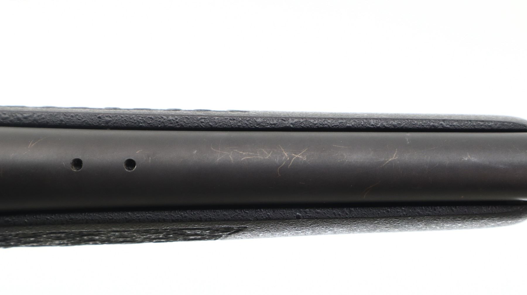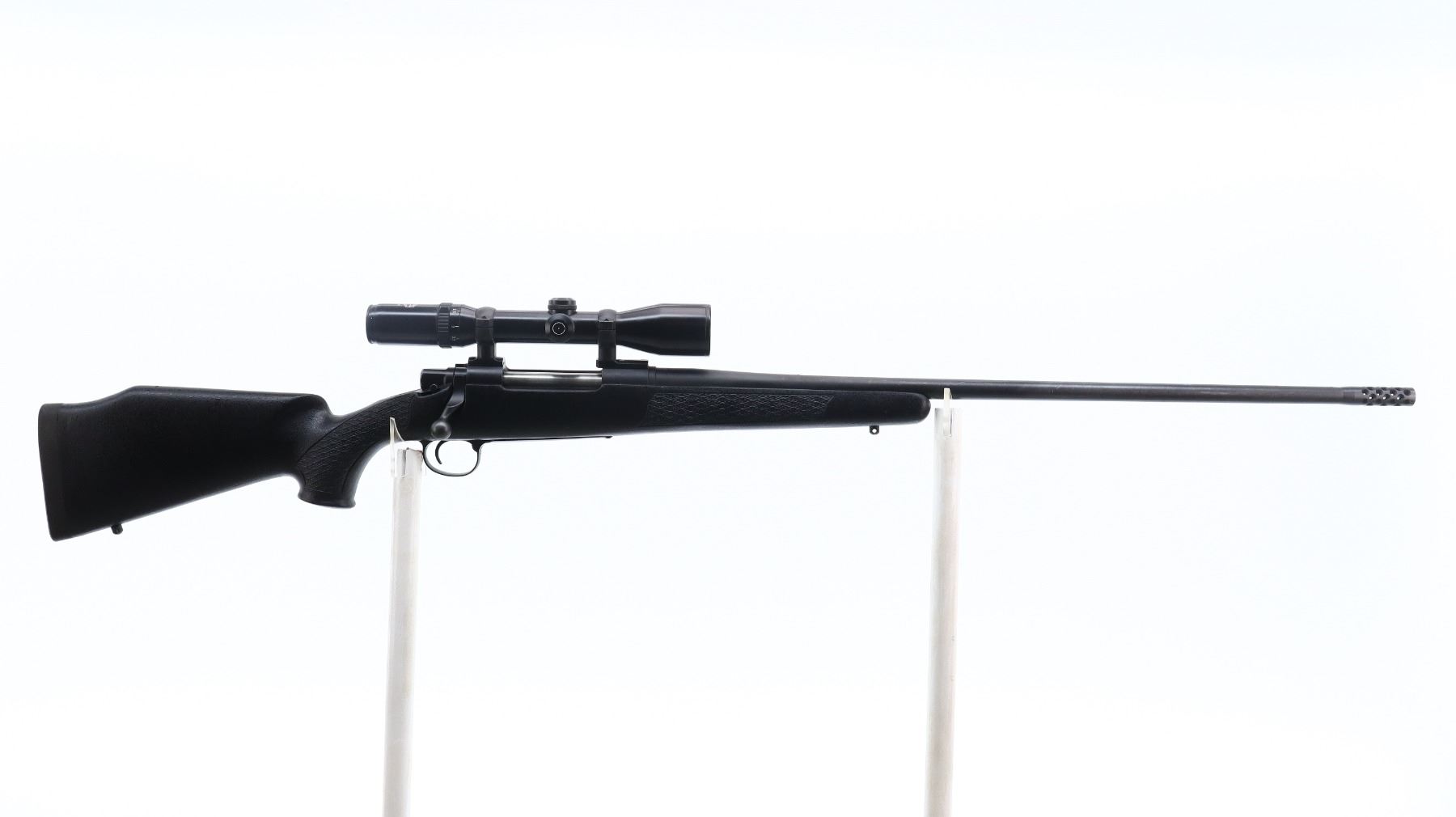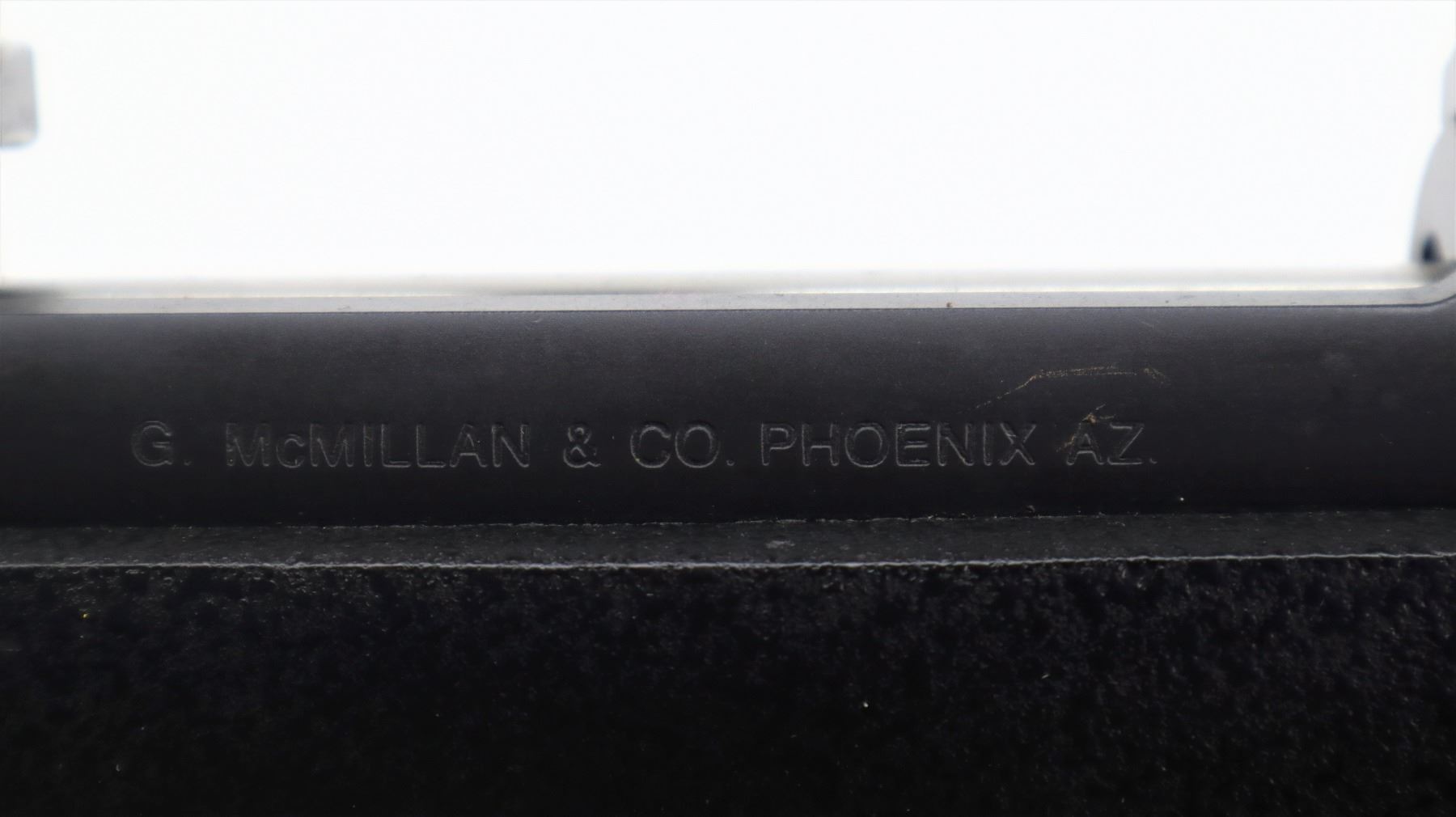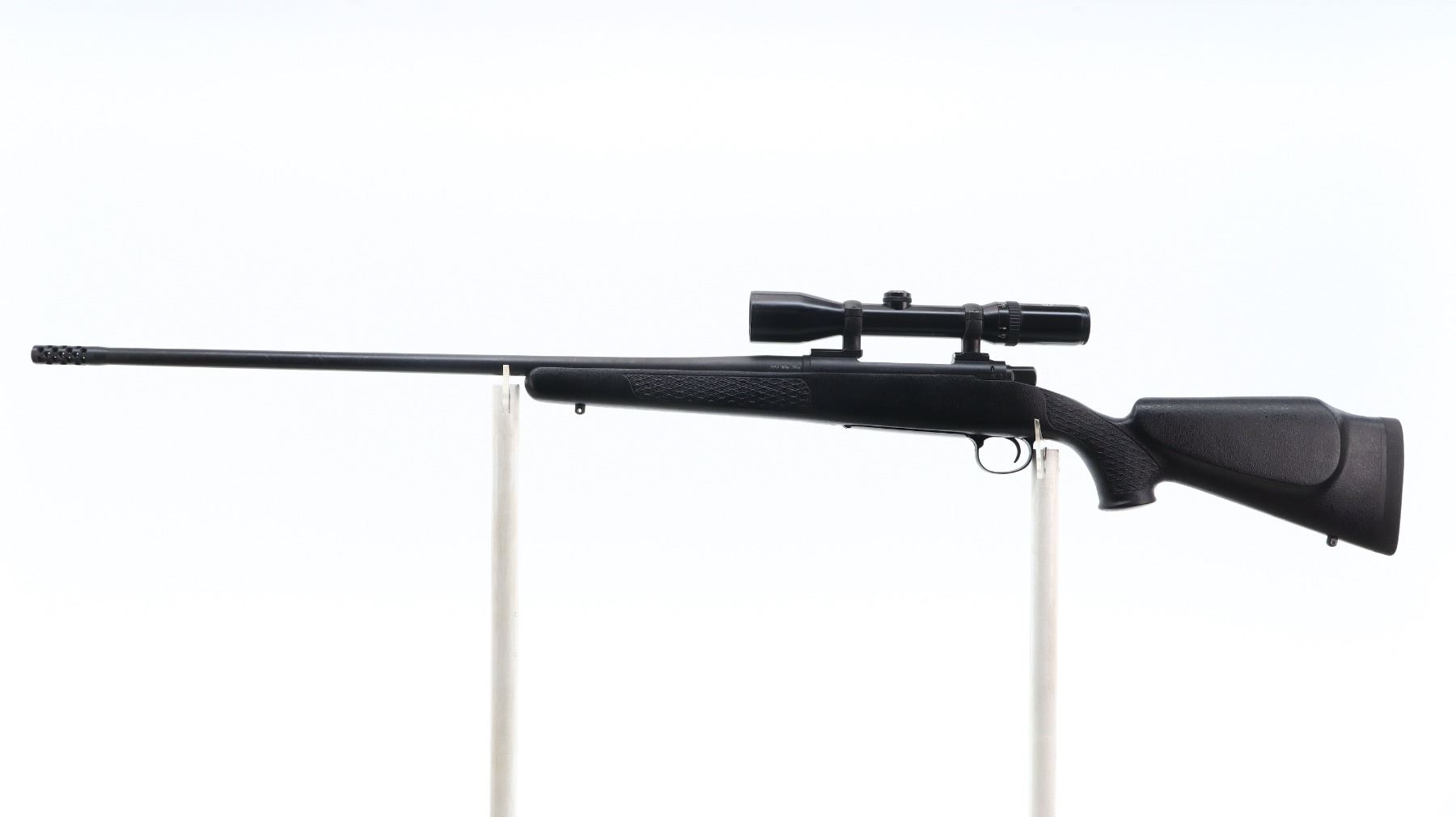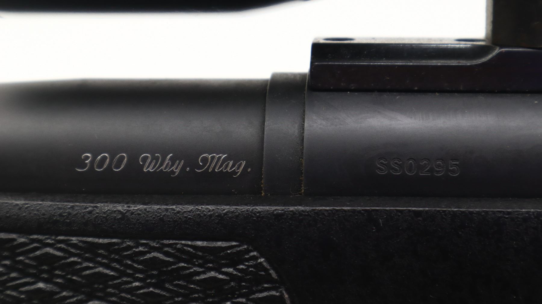 7/10. G. MCMILLAN. MODEL: SIGNATURE BOLT ACTION. CALIBER: 300 WBY MAG. BORE IS VERY GOOD, SHINY. FRONT AND REAR SIGHTS REMOVED, THREADED HOLES PRESENT, MUZZLE THREADED WITH PORTED BREAK INSTALLED, BLACK MATTE FINISH, RECEIVER DRILLED AND TAPPED WITH SCHMIDT AND BENDER 1 1/2 - 6X SCOPE, CLEAR OPTICS, GERMAN NO1 RETICLE, MISSING RUBBER EYE RING. ONE PIECE TEXTURED BLACK FIBERGLASS STOCK, CHECKERED FOREARM AND PISTOL GRIP, CHEEK REST, BLACK RUBBER RECOIL PAD, HINGED FLOOR PLATE AND SWIVEL STUDS. METAL FINISH SHOWS SCRATCHES, HANDLING MARKS AND WEAR. STOCK SHOWS MARKS, SCRATCHES AND WEAR. ACTION: BOLT ACTION RIFLE. BARREL LENGTH: 26". SERIAL # SS0295. CLASS: CANADIAN NON RESTRICTED CLASS. CONDITION:7/10