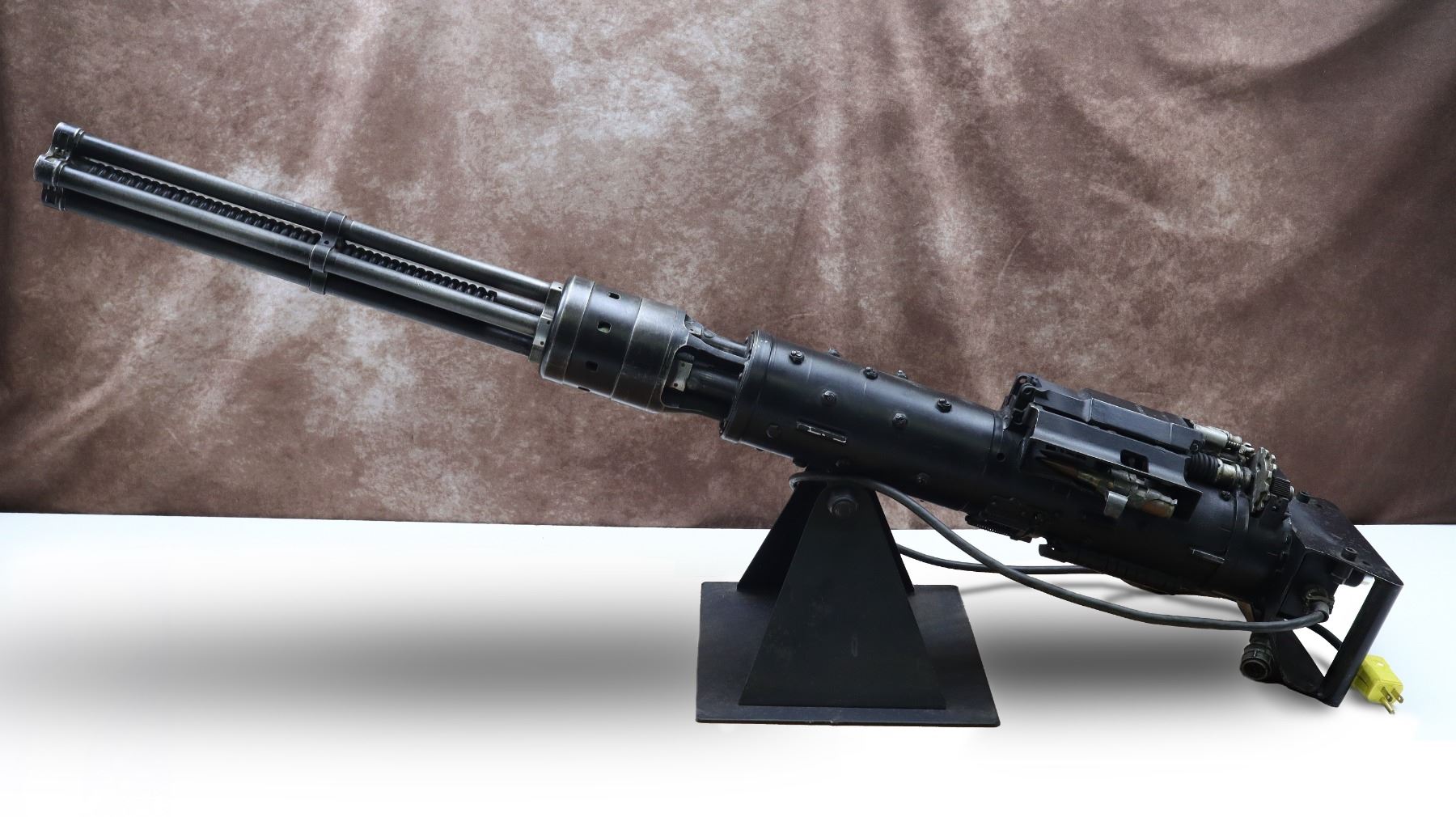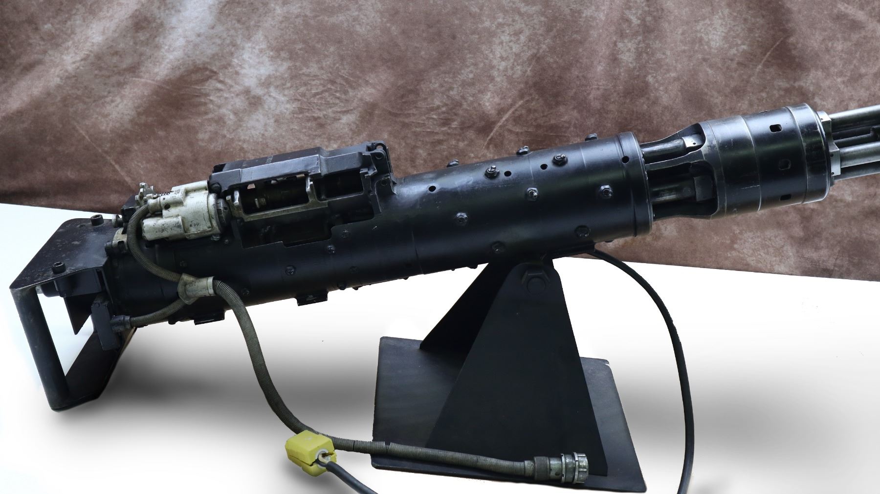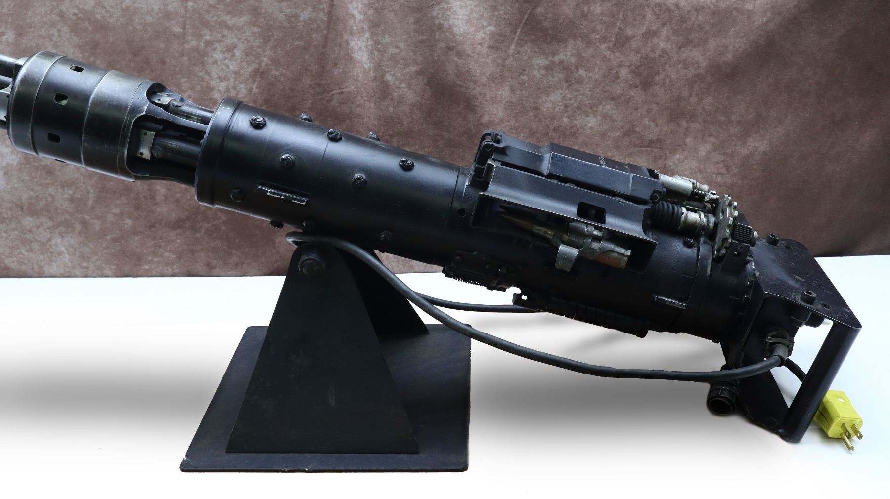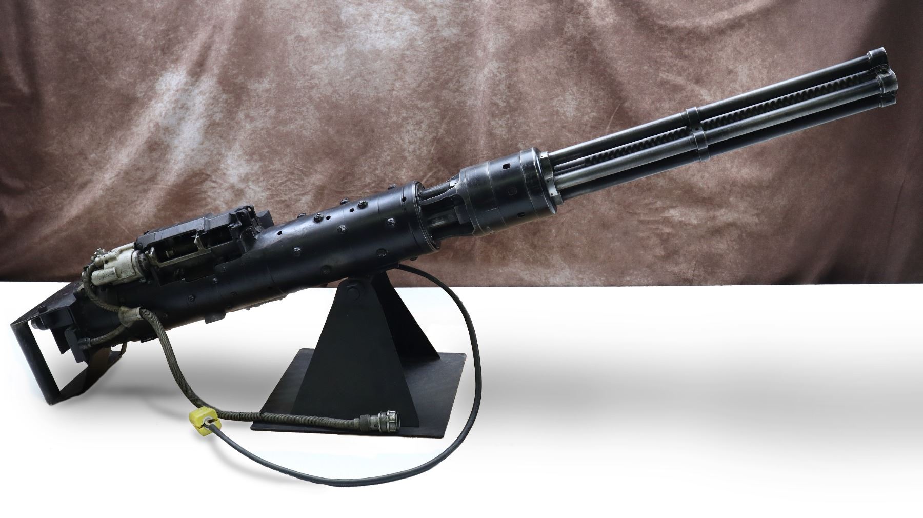 7+/10. RUSSIAN MILITARY. MODEL: Y AK-B GATLING GUN. CALIBER: 12.7 X 108MM. COMES WITH MOUNT. THIS DEACT IS A MODERN DEACTIVATION, NOTHING MOVES, CANNOT BE DISASSEMBLED. NO SIGHTS, FOUR BARRELS, BLACK PAINTED FINISH, HAS FEED MECHANISM ON TOP WITH SMALL MOTOR AND ELECTRICAL CABLES. REPLACED REAR SPADE GRIPS WITH ELECTRICAL CABLE UNSURE OF FUNCTION. HAS NEW MANUFACTURED MOUNT, WEIGHS APPROX. 100LBS. METAL FINISH SHOWS SOME SCRATCHES, HANDLING MARKS AND WEAR. ACTION: DEACTIVATED. BARREL LENGTH: 56" OAL. SERIAL # 8710575. CLASS: CANADIAN DEACTIVATED CLASS, NO LICENSE REQUIRED. CONDITION:7+/10