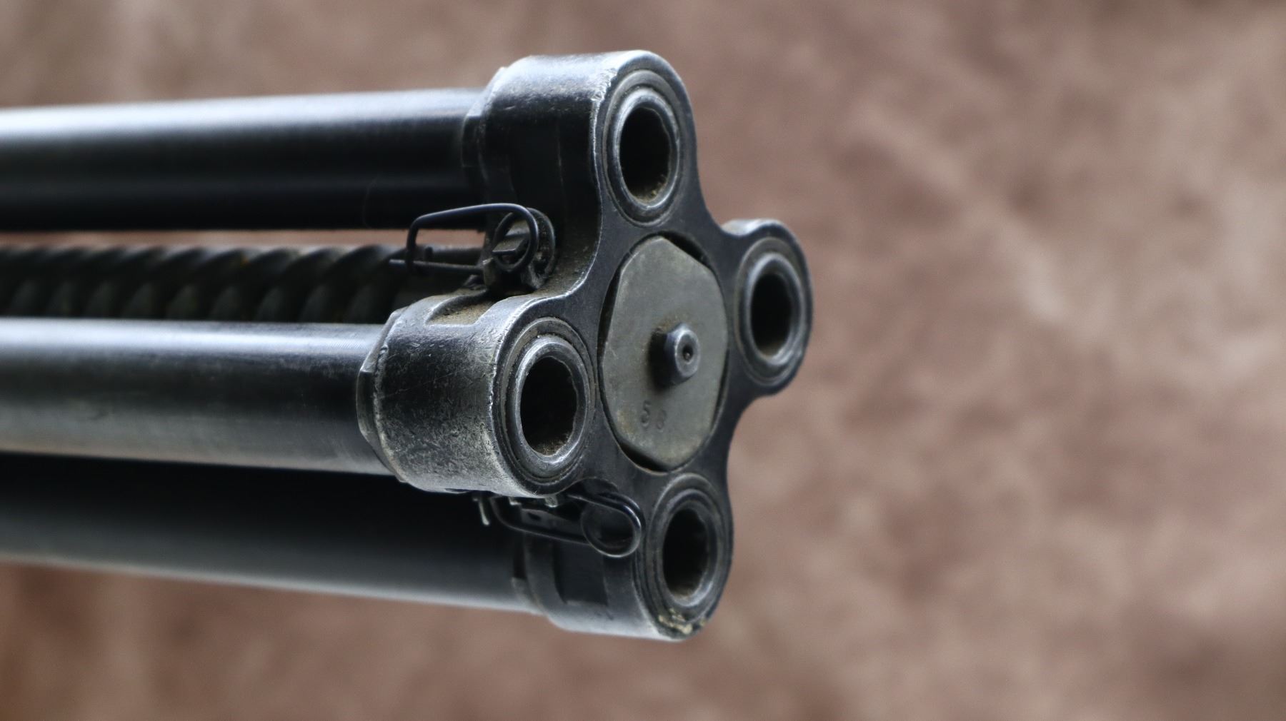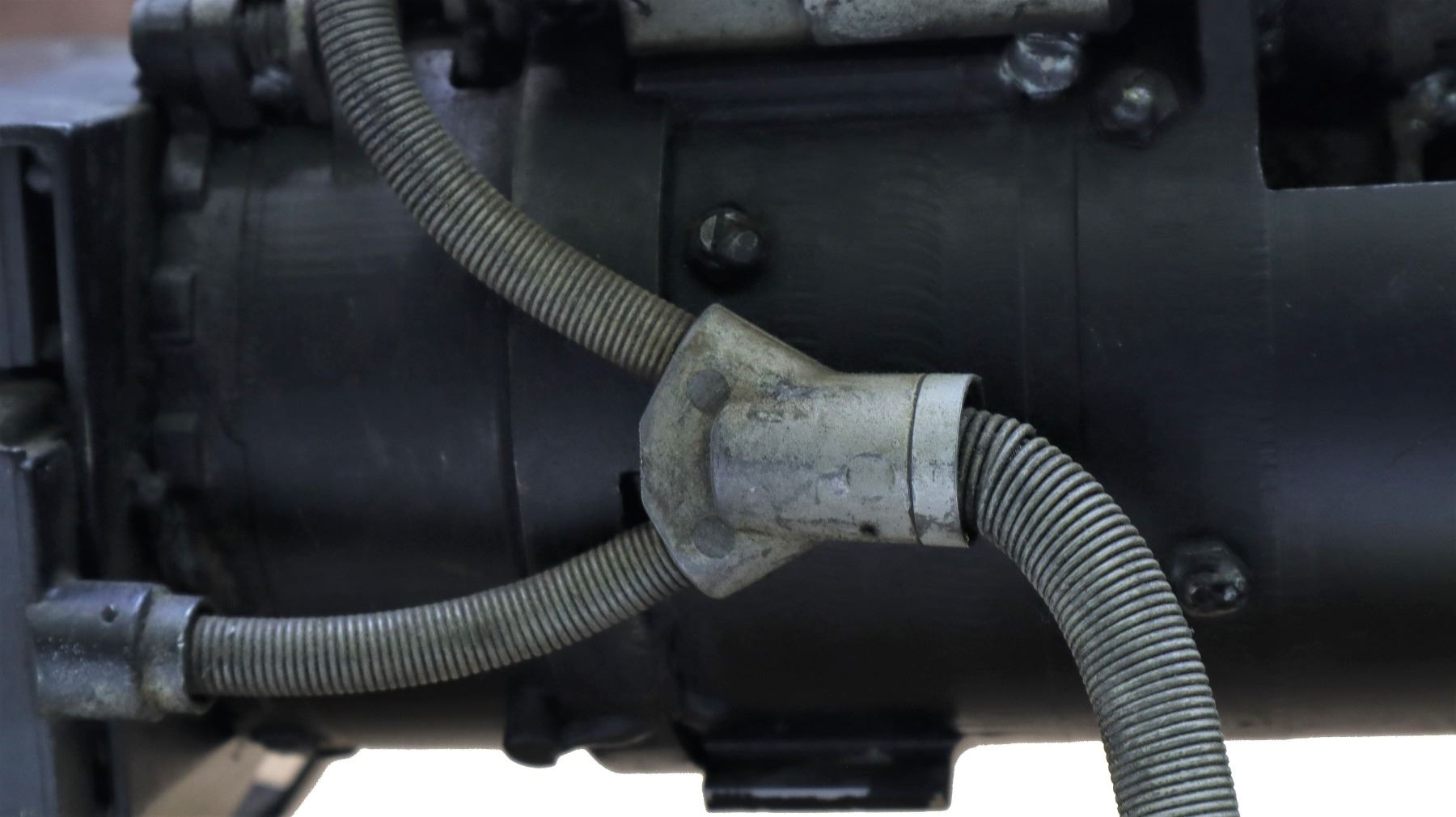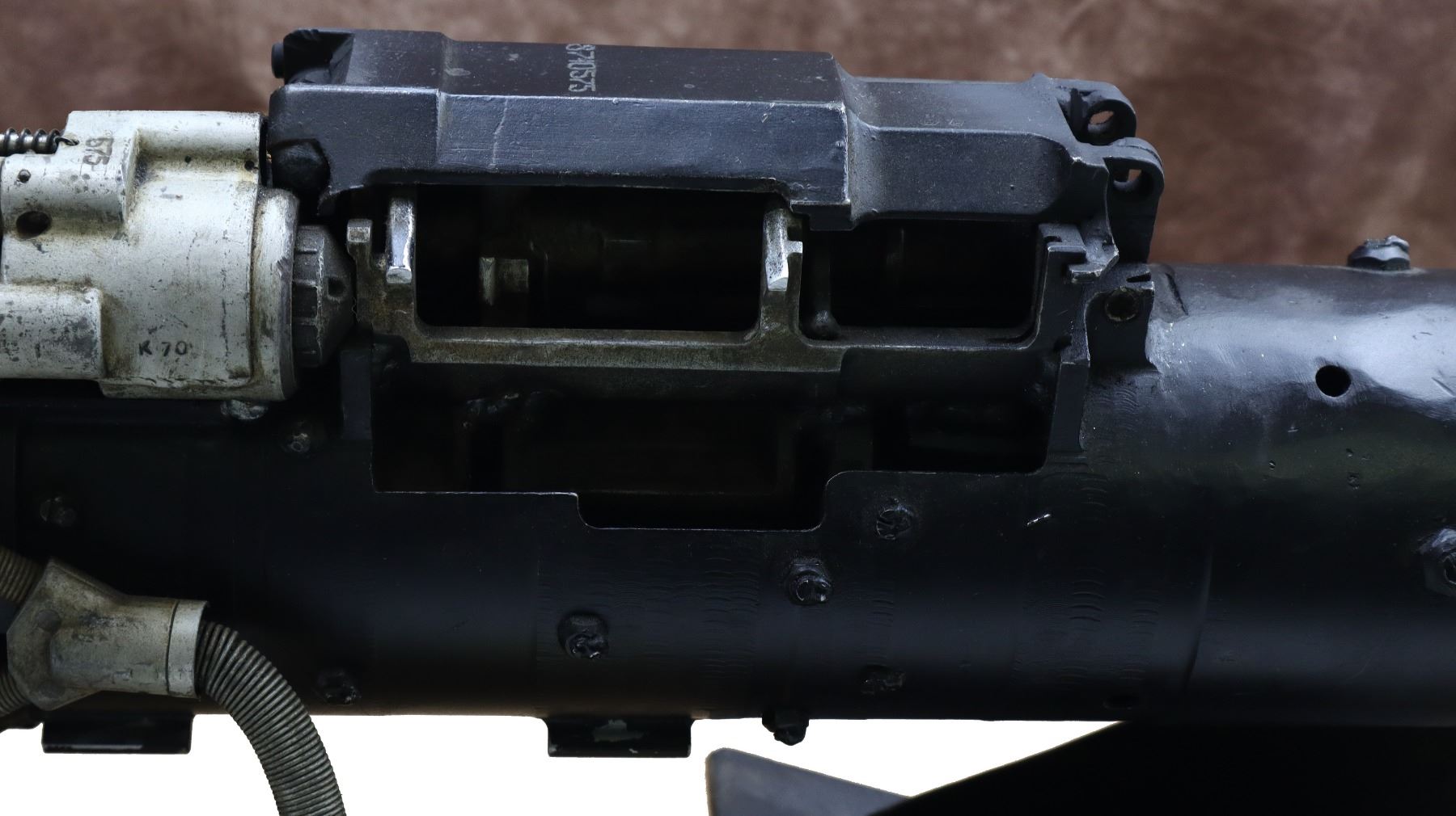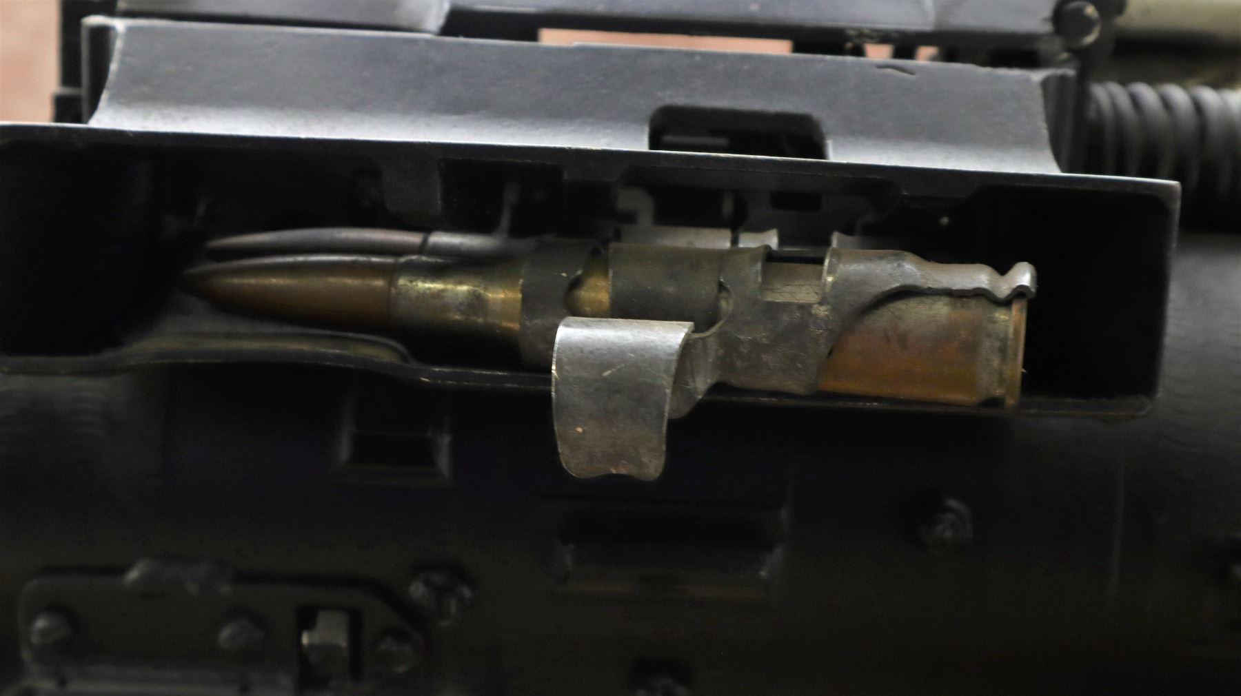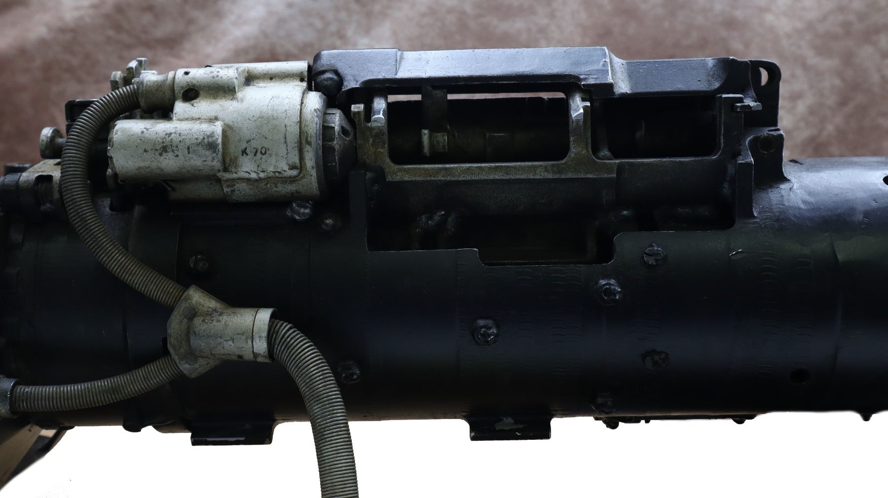 7+/10. RUSSIAN MILITARY. MODEL: Y AK-B GATLING GUN. CALIBER: 12.7 X 108MM. COMES WITH MOUNT. THIS DEACT IS A MODERN DEACTIVATION, NOTHING MOVES, CANNOT BE DISASSEMBLED. NO SIGHTS, FOUR BARRELS, BLACK PAINTED FINISH, HAS FEED MECHANISM ON TOP WITH SMALL MOTOR AND ELECTRICAL CABLES. REPLACED REAR SPADE GRIPS WITH ELECTRICAL CABLE UNSURE OF FUNCTION. HAS NEW MANUFACTURED MOUNT, WEIGHS APPROX. 100LBS. METAL FINISH SHOWS SOME SCRATCHES, HANDLING MARKS AND WEAR. ACTION: DEACTIVATED. BARREL LENGTH: 56" OAL. SERIAL # 8710575. CLASS: CANADIAN DEACTIVATED CLASS, NO LICENSE REQUIRED. CONDITION:7+/10