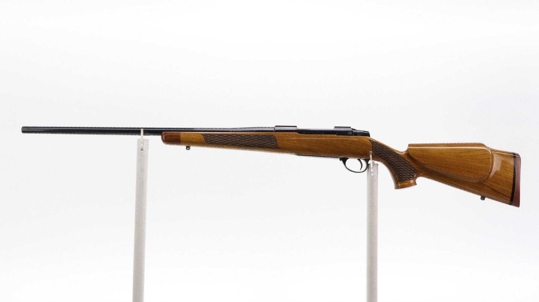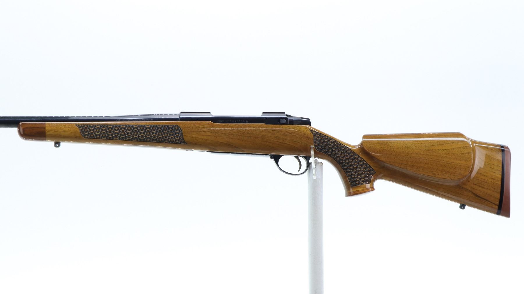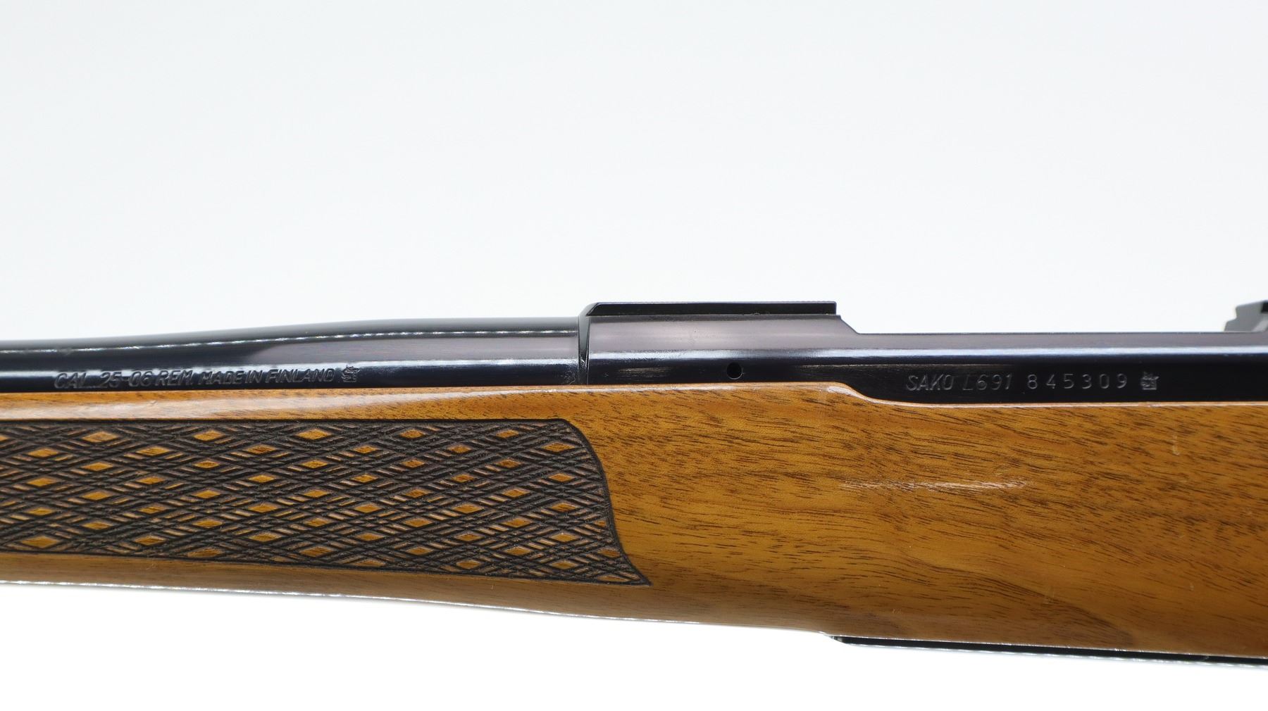 7+/10. SAKO. MODEL: L691. CALIBER: .25-06 REM. BORE IS EXCELLENT. NO SIGHTS, TAPERED ROUND BARREL, POLISH BLUED FINISH, RECEIVER HAS INTEGRAL SCOPE BASES, SMOOTH BOLT KNOB. ONE PIECE WOOD STOCK, ROSEWOOD FOREARM AND PISTOL GRIP CAPS, CHECKERED FOREARM AND PISTOL GRIP, CHEEK REST, RED RUBBER RECOIL PAD, ENGRAVED TRIGGER GUARD AND HINGED FLOOR PLATE, SWIVEL STUDS, BOTTOM OF BARREL ETCHED IMP.D BY STOEGER SHACKENSACK NJ. METAL FINISH SHOWS SOME SCRATCHES, HANDLING MARKS AND WEAR. STOCK SHOWS SOME MARKS, SCRATCHES AND WEAR. ACTION: BOLT ACTION RIFLE. BARREL LENGTH: 22.75". SERIAL# 845309. CONDITION: 7+/10. CLASS: CANADIAN NON RESTRICTED