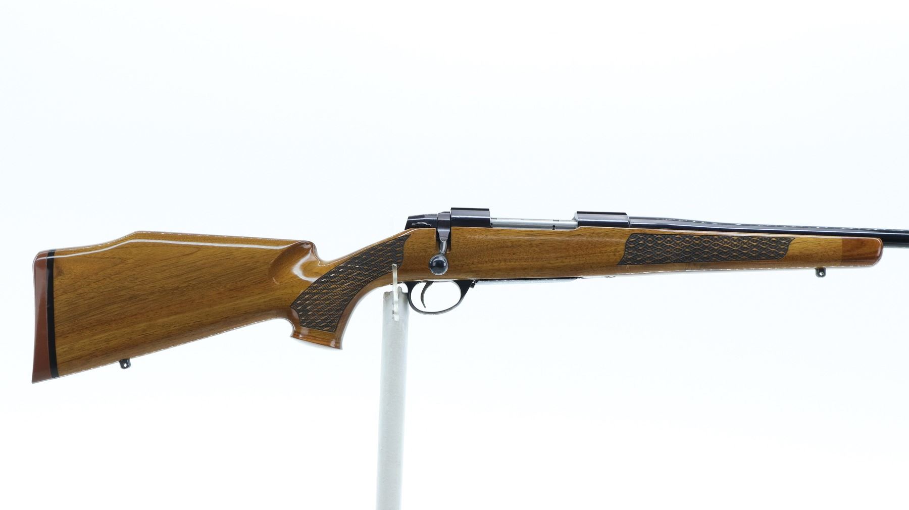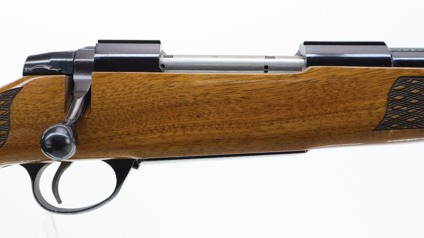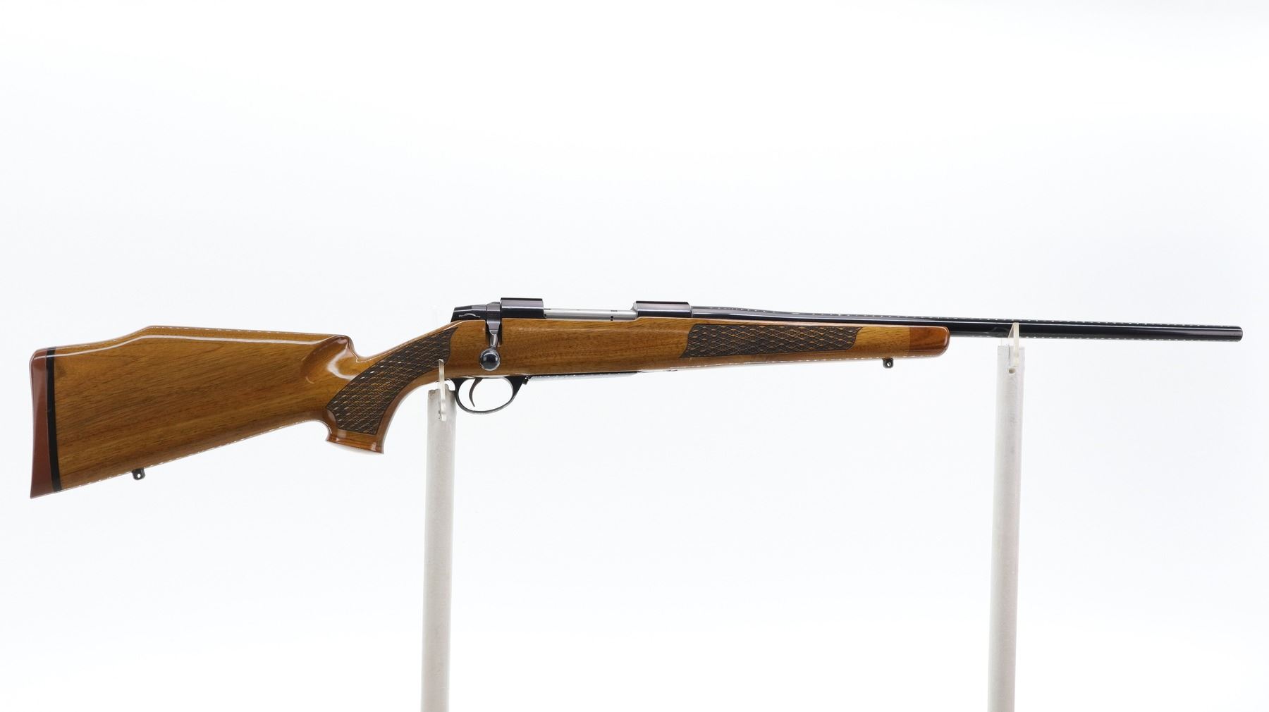 7+/10. SAKO. MODEL: L691. CALIBER: .25-06 REM. BORE IS EXCELLENT. NO SIGHTS, TAPERED ROUND BARREL, POLISH BLUED FINISH, RECEIVER HAS INTEGRAL SCOPE BASES, SMOOTH BOLT KNOB. ONE PIECE WOOD STOCK, ROSEWOOD FOREARM AND PISTOL GRIP CAPS, CHECKERED FOREARM AND PISTOL GRIP, CHEEK REST, RED RUBBER RECOIL PAD, ENGRAVED TRIGGER GUARD AND HINGED FLOOR PLATE, SWIVEL STUDS, BOTTOM OF BARREL ETCHED IMP.D BY STOEGER SHACKENSACK NJ. METAL FINISH SHOWS SOME SCRATCHES, HANDLING MARKS AND WEAR. STOCK SHOWS SOME MARKS, SCRATCHES AND WEAR. ACTION: BOLT ACTION RIFLE. BARREL LENGTH: 22.75". SERIAL# 845309. CONDITION: 7+/10. CLASS: CANADIAN NON RESTRICTED