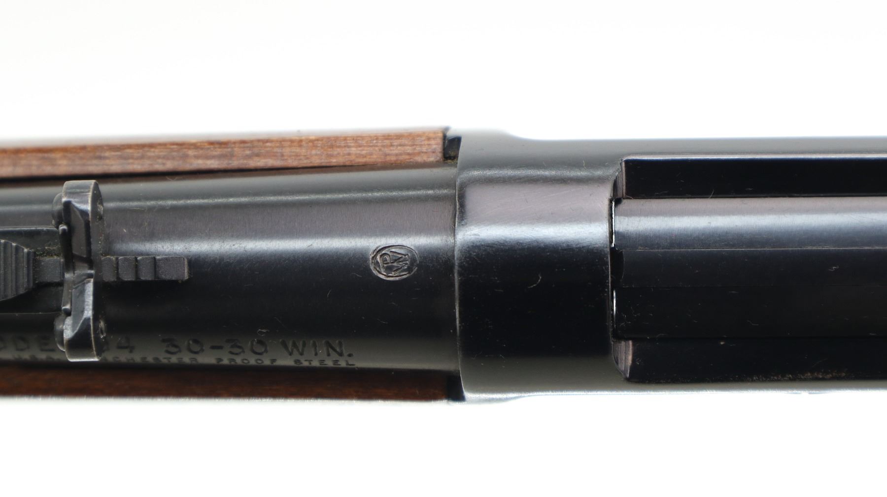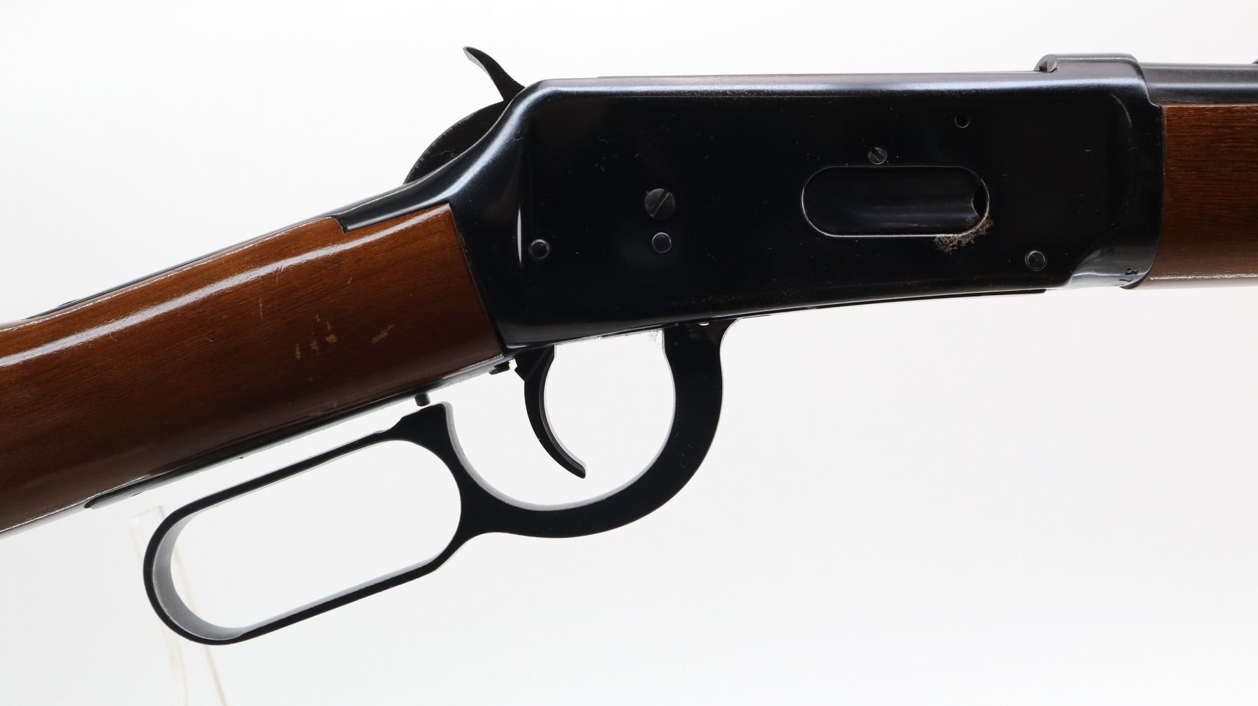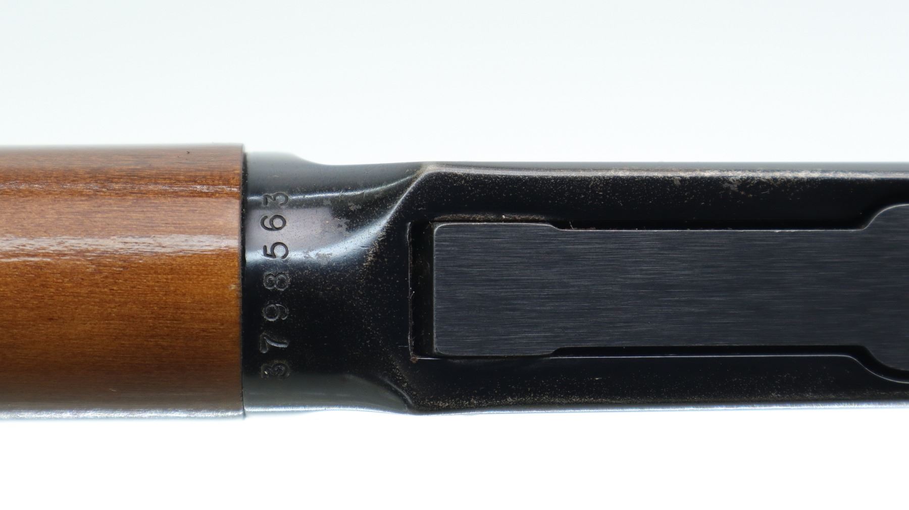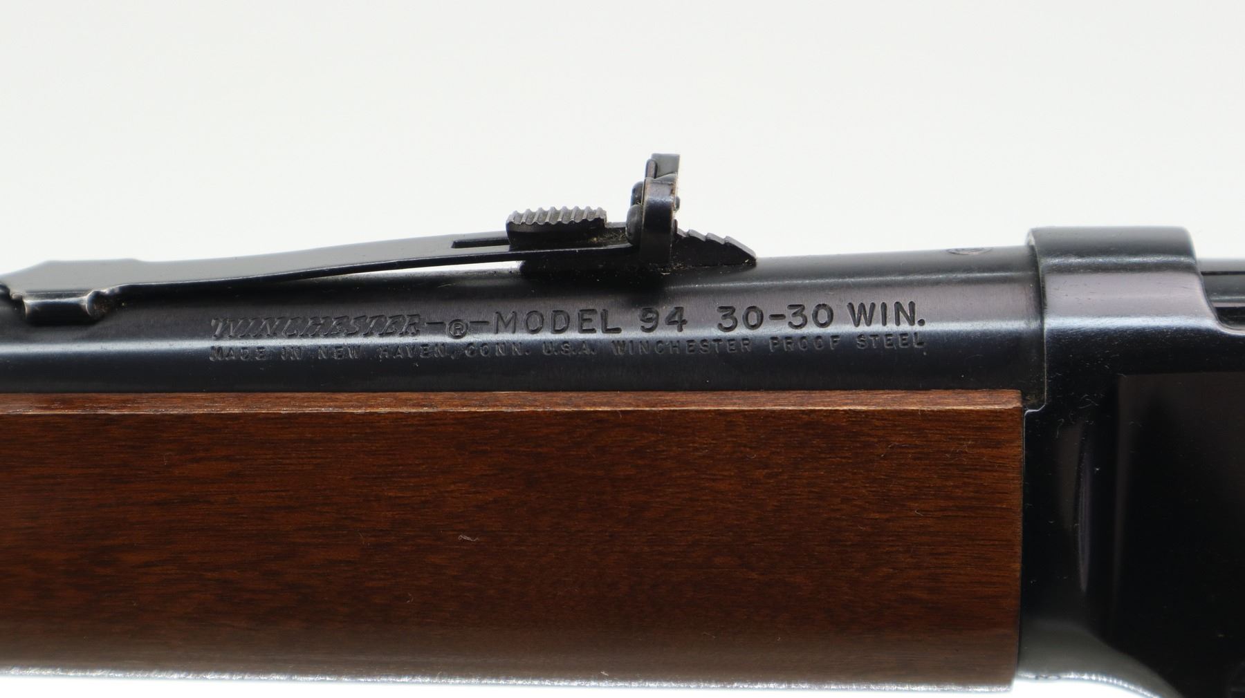 7+/10. WINCHESTER. MODEL: 94. CALIBER: .30-30 WIN. COMES WITH SOFT CASE. BORE IS EXCELLENT. BLADE FRONT SIGHT WITH HOOD AND RAMP, ADJUSTABLE U NOTCHED REAR SIGHT, BLUED FINISH, GROOVED SPUR HAMMER. TWO PIECE SMOOTH WOOD STOCKS, STRAIGHT GRIP, CHECKERED BLACK POLYMER BUTT PLATE, FULL LENGTH MAG TUBE. METAL FINISH SHOWS A FEW LIGHT PITTED SPOTS, SCRATCHES, HANDLING MARKS AND WEAR. STOCKS SHOW SOME MARKS AND SCRATCHES. ACTION: LEVER ACTION RIFLE. BARREL LENGTH: 20". SERIAL# 3798563. CONDITION: 7+/10. CLASS: CANADIAN NON RESTRICTED