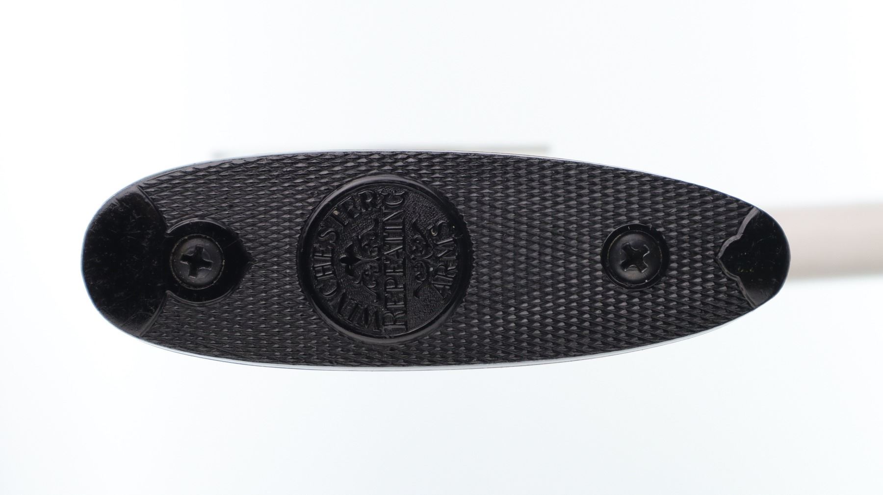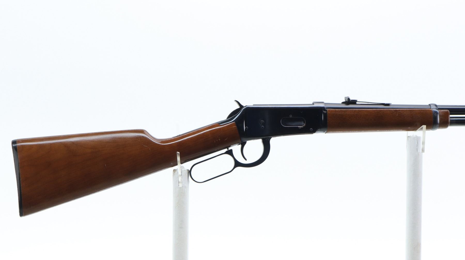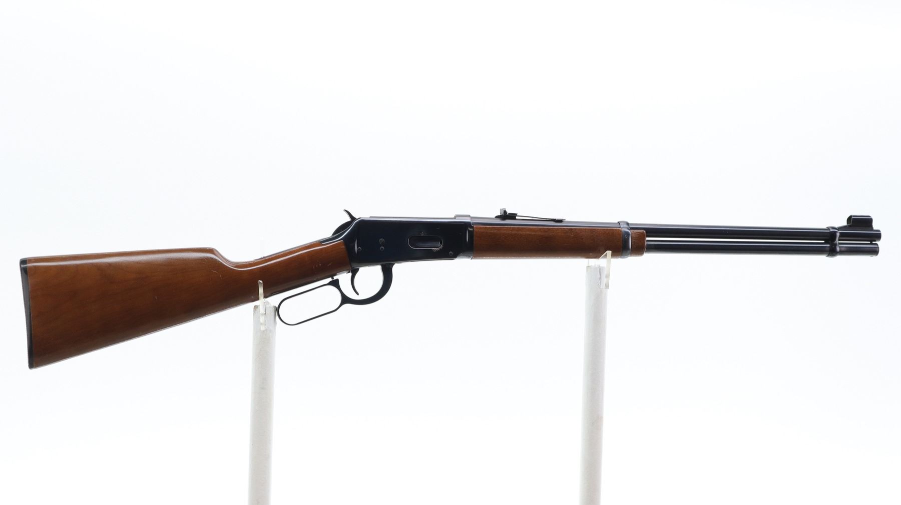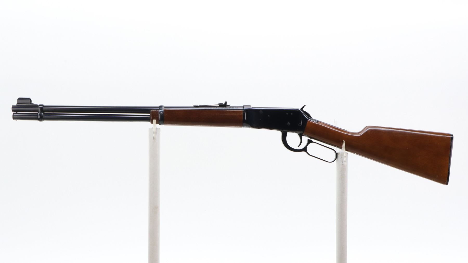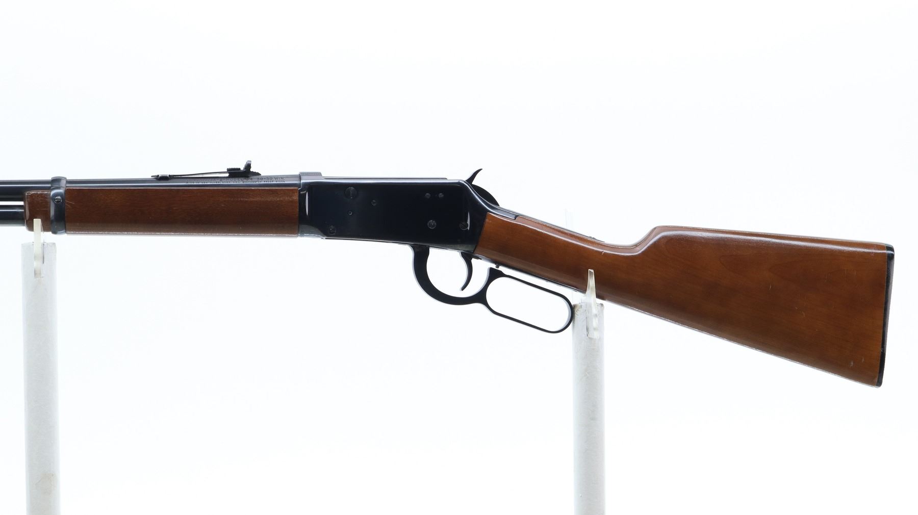 7+/10. WINCHESTER. MODEL: 94. CALIBER: .30-30 WIN. COMES WITH SOFT CASE. BORE IS EXCELLENT. BLADE FRONT SIGHT WITH HOOD AND RAMP, ADJUSTABLE U NOTCHED REAR SIGHT, BLUED FINISH, GROOVED SPUR HAMMER. TWO PIECE SMOOTH WOOD STOCKS, STRAIGHT GRIP, CHECKERED BLACK POLYMER BUTT PLATE, FULL LENGTH MAG TUBE. METAL FINISH SHOWS A FEW LIGHT PITTED SPOTS, SCRATCHES, HANDLING MARKS AND WEAR. STOCKS SHOW SOME MARKS AND SCRATCHES. ACTION: LEVER ACTION RIFLE. BARREL LENGTH: 20". SERIAL# 3798563. CONDITION: 7+/10. CLASS: CANADIAN NON RESTRICTED