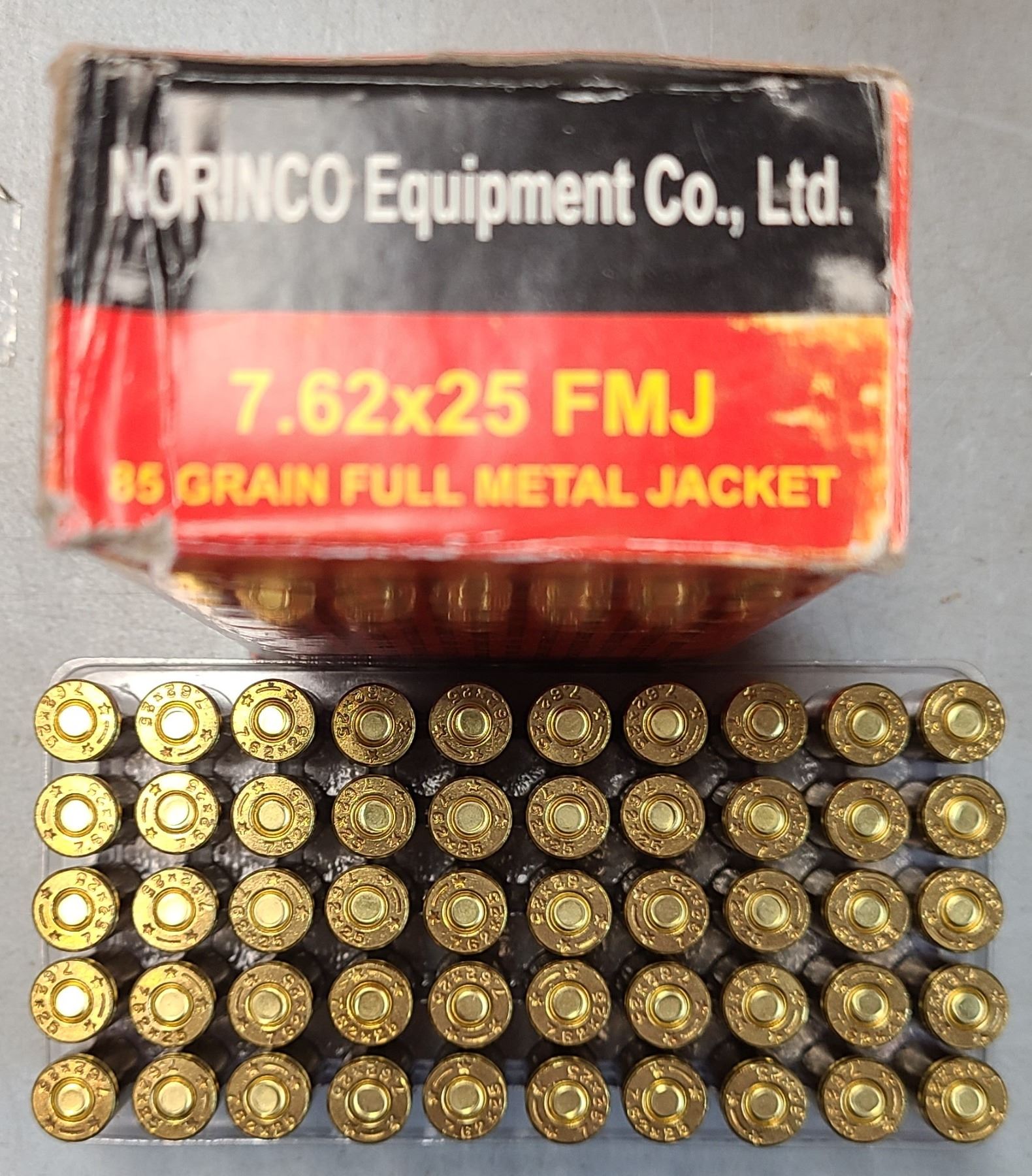 7.62 x 25 Tokarev Norinco 85 gr Round Nose Handgun Ammo - 50 rds