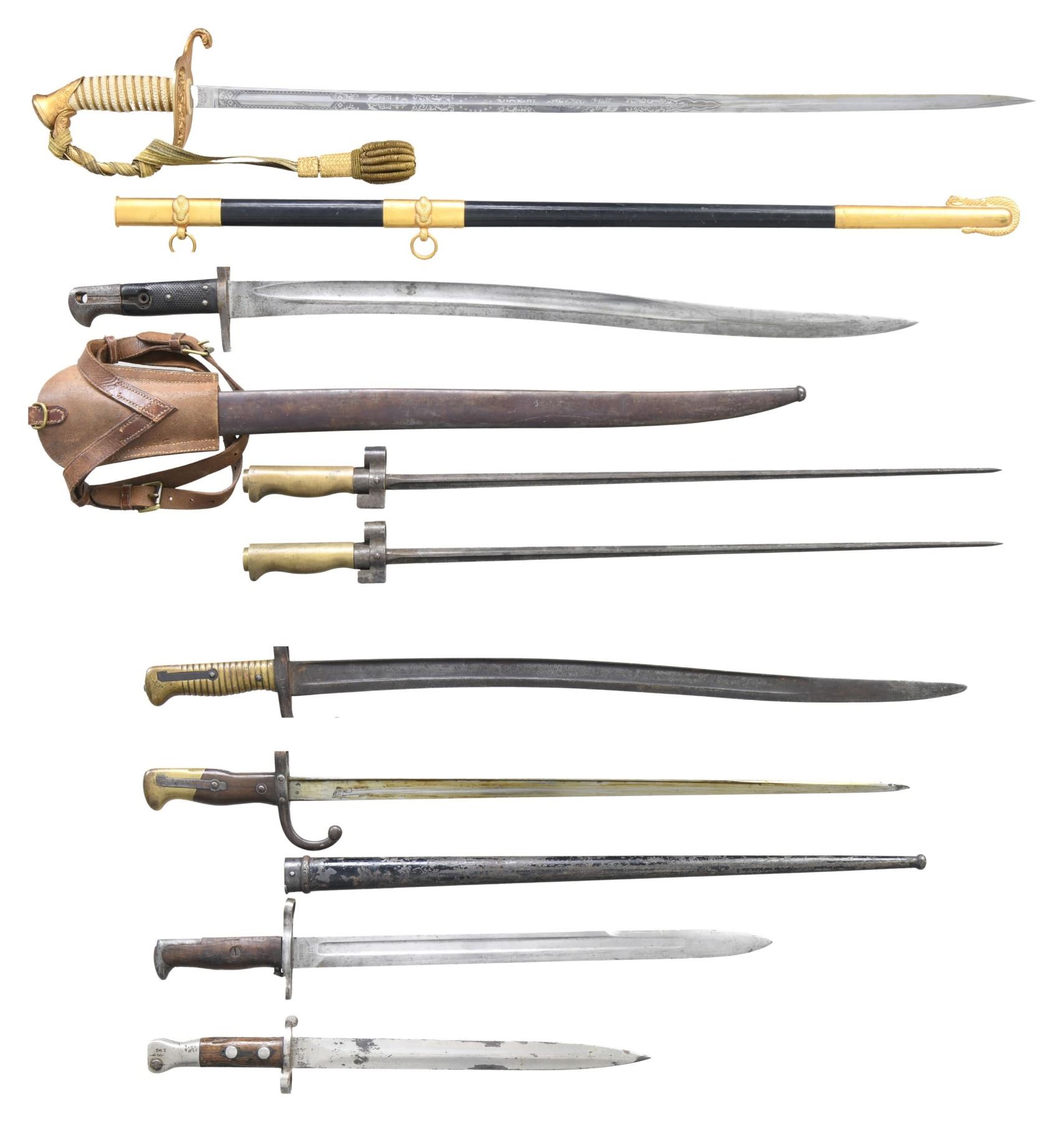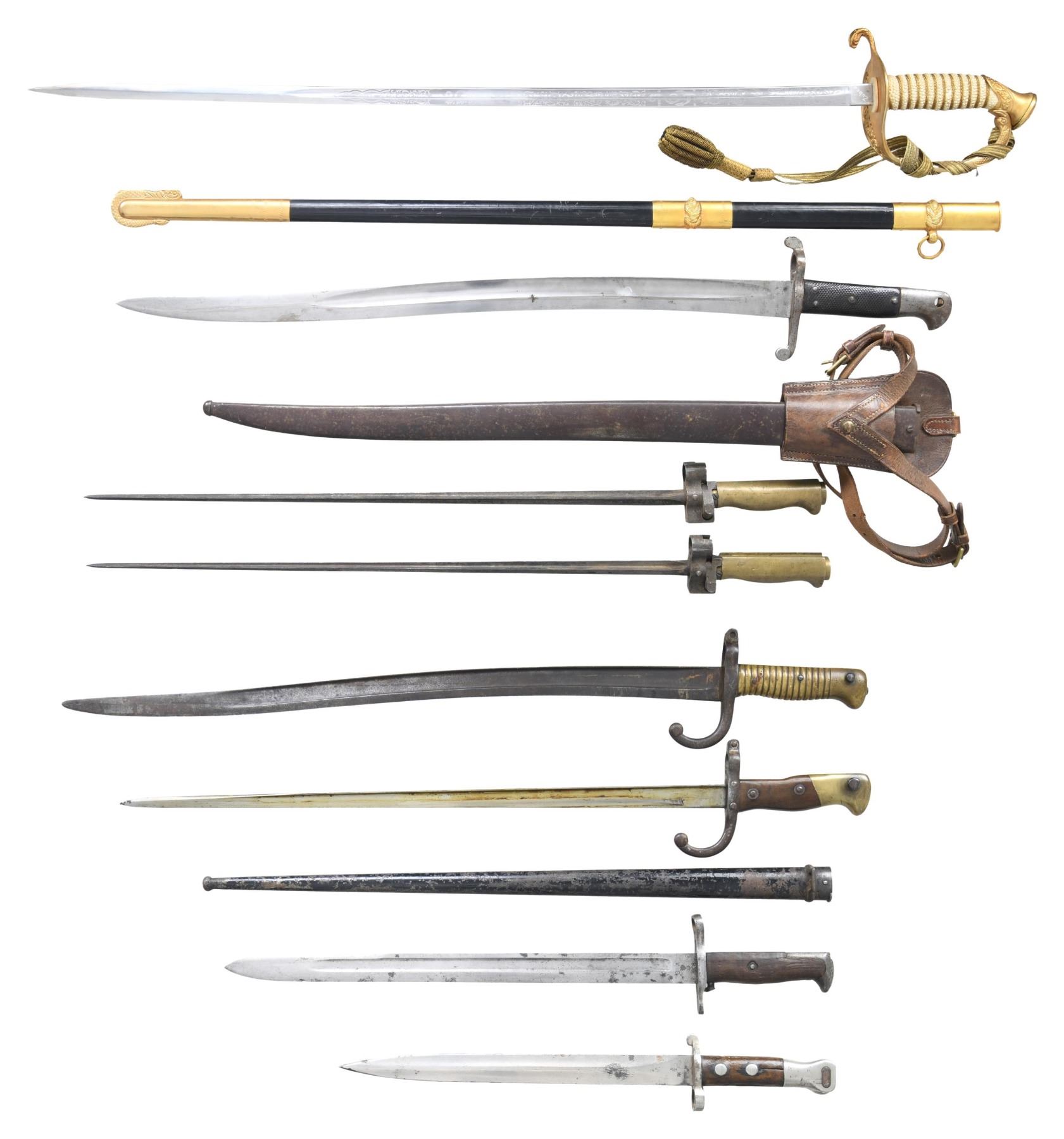 This lot includes 2 / French M1886 bayonets for the Lebel Rifle without scabbards. 1 / French M1874 Gras bayonet for the Gras rifle with scabbard. 1 / French M1866 Chasspot bayonet without scabbard. 1 / US M1905 bayonet for the Springfield rifle without scabbard. 1 / British M1888 Lee Metford bayonet without scabbard. 1 / British M1856 Enfield bayonet with a missing spring on the hilt. This bayonet has an iron scabbard and attractive brown leather frog. 1 / Post WW2 M1852 Naval officer's sword and scabbard. The sword has an etched blade and is marked "Zubco GERMANY" & "STAINLESS". Gilded hilt with a faux wire wrapped sharkskin grip and a sword knot attached. Black leather scabbard has gilded mounts, CONDITION: Bayonets show light to moderate wear except as noted. Sword shows very light wear. (02-24495-3/BF). $500-700.
