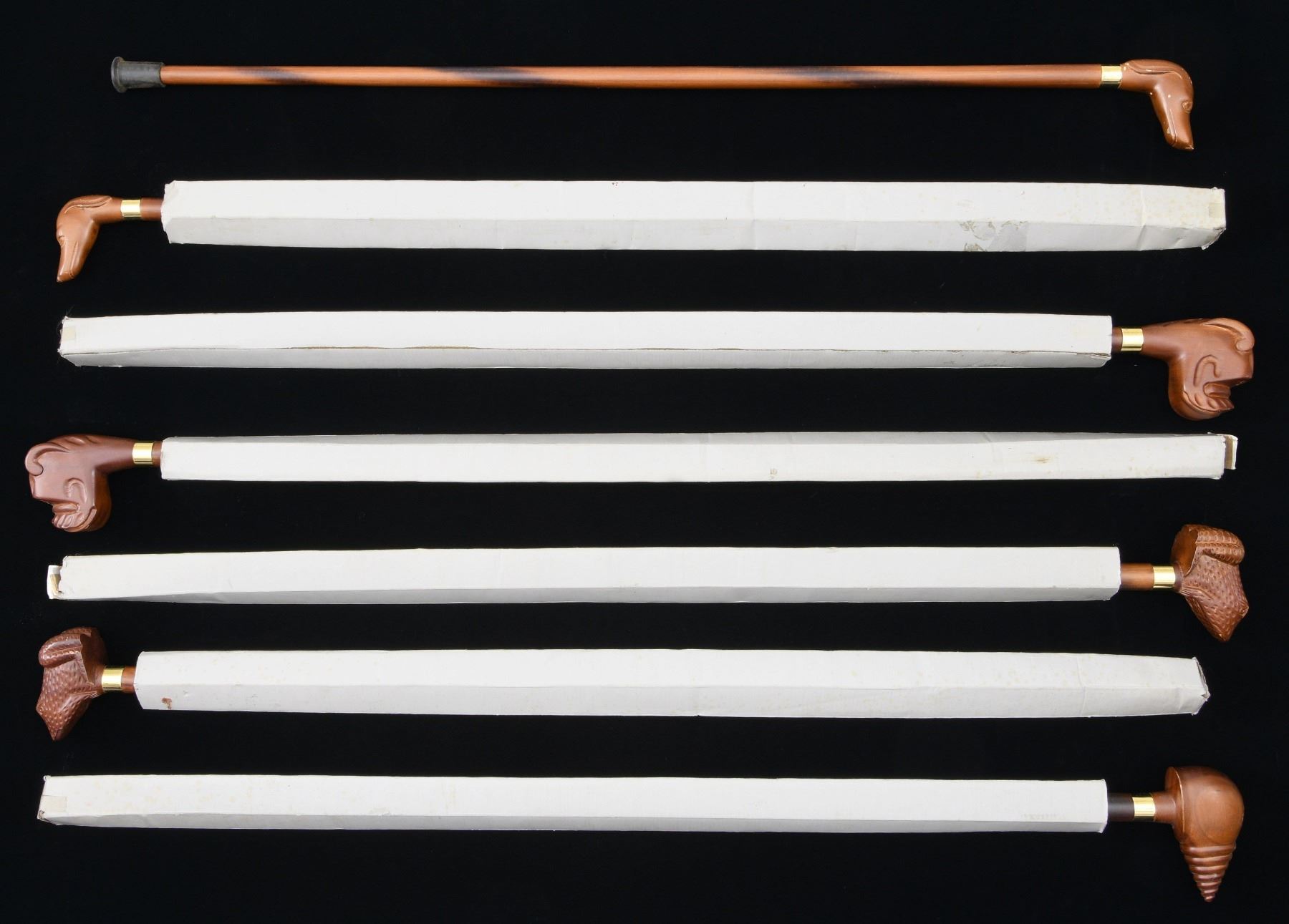 DRAKE. These carved wooden walking sticks average 36" in length and have a rubber tip at the base. The heads are carved to represent a bulldog head (2), a dog head (2), a frog (2), and a sea shell. Below the hand piece is a 5/8" gilded ferrule. CONDITION: items are new but show some scuffs and scrapes from storage wear. PROVENANCE: from the renowned collection of quality sporting arms from Lewis Drake together with inventory of Lewis Drake Associates. (02-23565-13/BF). $250-500.