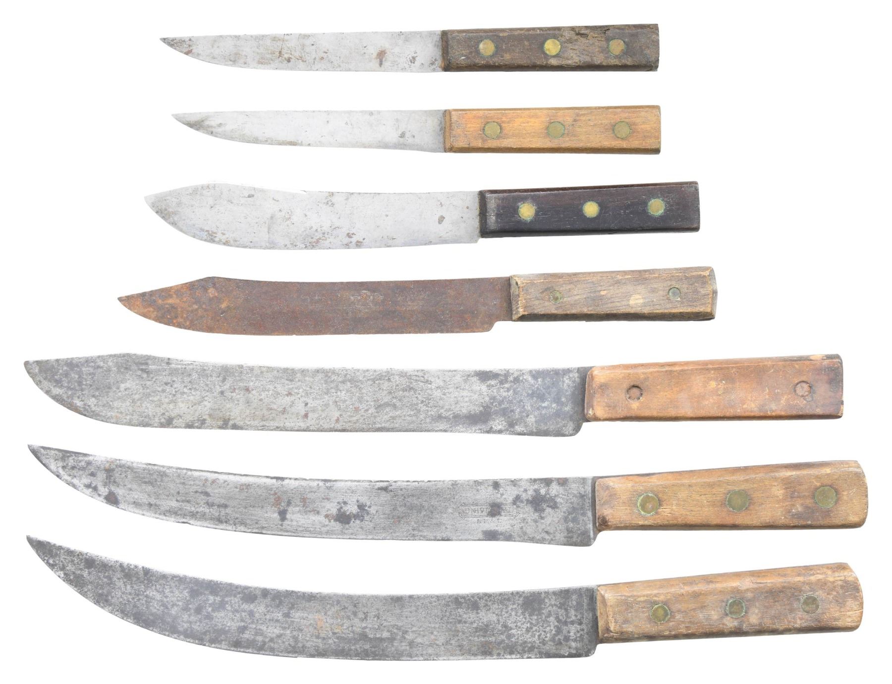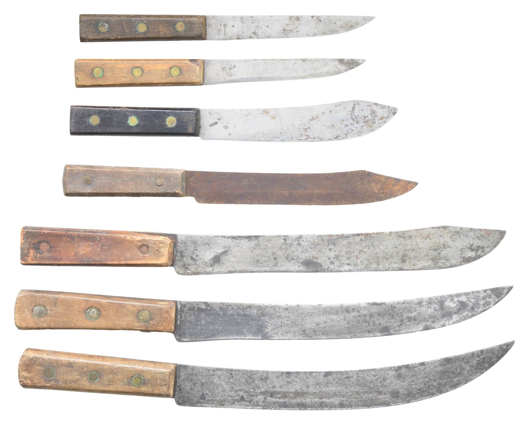 This lot contains 7 large butchering knives that the consignor states were buffalo skinning knives from the early western expansion. The knives range in length from 17 1/2" to 10 3/8" and 6 are unmarked. 1 knife is marked "UNIVERSAL L. F. & C.". CONDITION: all knives show expected wear and use. (02-24565/BF). $200-300.