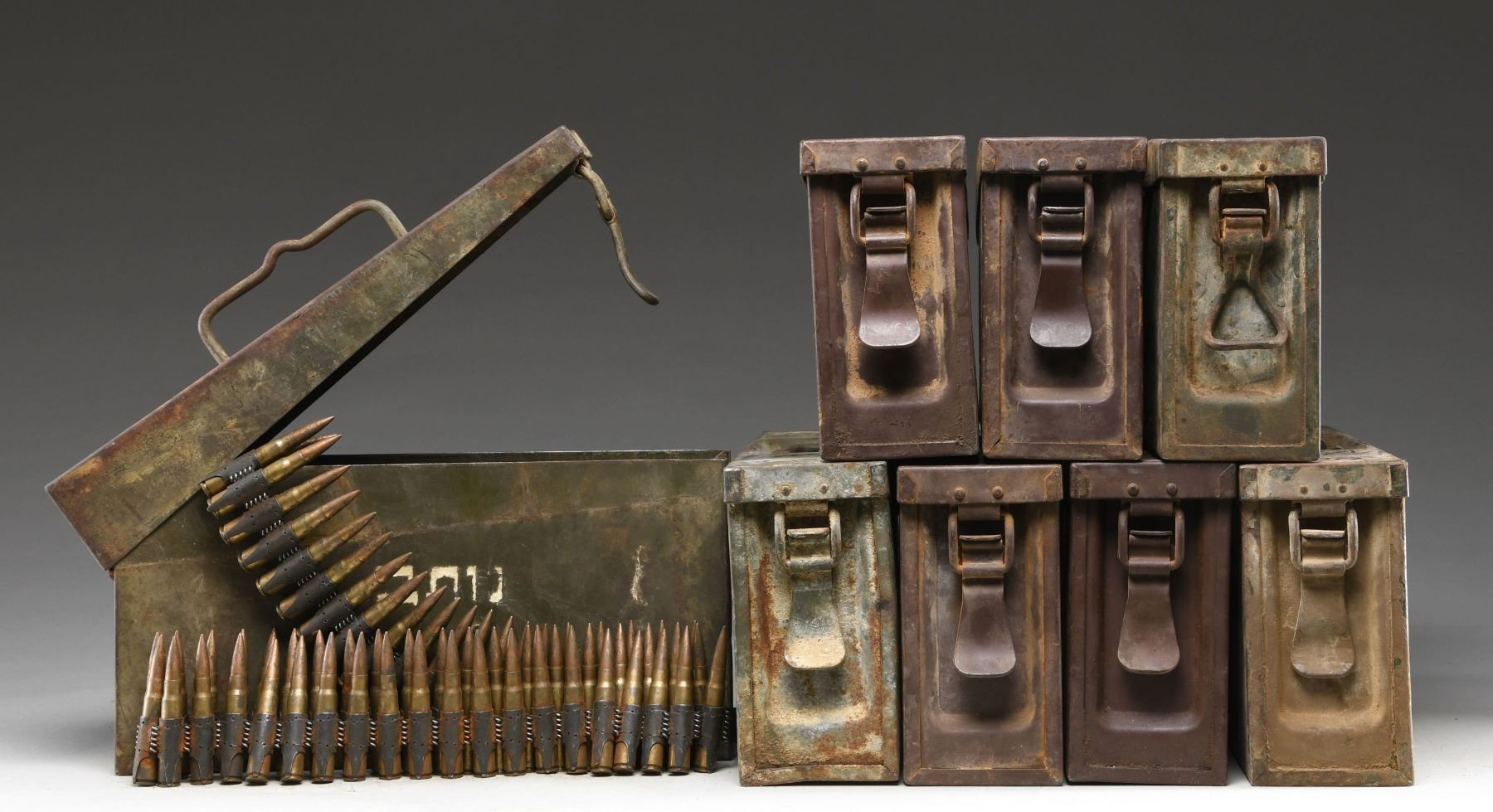 Selection of 500+ rds. of 8mm Mauser ammo on an assortment of steel & cloth British BESA Machine Gun belts, German MG34 / 42 belts & Czech ZB37 belts. Stored in 8 steel ammo cans. Brass cased ammo headstamps pulled as samples include "FNM 71-13, FNM 71-14 & FNM 71-15. CONDITION: Cases display different modes of tarnishing. Ammo cans remain functional, painted brown or green. (02-24270-12/JZ). MODERN. $200-400.