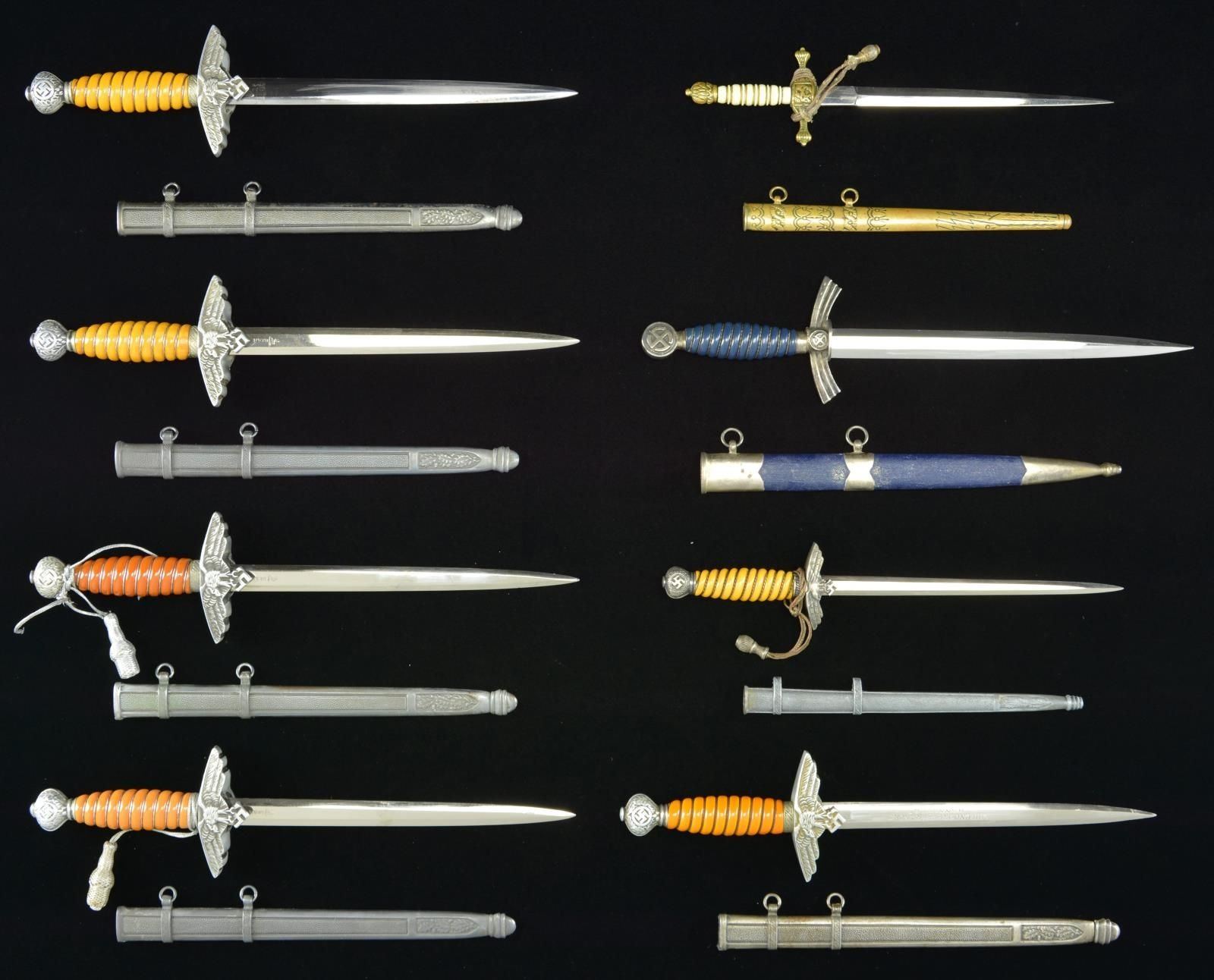 SCABBARDS. This fascinating group of 8 miniature daggers includes 1 first model Luftwaffe dagger measuring 9 7/8" overall with a plain blade and blue leather grip and scabbard body. / 1 Imperial Navy dagger measuring 7 3/8" overall with a plain blade and white grip that includes a miniature knot. / 1 Second model Luftwaffe dagger measuring 9 1/2" overall with a blade that is etched "OHLENDORF & FRANCKE HANNOVER". Orange wire-wrapped grip with aluminum fittings. / 4 Second model Luftwaffe daggers measuring 9 1/2" overall with plain blades. Wire-wrapped grips are various shades of yellow to dark orange. Two daggers have partial knots attached. / 1 Second model Luftwaffe dagger measuring 7 3/4" overall with a blade that is etched "E. & F. HORSTER SOLINGEN". Wire-wrapped deep yellow grip and partial knot attached. CONDITION: all blades show primarily factory polish. Scabbards are a bit oxidized but quite solid. Silver fittings on first model Luftwaffe have a pleasing dark tarnish. PROVENANCE: from the lifelong collection of Glen E. Mattox. (02-18313/BF). $1,000-1,400.