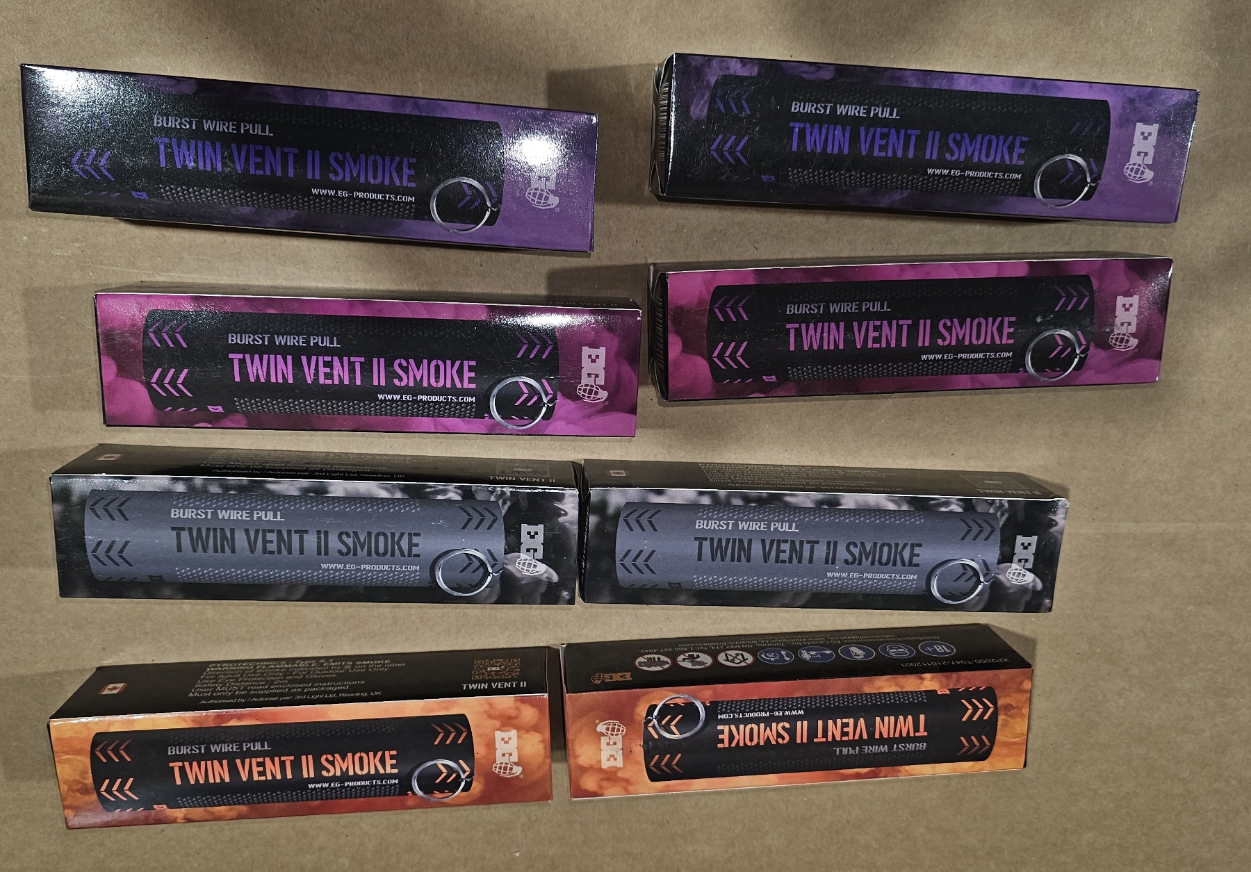 2 orange, 2 black, 2 pink and 2 purple