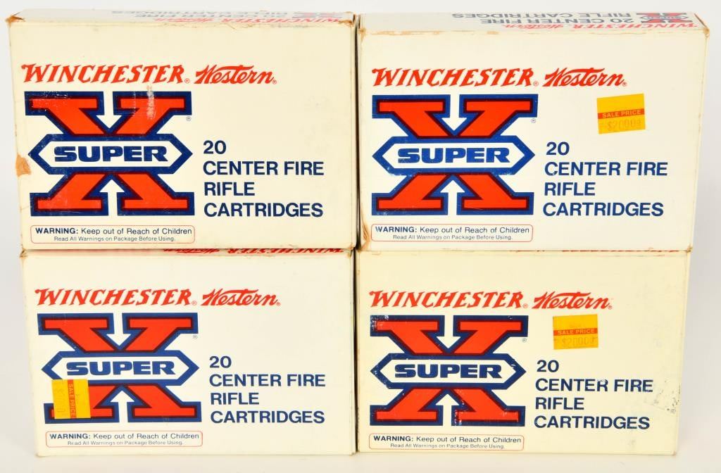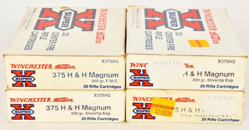 Up for auction are 80 rounds of Winchester .375 H&H Mag ammunition. This lot includes 40 rounds of 300-grain Silvertip expanding bullets, 20 rounds of 270-grain soft points, and 20 rounds of full metal case (FMC) bullets.