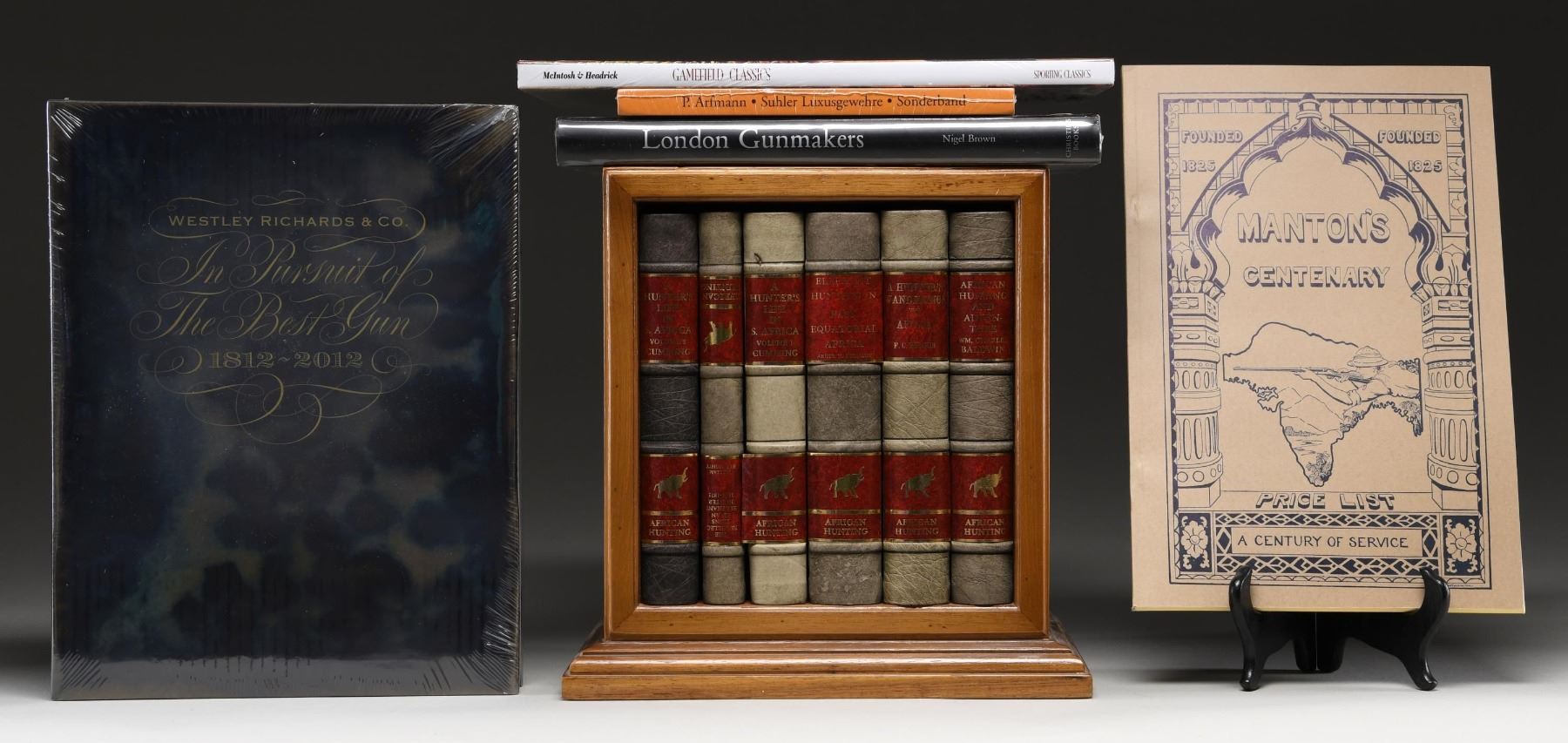 EARLY GUNMAKERS & AFRICAN HUNTING. Lot contains books consisting of: No.1: "The Early Purdeys" by Unsworth. Signed copy. / No.2: "Westley Richards & Co. In Pursuit of the Best Gun" by Musson. Sealed in factory shipping box. / No.3: "London Gunmakers" by Brown. In sealed wrapper. / No.4: "Suhler Luxusgewehre" by Arfman. In sealed wrapper. / No.5: Six volume set. "African Hunting Reprint Series by, Books of Zimbabwe, Bulawayo, 1981" in a wooden display case. "A Hunter's Life in Africa Volume 1 & 2" by Cumming, "The Recollections of an Elephant Hunter 1864-1875" by William Finaughty, "Hunter's Wanderings in Africa" by F. C. Selous, "Elephant Hunting in East Equatorial Africa" by Neumann & "African Hunting and Adventure" by WM. Charles Baldwin. / No.6: "Gamefield Classics" by McIntosh & Hendrick. In sealed wrapper. / No.6: "Manton's Centenary". Reprinted catalogue. CONDITION: books are in excellent condition w/ very little handling wear. Wooden case has very little handling wear, but retains remnants of paper wrapping. PROVENANCE: from the renowned collection of quality sporting arms from Lewis Drake together with inventory of Lewis Drake Associates. (02-23570-7/RW). NON-GUN. $700-900.