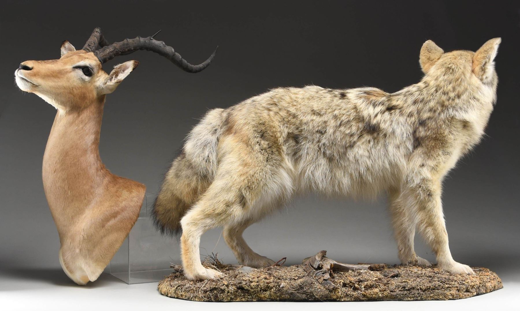 1) Coyote. This full mount coyote, or canis latrans, stands 26 1/2" tall from the foot to the tip of the ear. This North American native has yellow/green eyes and a gray/blond coat with darker flecks. The coyote is known by several other names such as Prairie Wolf, American Jackal, and Brush Wolf. The base is approx. 39" x 15" and simulates a forest floor. CONDITION: the mount shows very light wear and has no notable damage. 2) Impala. This Impala head mount measures approx. 33 1/2" x 20". This native of Eastern and Southern Africa has a tan coat with long ridged horns at the top of its head. This medium sized antelope, known as Aepyceros melampus, is the only surviving member of the genus Aepyceros. CONDITION: the mount shows very light overall wear with no damage. PROVENANCE: from the renowned collection of quality sporting arms from Lewis Drake together with inventory of Lewis Drake Associates. (02-23536/BF). $300-600.