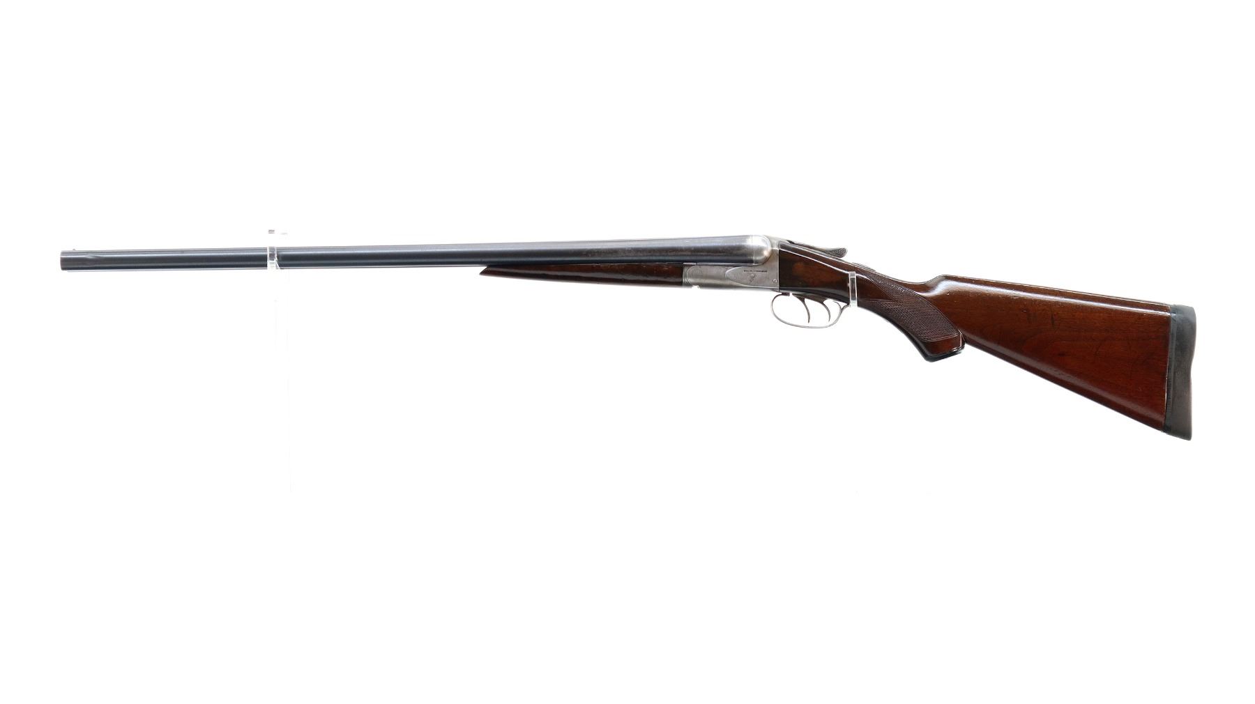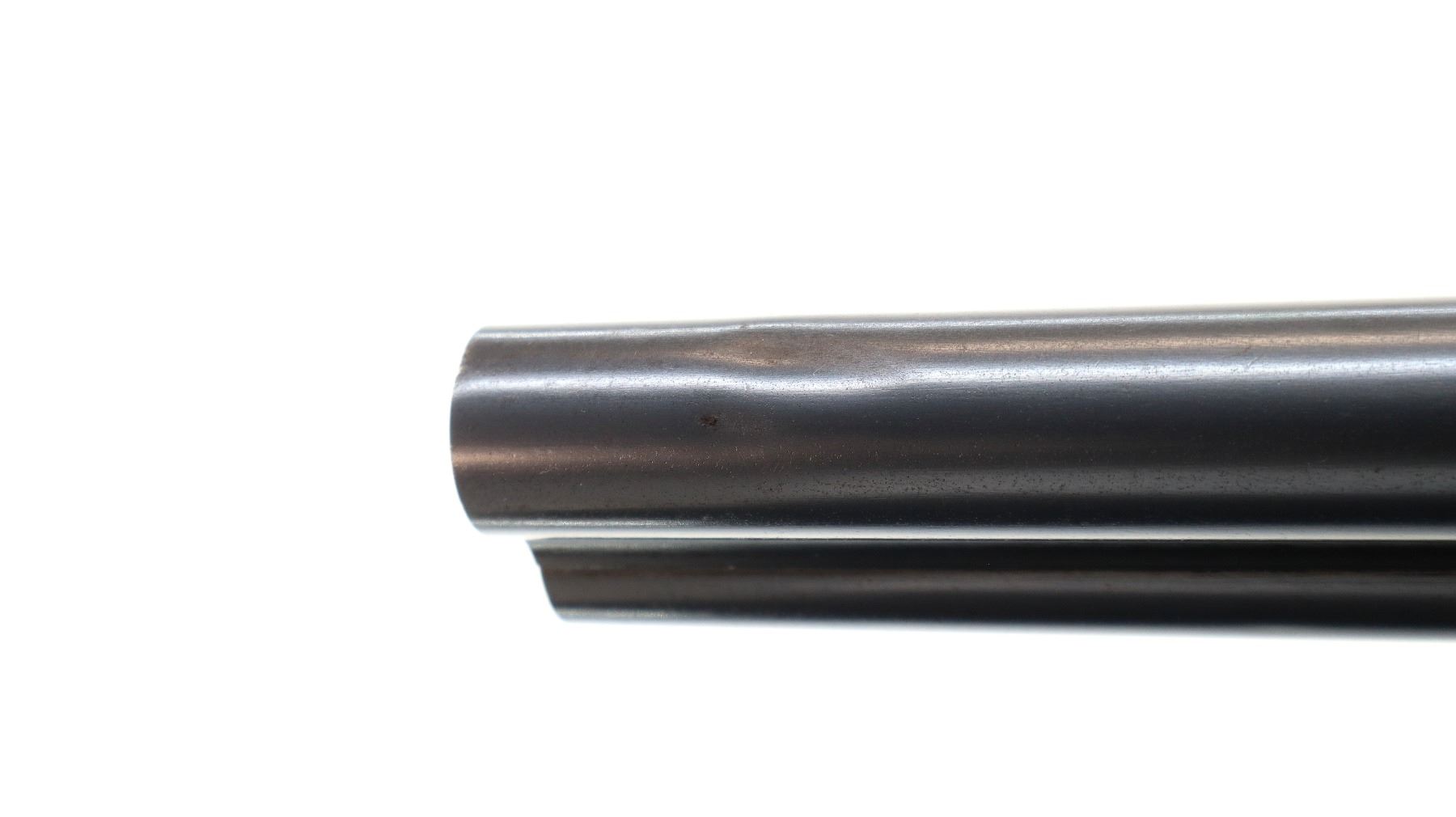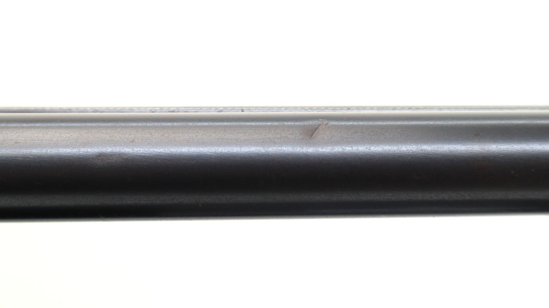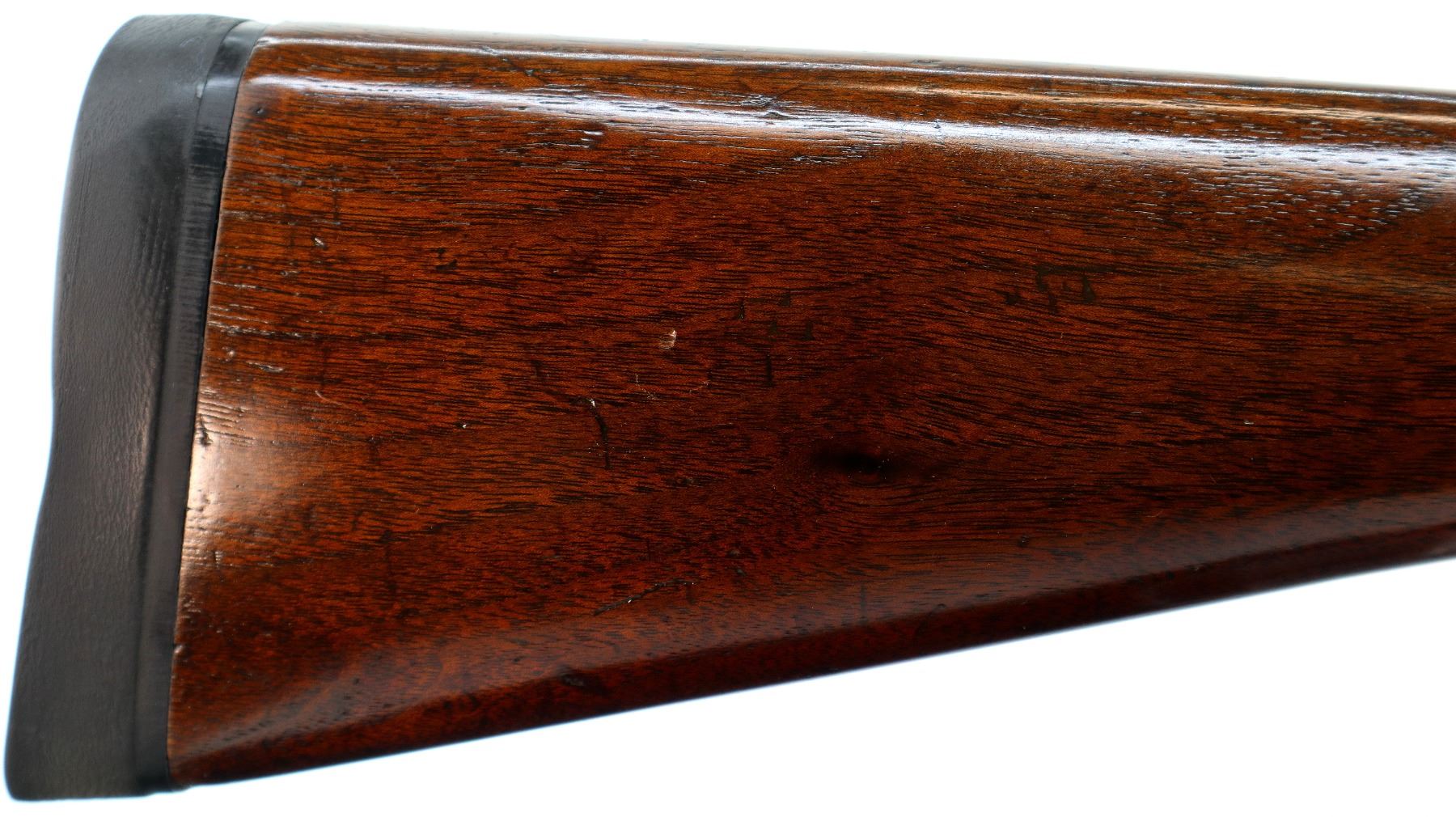 Main Description: Brass bead, blued barrels with raised rib that chime and are tight on face, border engraved receiver, manual safety, extractor, double triggers. Two piece wood stocks, checkered pistol grip chipped, cracked and repaired behind receiver, black rubber recoil pad, grip cap.