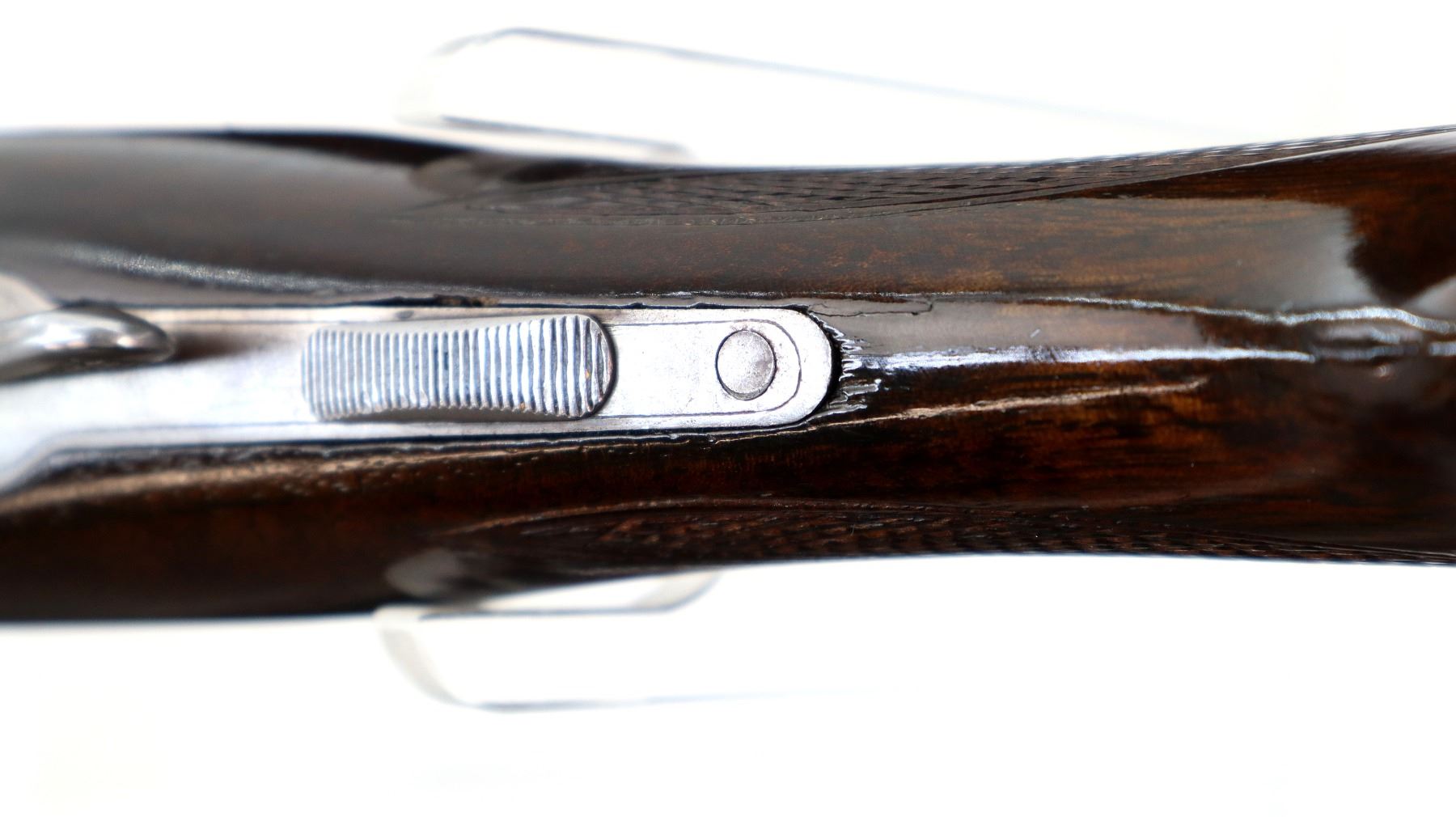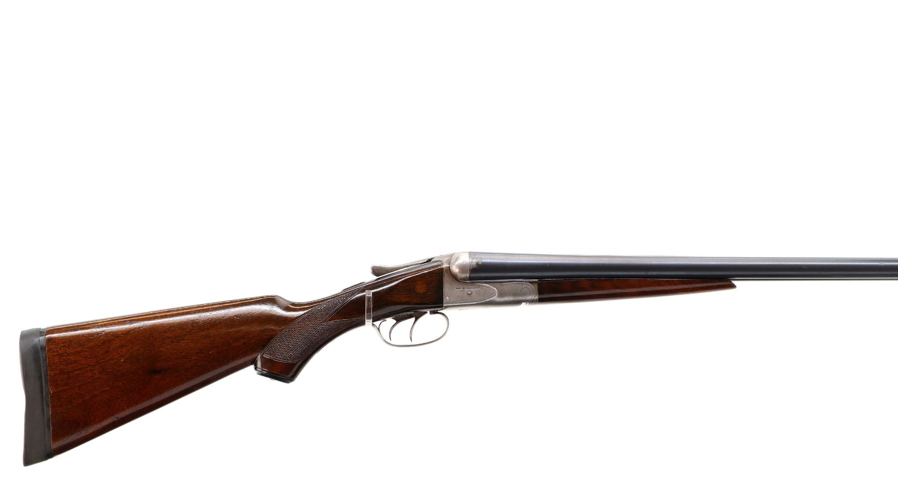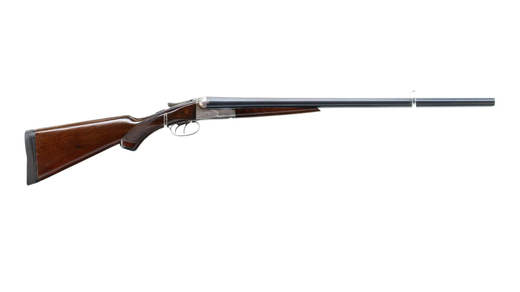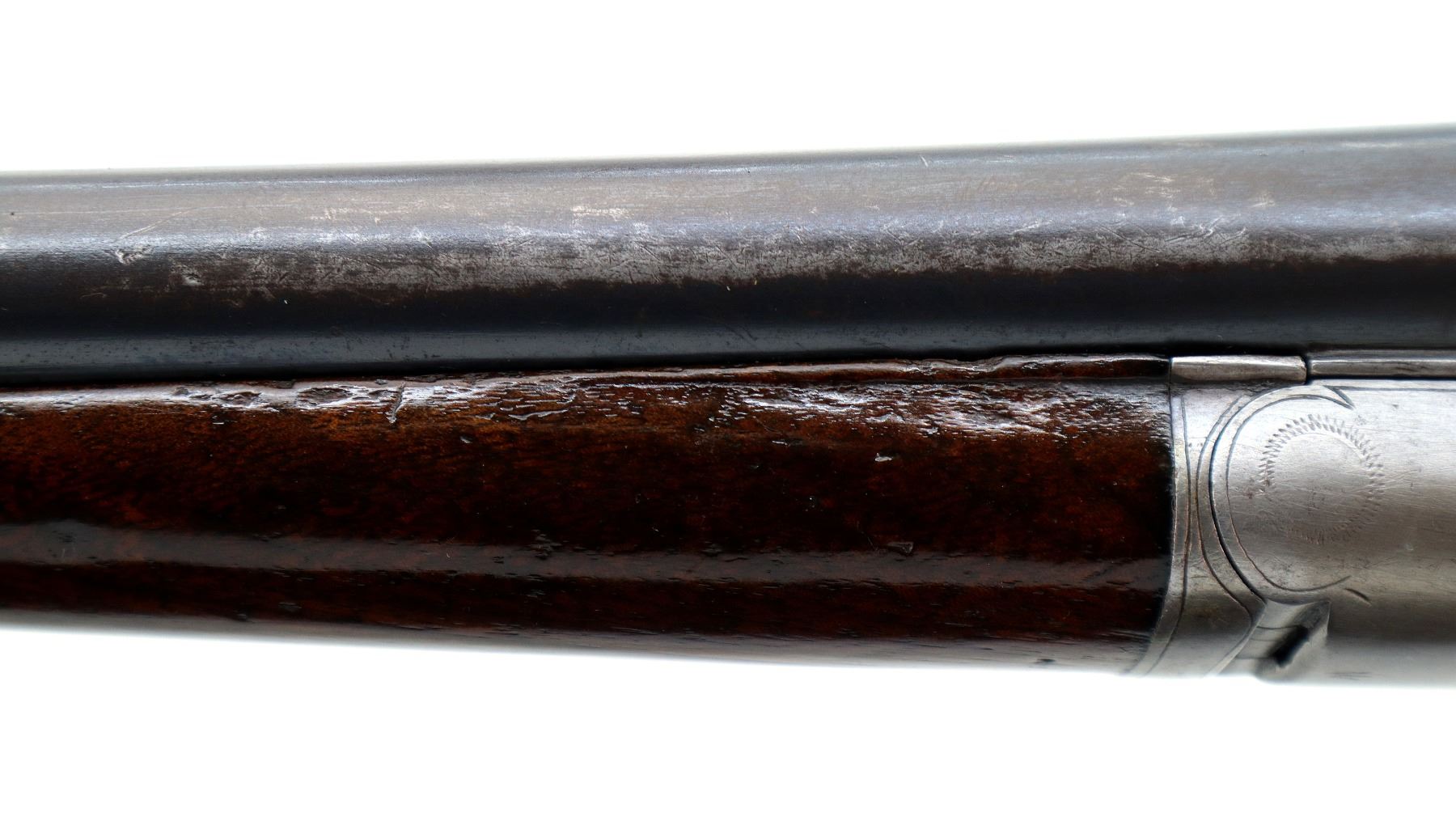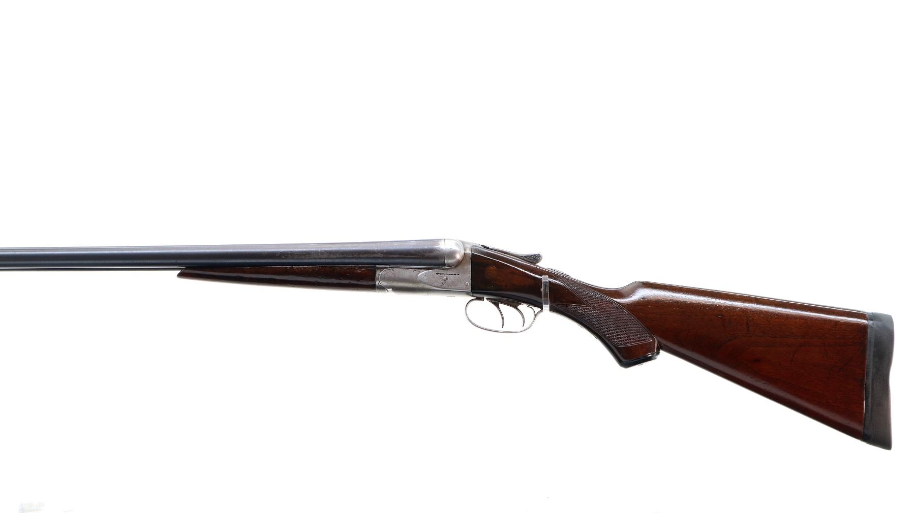 Main Description: Brass bead, blued barrels with raised rib that chime and are tight on face, border engraved receiver, manual safety, extractor, double triggers. Two piece wood stocks, checkered pistol grip chipped, cracked and repaired behind receiver, black rubber recoil pad, grip cap.