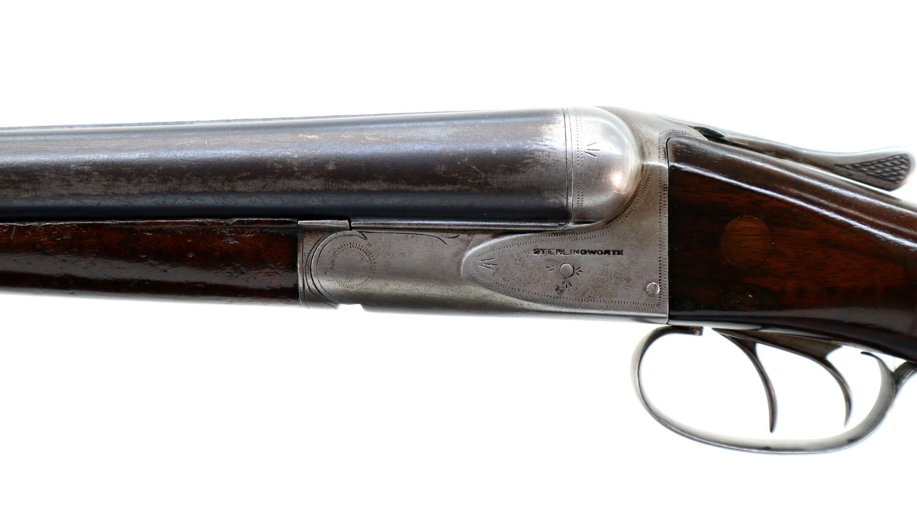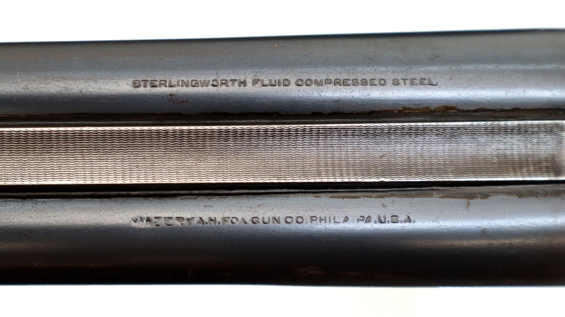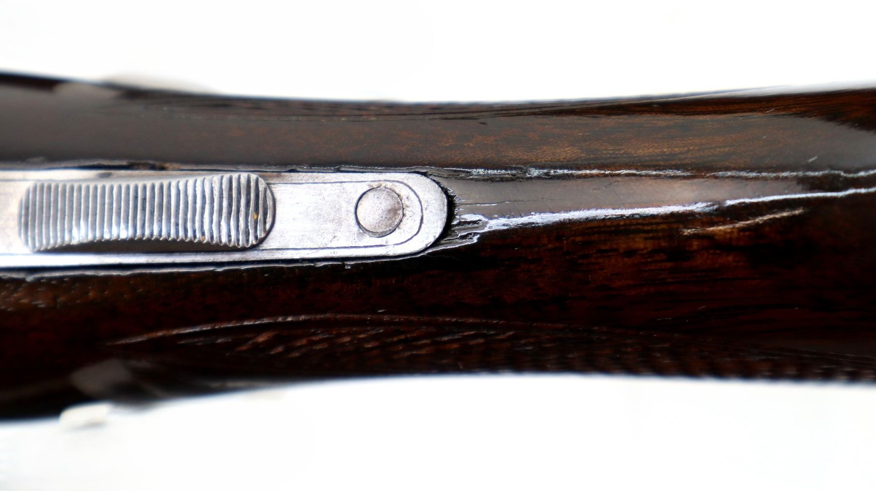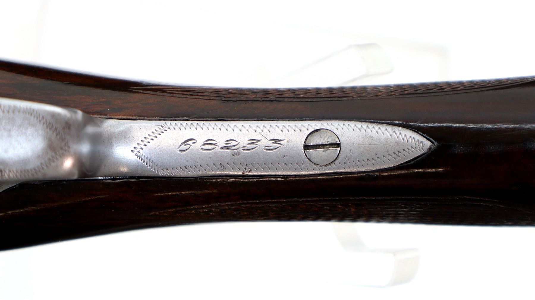 Main Description: Brass bead, blued barrels with raised rib that chime and are tight on face, border engraved receiver, manual safety, extractor, double triggers. Two piece wood stocks, checkered pistol grip chipped, cracked and repaired behind receiver, black rubber recoil pad, grip cap.