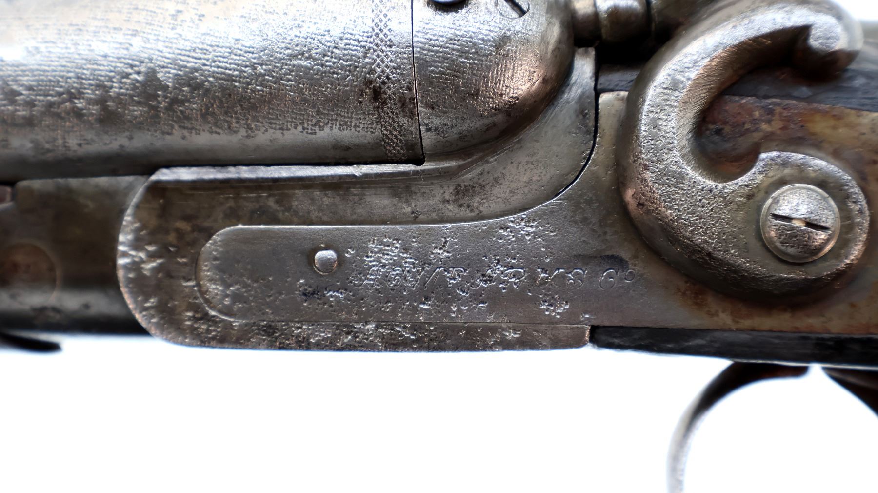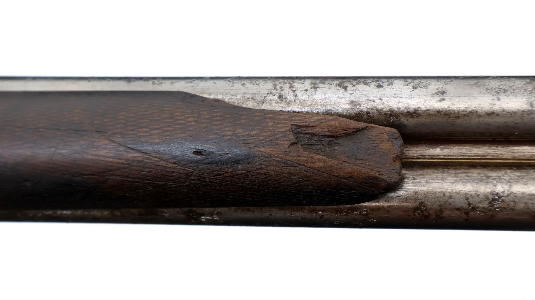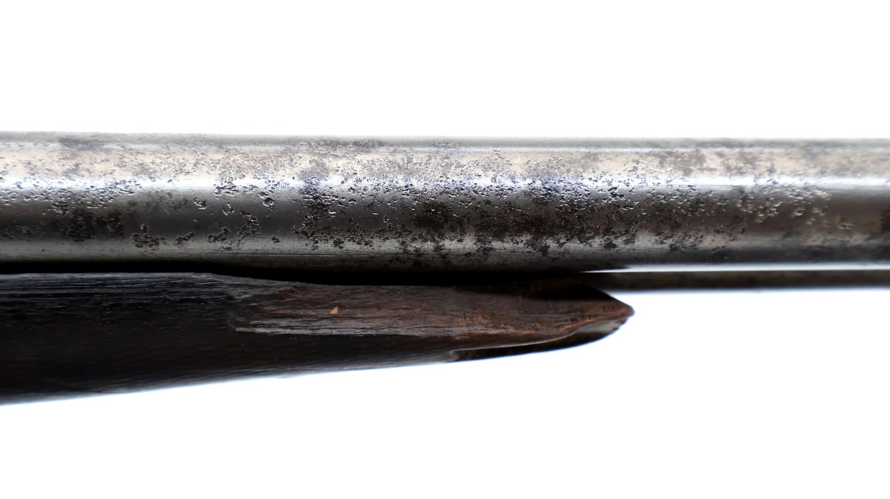 Wear: Metal finish turning silver grey with pitting, light rust speckles overall, scratches, handling marks and wear. Stocks show marks, scratches and wear.