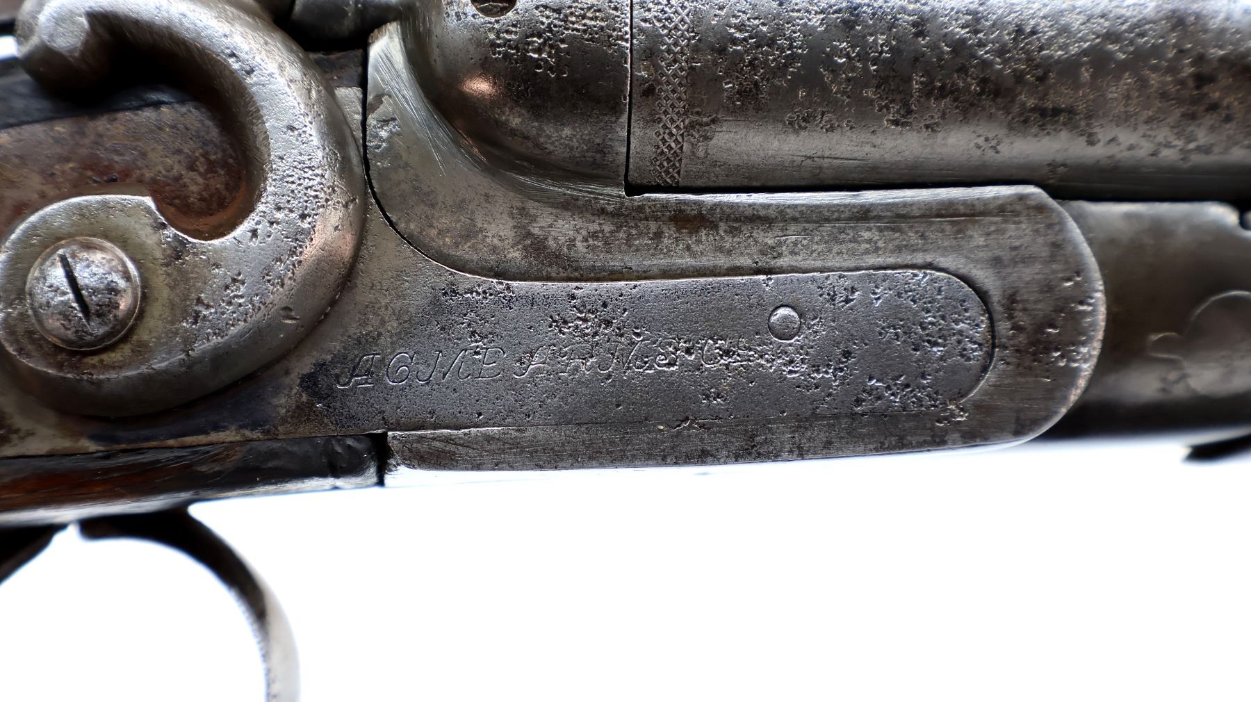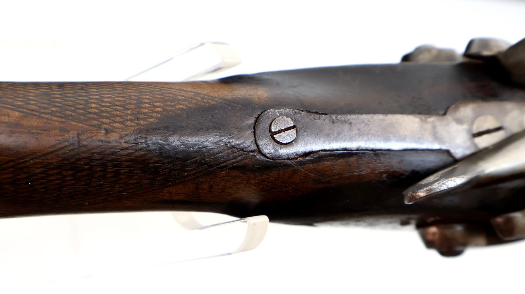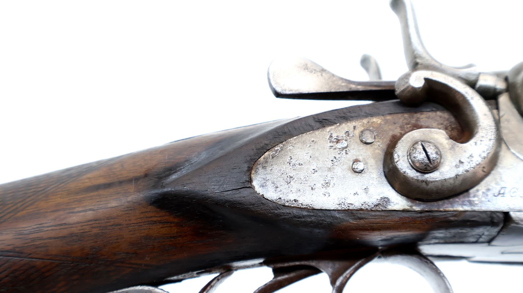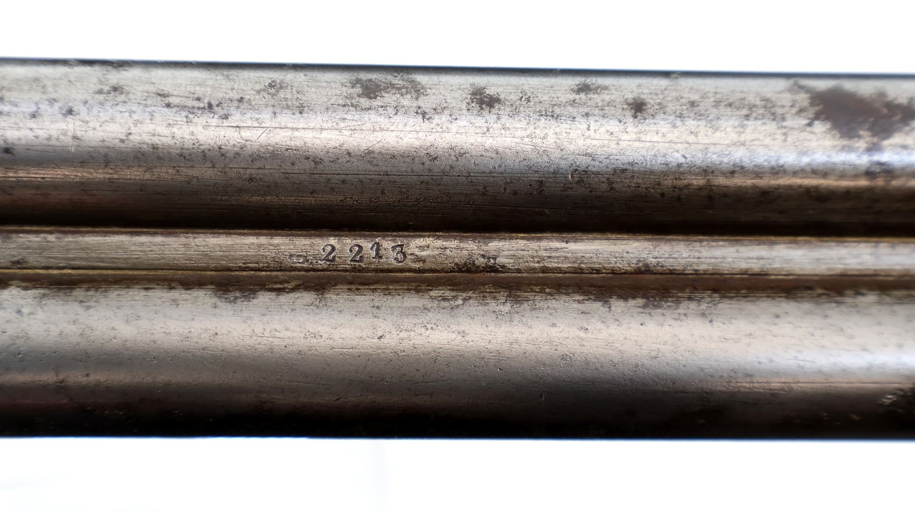 Wear: Metal finish turning silver grey with pitting, light rust speckles overall, scratches, handling marks and wear. Stocks show marks, scratches and wear.