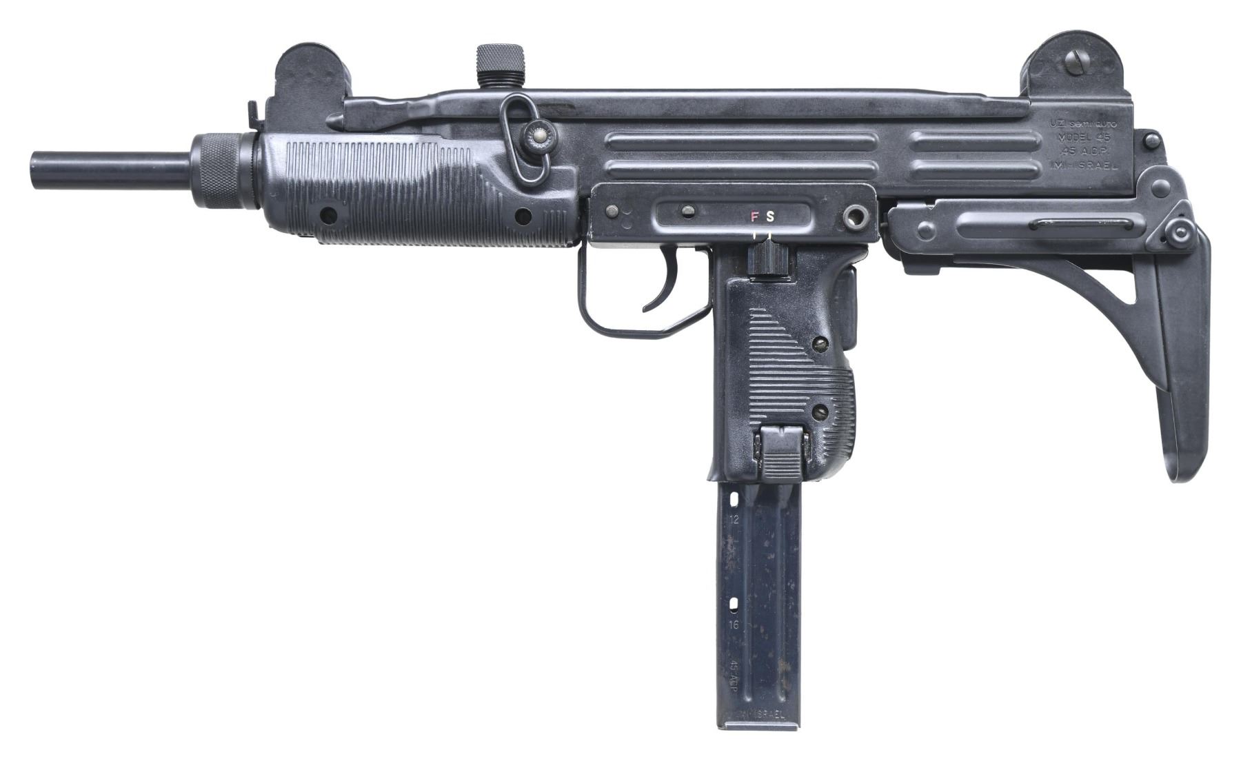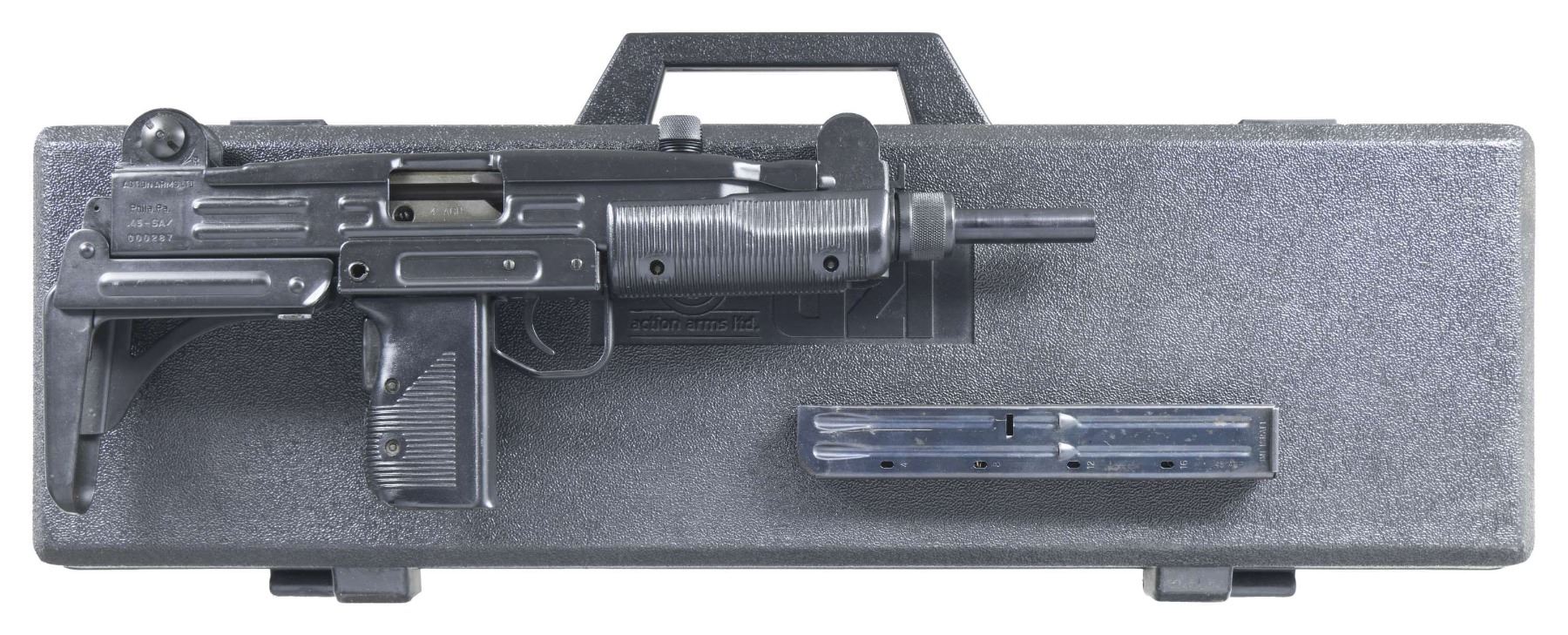 Cal. 45ACP. S# 000287. Bbl. 16". A 45ACP, closed bolt semi automatic version of the world-famous SMG. Fitted w/ factory collapsible stock & including a 3.5" bbl. blank, almost resembling the SMG to a "T". Front sight elevation adjustable protected post. Windage adjustable dual aperture protected peep sight marked "1" & "2". Classic black painted finish on most exposed metal parts. F-S trigger group. 360º rotating sling swivel on left side of receiver. Black plastic furniture. MAGS: 1 factory 16 rd. UNATTACHED ACCESSORIES: Blacl plastic transport / storage case, 3.5" factory bbl. display blank & tan canvas sling. CONDITION: All aspects indicate very little use, if any. No noticeable major blemishes on finish of any exposed area aside from a little very gentle thinning in areas of mechanical intervention. Bore is bright w/ strong rifling. Fire control mechanism appears to function properly when cycled by hand. (25-2563/JZ). MODERN. $800-1,200.