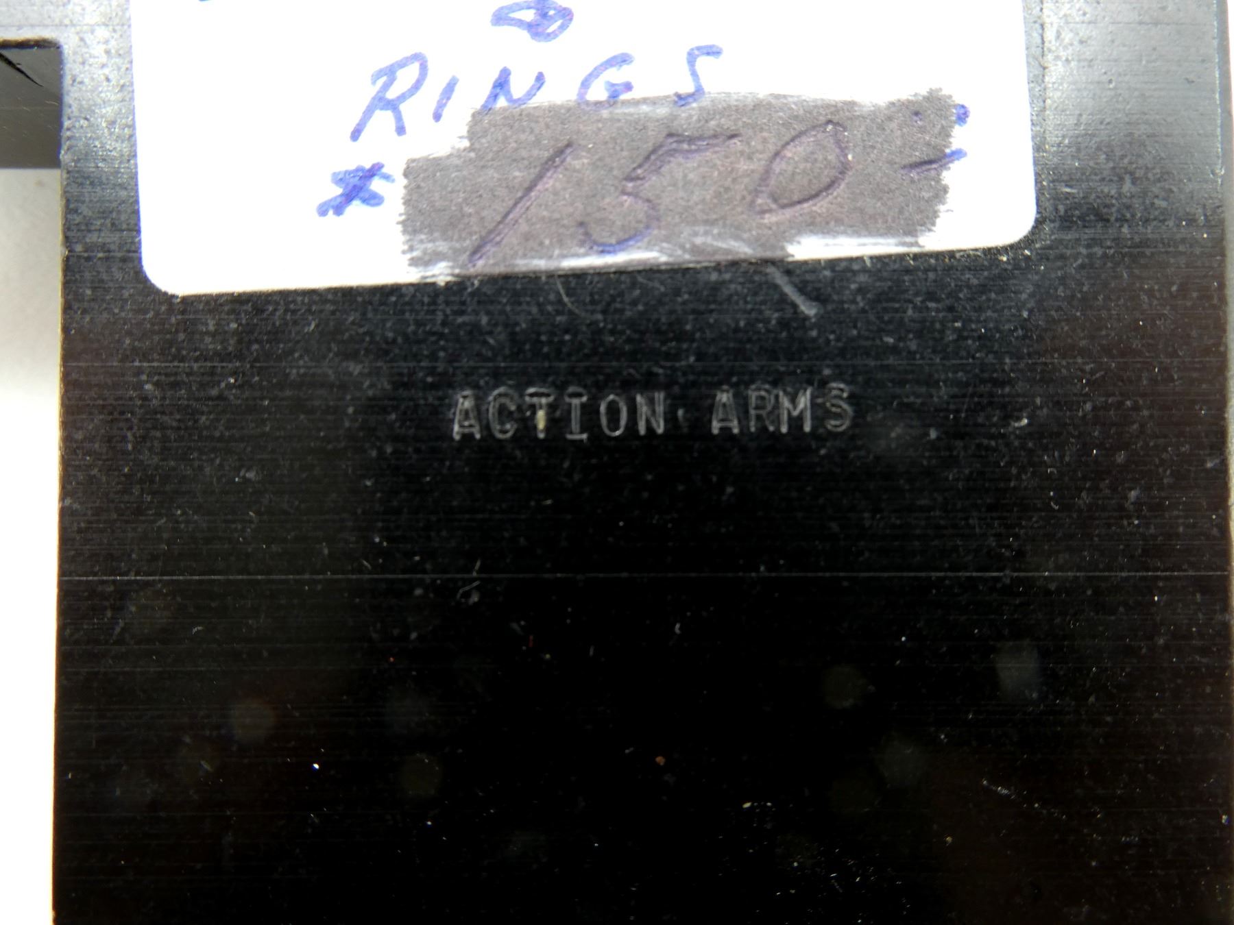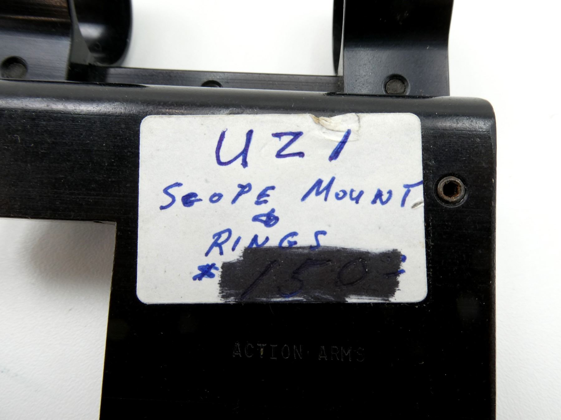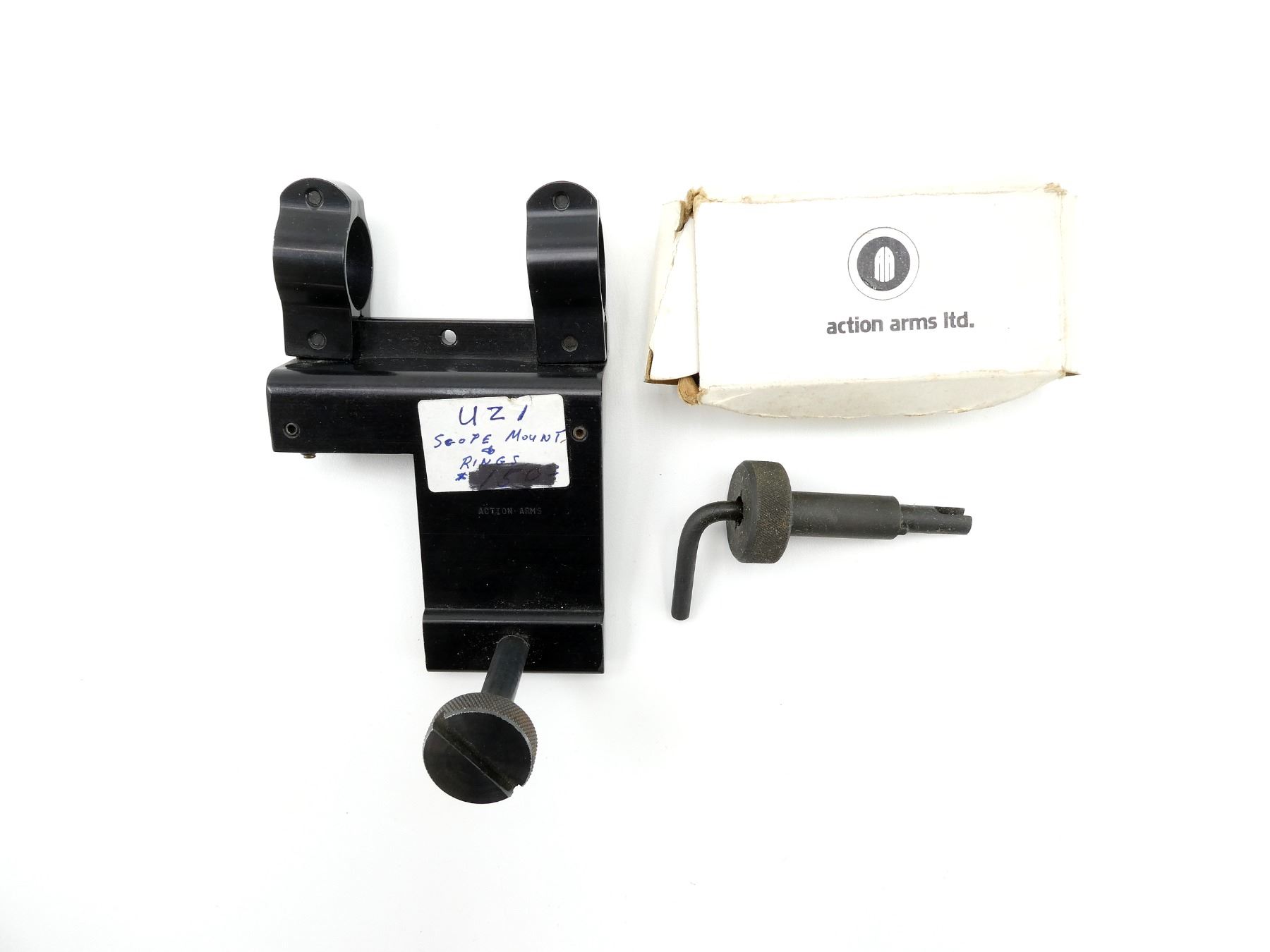 LOT INCLUDES; (1) ACTION ARMS UZI SCOPE MOUNT, WITH 1" DIAMETER SCOPE RINGS & (1) ACTION ARMS FRONT SIGHT ADJUSTMENT TOOL, SHOWS WEAR & TEAR / USE MARKINGS, IN ORIGINAL PACKAGING. MAY REQUIRE FITTING. SEE PHOTOS.