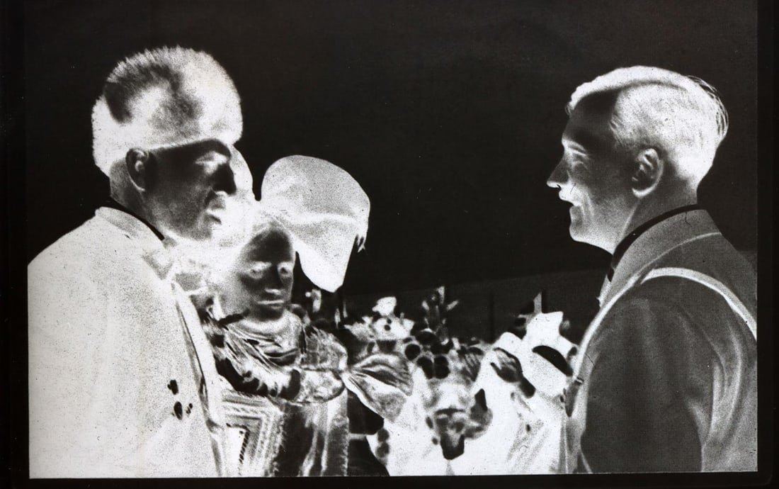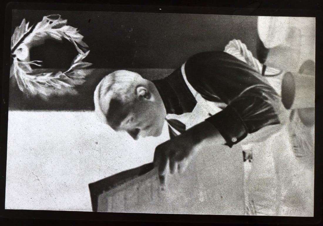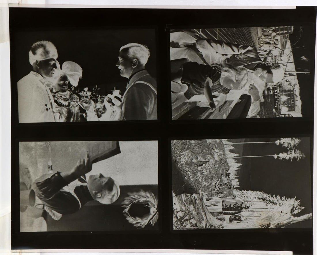 4 different cellulose negatives of photographs taken by Heinrich Hoffman of Adolf Hitler. One photo of Hitler on a bench with Helga Goebbels, eldest daughter of Joseph Goebbels. She was fed cyanide along with her siblings by their mother to prevent capture by the Russians. One Photo of Hitler reading the newspaper. One of Hitler walking down a path along the forest. Final photo of Hitler meeting peasants dressed in costumes at the Harvest Festival on Buckeberg Hill. Included in an original US Navy envelope. From a 93-year old veteran collection. Very good condition.