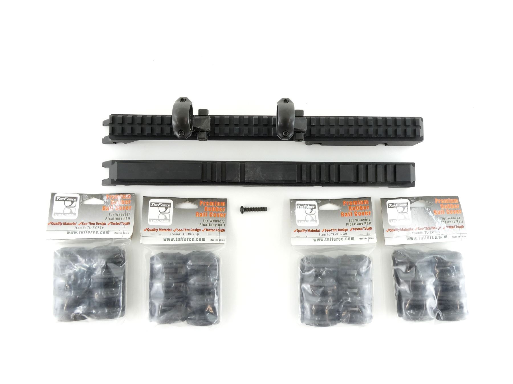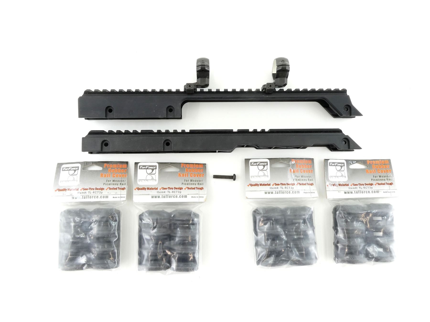 LOT INCLUDES; (1) SET OF AK SL8 SCOPE RAILS, WITH PAIR OF 1" DIAMETER SCOPE RINGS ATTACHED & (4) PACKS OF TUFFORCE PREMIUM RUBBER RAIL COVERS, FOR WEAVER/PICATINNY RAIL, PRODUCT #: TL-RC73P, NEW OLD STOCK, SEALED IN ORIGINAL PACKAGING. MAY REQUIRE FITTING. SEE PHOTOS.