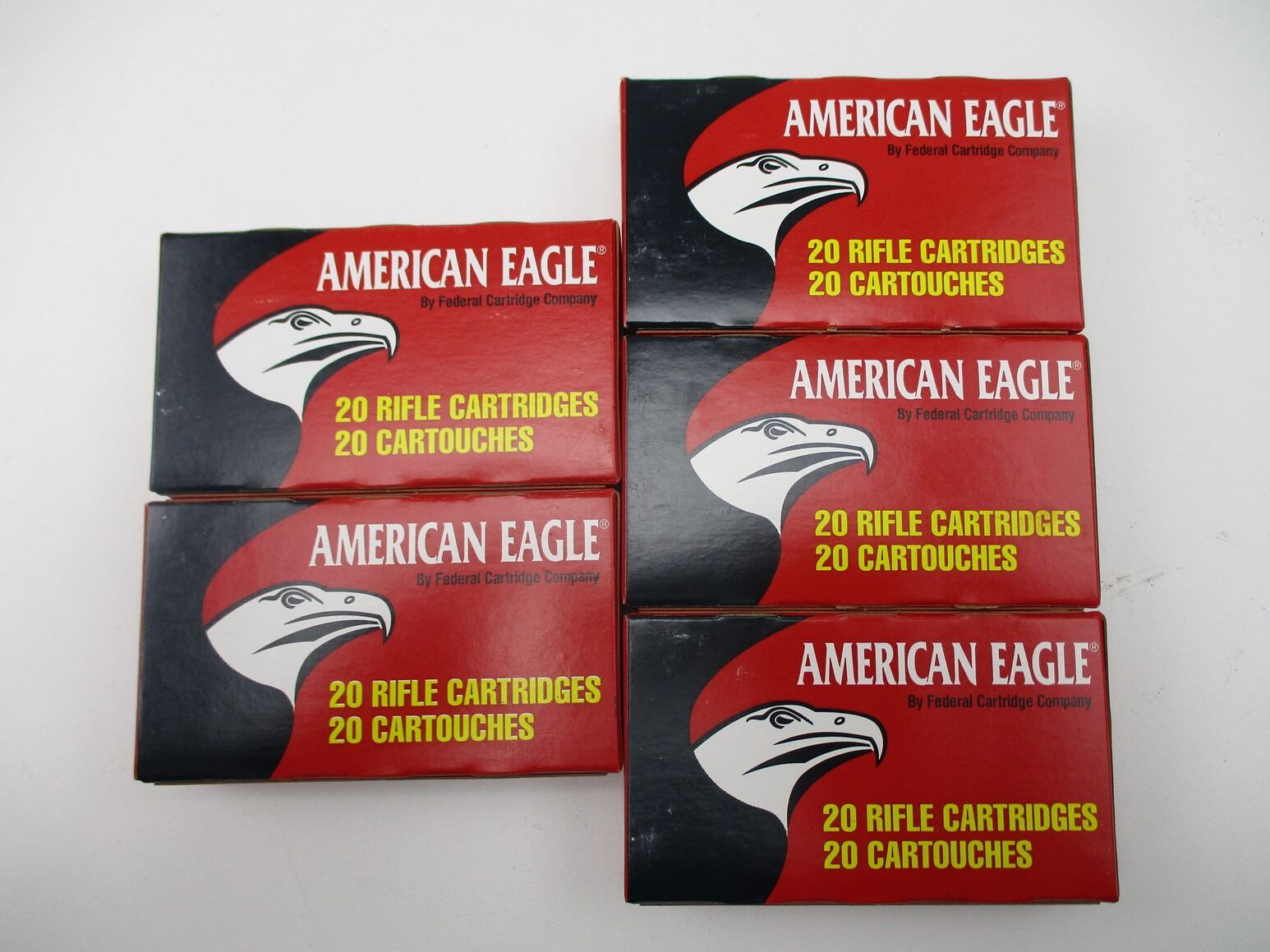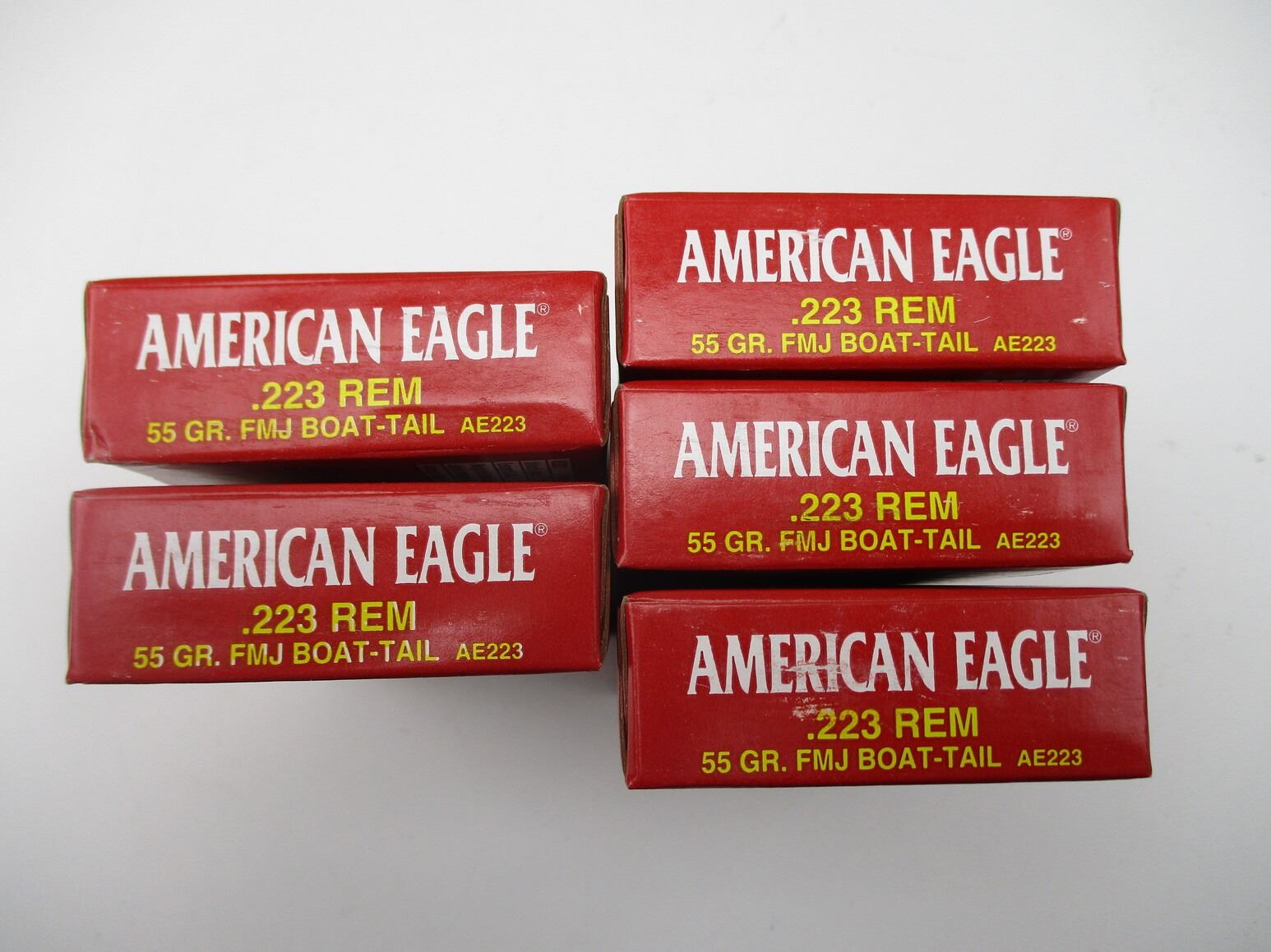 AMERICAN EAGLE .223 REM AMMO LOT , 100 RNDS, FMJ, (5) SEALED BOXES. , THERE ARE NEW SHIPPING RESTRICTIONS, PLEASE MAKE SURE YOU HAVE READ AND CONFIRMED WE CAN SHIP TO YOU BEFORE BIDDING ON THIS LOT. PLEASE SEE LOT 0 IN THIS SESSION. NO REFUNDS WILL BE ISSUED, OR BIDS RETRACTED.