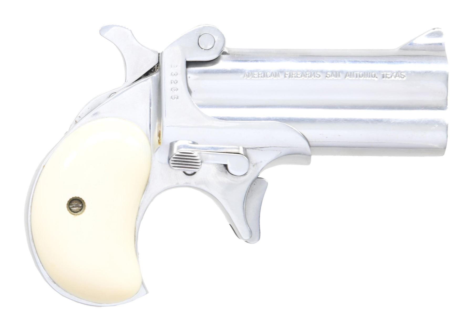 Cal. 38 Spl. S# 23265. Approx. 3,000-4,000 mfg. in San Antonio, TX 1972-1974. Bbls. 3". Fixed sights. Nickel finish. White synthetic grips. UNATTACHED ACCESSORIES: Bianchi black leather belt clip holster. CONDITION: very good finish showing light handling wear. Very good bore. (25-2643/MD). CURIO. $200-300.