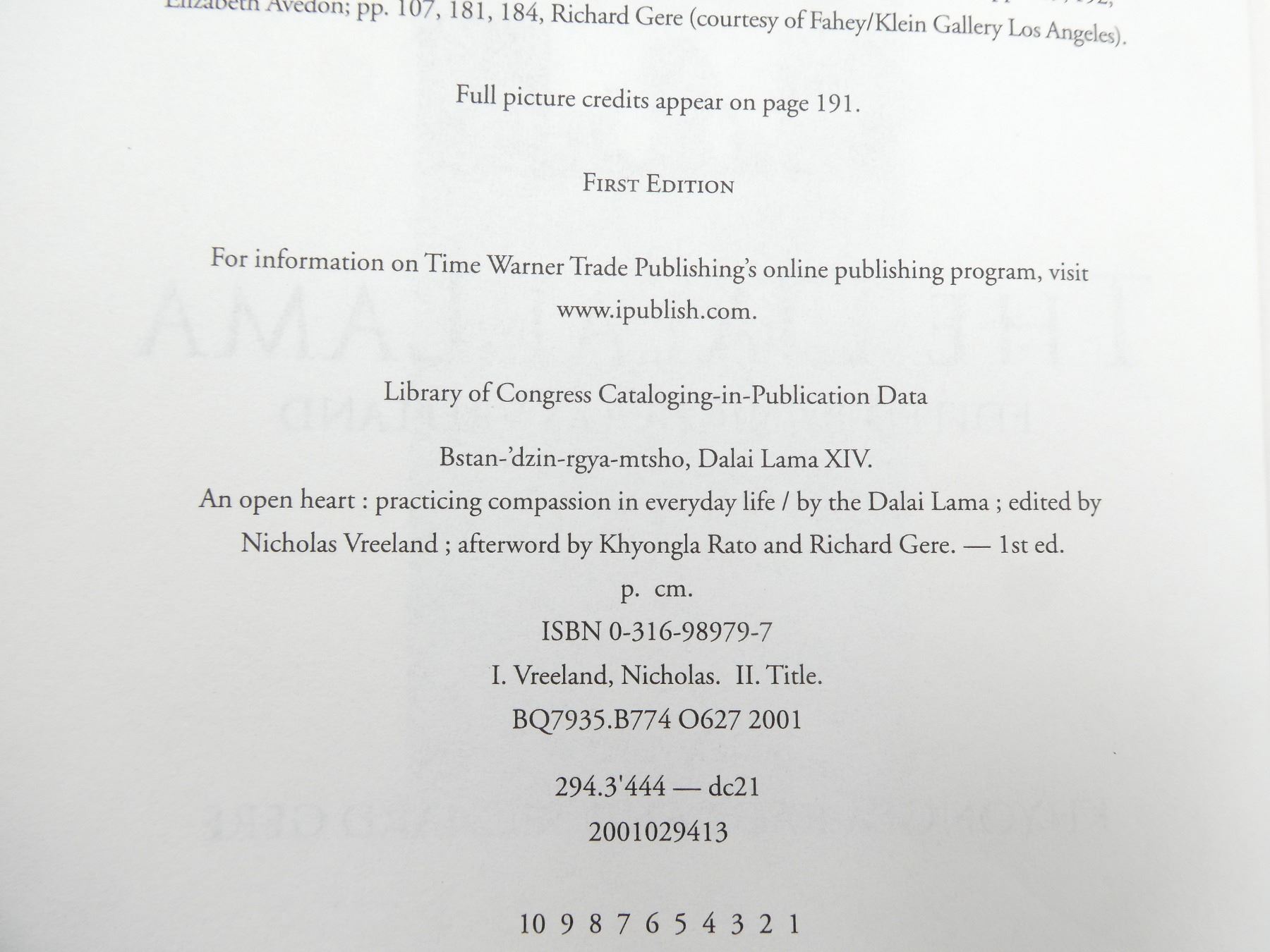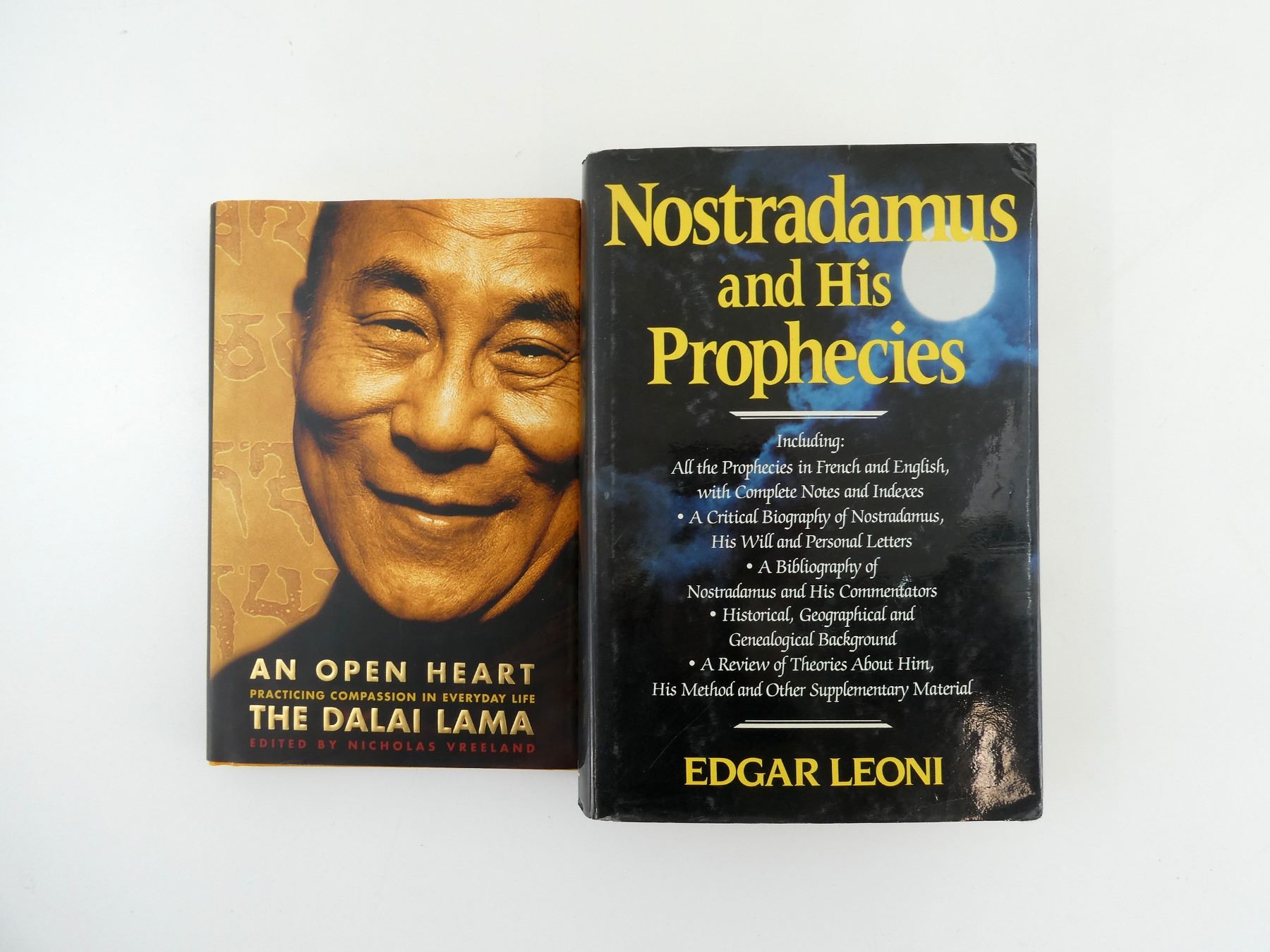 LOT INCLUDES; (1) "AN OPEN HEART: PRACTICING COMPASSION IN EVERYDAY LIFE" BOOK, BY THE DALAI LAMA & NICHOLAS VREELAND, HARD COVER WITH DUST COVER, ISBN: 0-316-98979-7 & (1) "NOSTRADAMUS AND HIS PROPHECIES" BOOK, BY EDGAR LEONI, HARD COVER WITH DUST COVER, ISBN: 0-517-38809X. SEE PHOTOS.