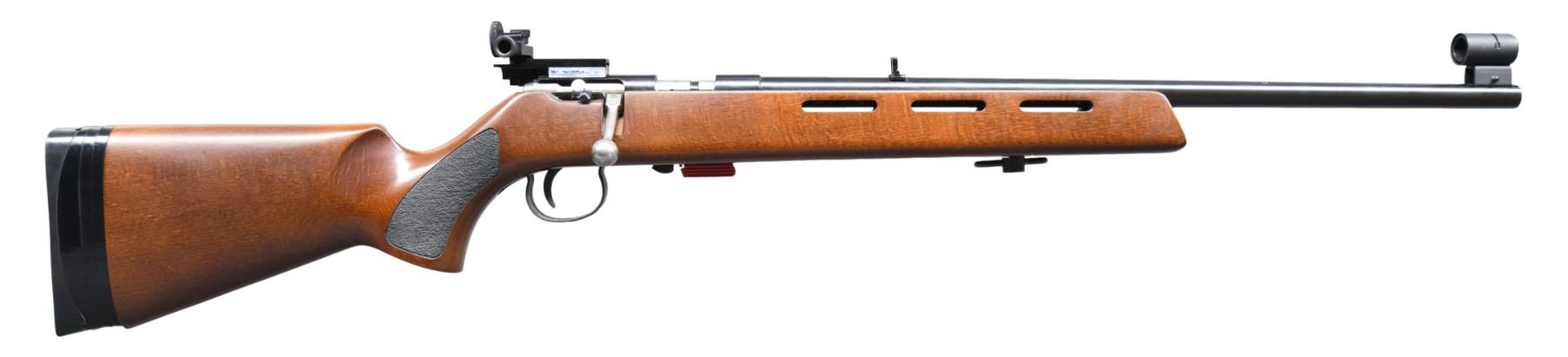 Cal. 22 LR. S# 1320248. Bbl. 19 1/2' (codes 1987) with globe front target sight allowing interchangeable disks; installed by clamping onto its machined grooves on barrel. Rear folding leaf barrel sight plus Williams Foolproof receiver sight having target disk, machined aluminum riser and target knobs; attached to factory grooved receiver. Imported from West Germany 1987-1995. Stained hardwood stock with stippled grip area, vented handguard and synthetic buttplate assembly allowing for change in drop and LOP. Adjustable 2 stage target trigger having sliding thumb safety. Sling swivel in middle of 3 possible positions on forend plus blued steel trigger guard. MAGS: rendered single shot with magazine contoured red factory loading platform. CONDITION: light stock marks and faint red "4" on left front of forend; all other aspects near excellent including bore. (25-3354/NW). MODERN. $250-400.