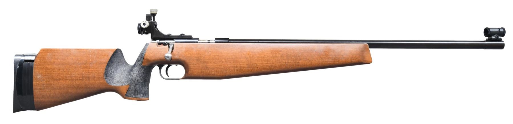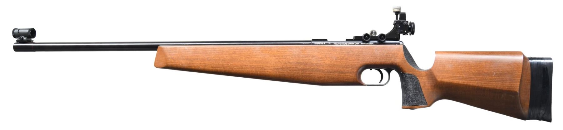 Cal. 22 LR. S# 1300167. Bbl. 25" target profile (recessed crown) with banded muzzle section having Unertl style base with Anschutz globe sight; fully adjustable factory micrometer target sight mounted on factory grooved Model 64 based receiver. Barrel date codes 1986; importation discontinued 1990. Improved version of Model 64S as single shot with hardwood target stock having stippled ergonomic pistol grip section, aluminum accessory rail in forend and factory synthetic buttplate assembly adjustable for drop and LOP. Barrel and action markings filled with white coloring. CONDITION: occasional very faint stock handling marks with balance of rifle near excellent to include bore. (25-3347/NW). MODERN. $500-750.