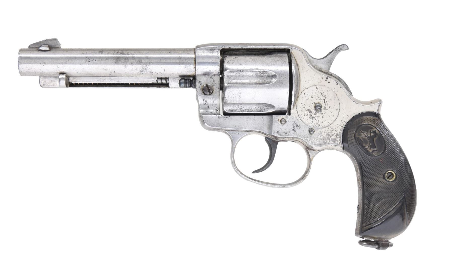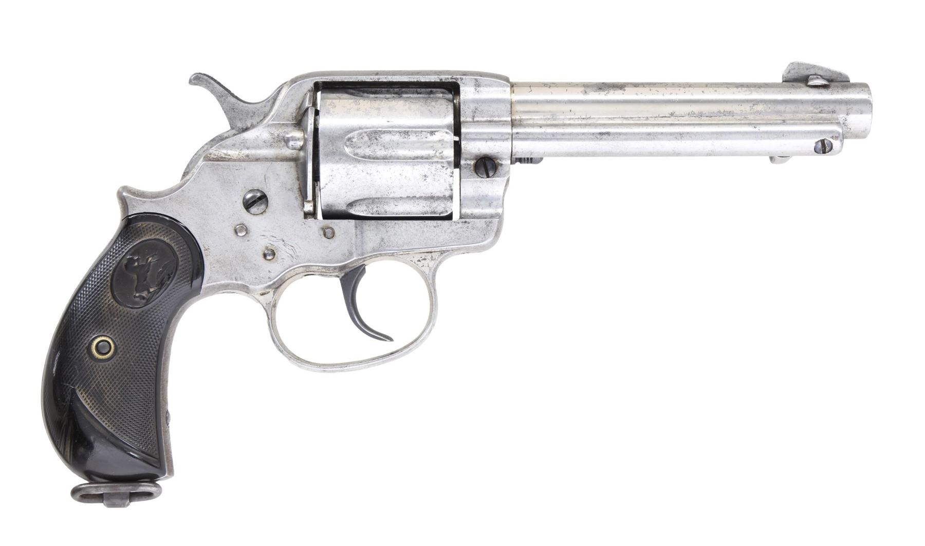 REVOLVER. Cal. 45 Colt. S# 12199. Bbl. 5 1/8". According to The Book of Colt Firearms by R.L. Wilson, this example was the final Model 1878 Frontier double action revolver, mfg. by Colt in 1883, with 1884 production starting at S# 12200. The top of the bbl. is marked with Colt's single line address, with "45 CAL" marked on the left side of the trigger guard. Major metal components exhibit a nickel-plated finish overall, with some smaller components, including the frame screws, cyl. base pin screw, trigger, hammer (backstrap), and lanyard loop, exhibiting a nickel-blue finish. Frame is mounted with 2-piece Colt logo checkered hard rubber grips. Dovetailed blade front sight appears to be a period replacement. Assembly # "739" is present on the frame and loading gate. Cyl. does not match. CONDITION: metal components retain fair to good amounts of their original factory nickel-plated finish, exhibiting large areas that have been cleaned and are in-the-white, with scattered areas of pitting, light surface oxidation, flaking, and age-related discoloration overall. Nitre-blued components retain traces of their original finish. Bore is bright, exhibiting scattered areas of dark pitting while retaining strong rifling throughout. Action occasionally freezes on half-cock and cyl. does not properly lock up. Grips exhibit scattered superficial handling marks and smoothing but otherwise remain sturdy and serviceable. (01-25842/MLW). ANTIQUE. $800-1,200.