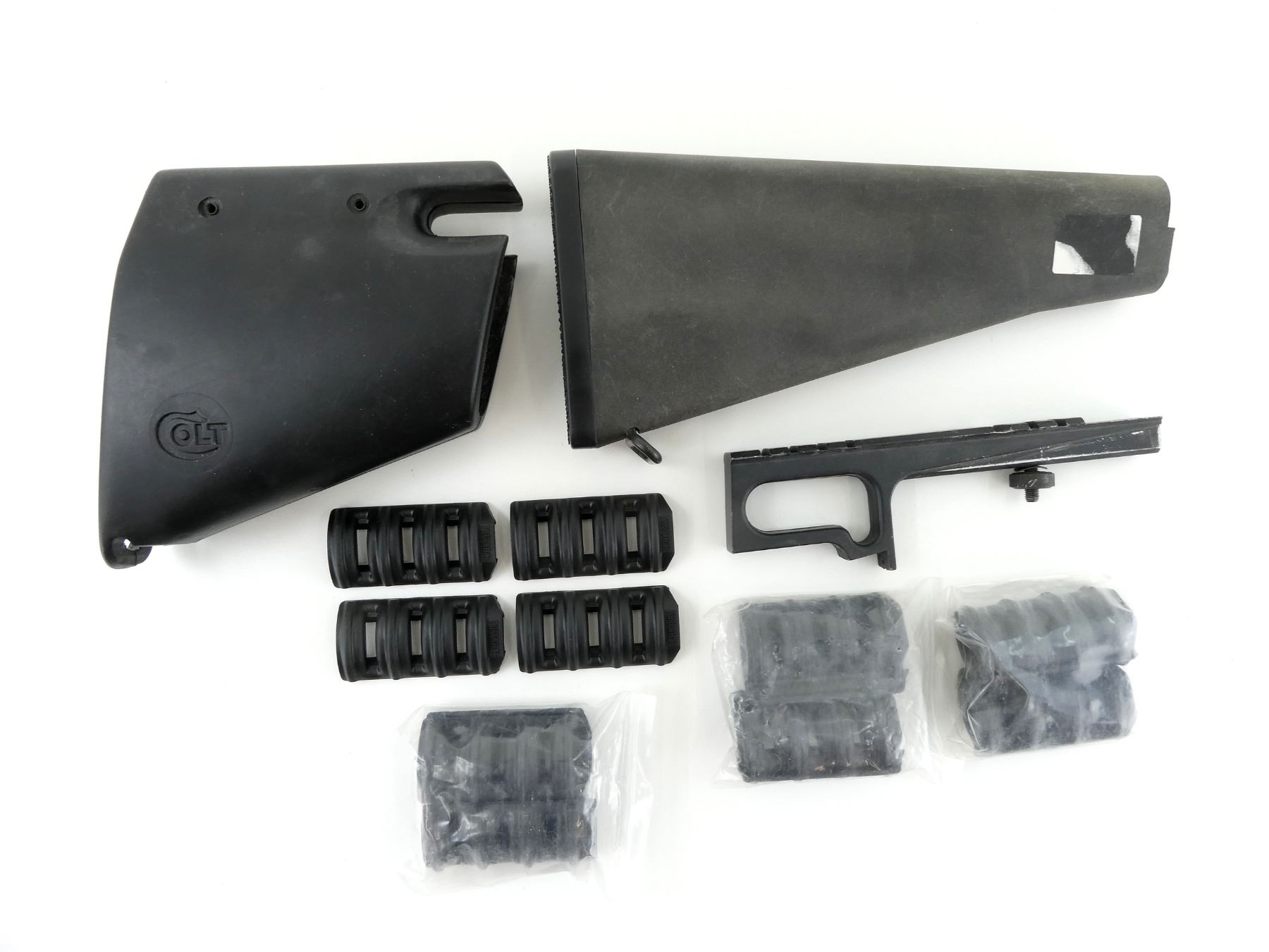 LOT INCLUDES; (1) POLYMER BUTT STOCK, UNMARKED, OVERALL LENGTH APPROX. 10.5", (1) COLT POLYMER CHEEK RISER, MARKED WITH MANUFACTURER'S LOGO, OVERALL LENGTH APPROX. 5.75", (1) UNKNOWN MOUNT, UNMARKED & (4) PACKS OF TUFFORCE RUBBER RAIL COVERS, APPEARS NEW OLD STOCK. MAY REQUIRE FITTING. SEE PHOTOS.