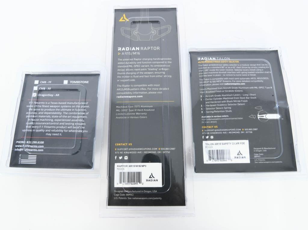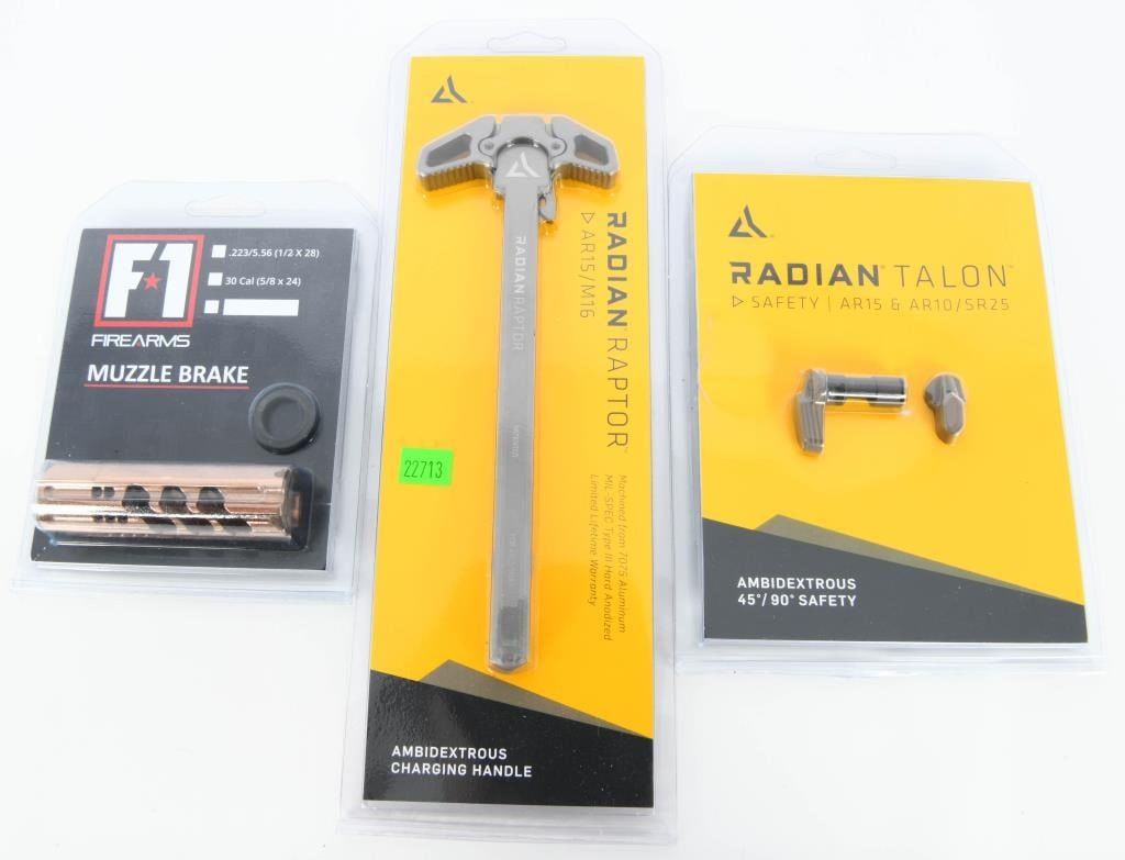 Greetings, Bidders! Get ready to elevate your AR game with this New-In-Package bundle. Inside, you'll find the precision of a Radian Charging Handle and Safety Switch, both brand new and ready to enhance your AR experience. But that's not all ? the package also includes a cutting-edge F1 Firearms Muzzle Brake, adding style and functionality to your firearm.