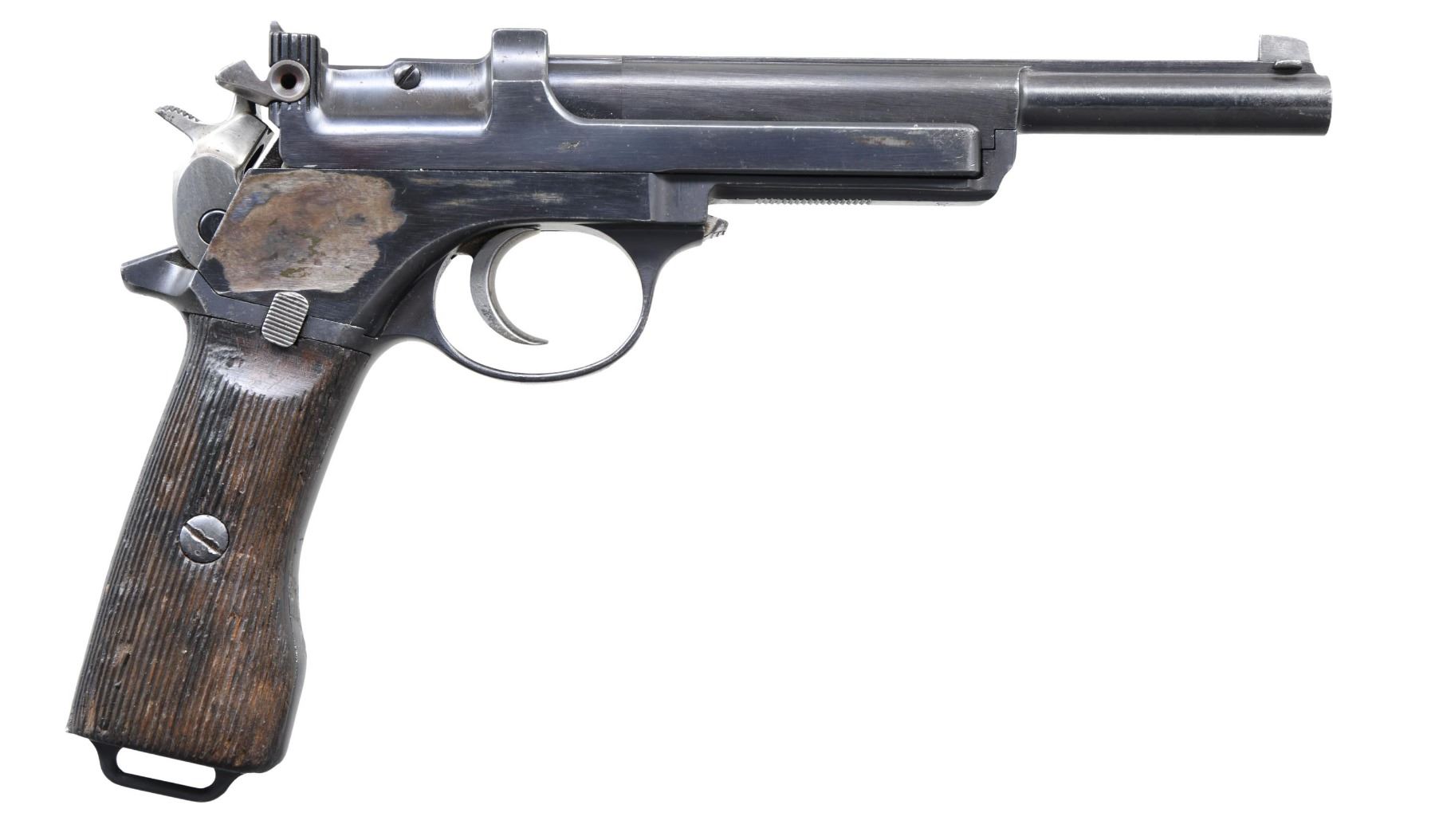 SEMI-AUTOMATIC PISTOL. Cal. 7.63mm Mannlicher. S# 3147. Bbl. 6 1/4". Mannlicher Model 1905 semi-automatic pistol mfg. by Steyr under contract for Argentina. Left side of the frame is marked "SYSTE/ MANNLICHER/ Md.1905/ WAFFENFABRIK/ STEYR", with the Argentine crest having been ground off on the right side. Frame, slide, and bbl. exhibit a reapplied blue finish, with the trigger and hammer having been cleaned and polished in-the-white. Frame is mounted with 2-piece grooved wood grips. Matching numbers are present on the frame, slide (underside), as well as on the left side of the bbl. (twice). CONDITITON: metal components retain the majority of their reapplied blue finish, exhibiting some spots of light to mild wear and thinning, some scattered superficial handling marks, as well as some scattered spots of light to mild pitting. Frame exhibits areas of mild pitting beneath the grips. In-the-white parts show some scattered spots of age related discoloration. Bore is bright, as refinished, exhibiting consistent mild to moderate pitting, while retaining good to strong rifling throughout. Grips show scattered marks and impressions from handling and storage, but otherwise remain sturdy and serviceable. (25-2375/MLW). CURIO. $400-600.