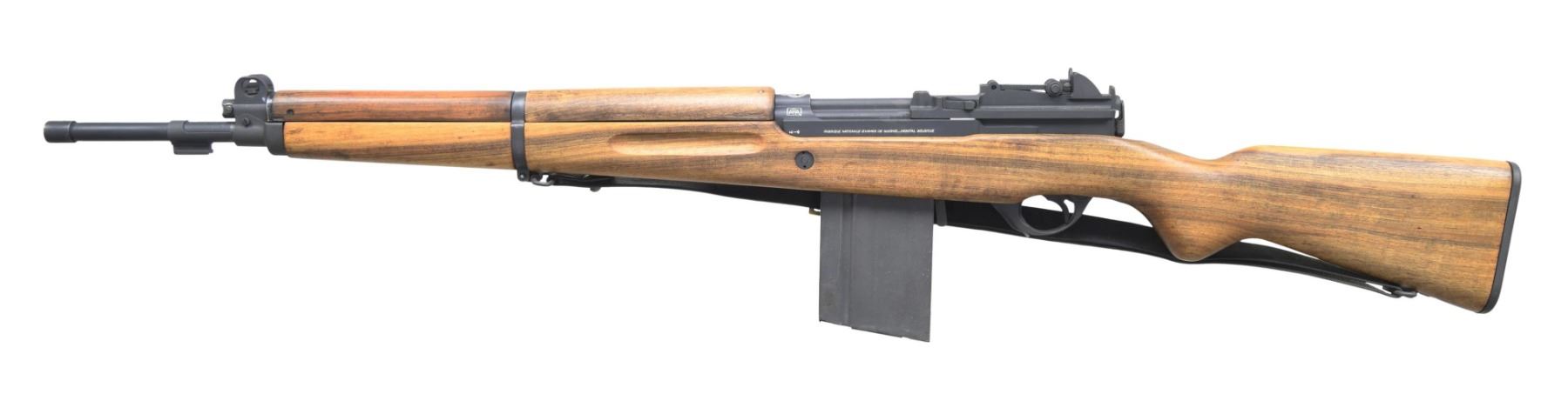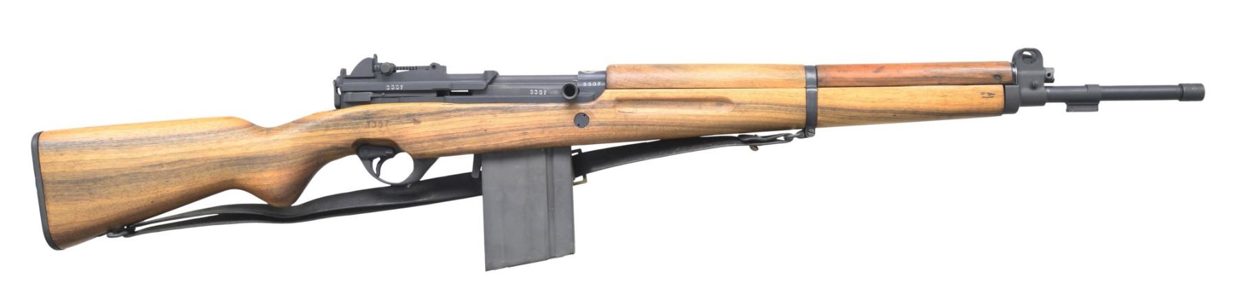 MILITARY RIFLE. Cal. 7.62x51. S# 3307. All visible numbers match. No import marks are visible. Bbl. 23 1/4". Tangent aperture rear sight graduated to 1,000 meters. Blade front sight w/ protective ears. Receiver ring is marked on top w/ Argentine crest. Marked on left side w/ boxed "ARA" Argentine navy marking. Left receiver rail has standard "FN" markings. Belgian proofs visible on receiver & receiver cover. All markings enhanced in white. These interesting rifles were converted in the early 1970s by an Argentine firm & involved fitting a unique to this rifle 20 rd. detachable magazine. Walnut stock & handguards. Trap buttplate. Brown leather 1" carrying sling. MAGS: 1 detachable 20 rd. CONDITION: stock has been given an arsenal rework finish, removing all markings except the serial number on the right side over trigger guard. Finish has light wear & scattered small handling marks. Metal has been given an arsenal rework dark Parkerized type finish w/ only very light wear. Bore has strong lands w/ shine, but has the appearance of fowling in the corners of the grooves. (25-2192/RW). CURIO. $800-1,200.