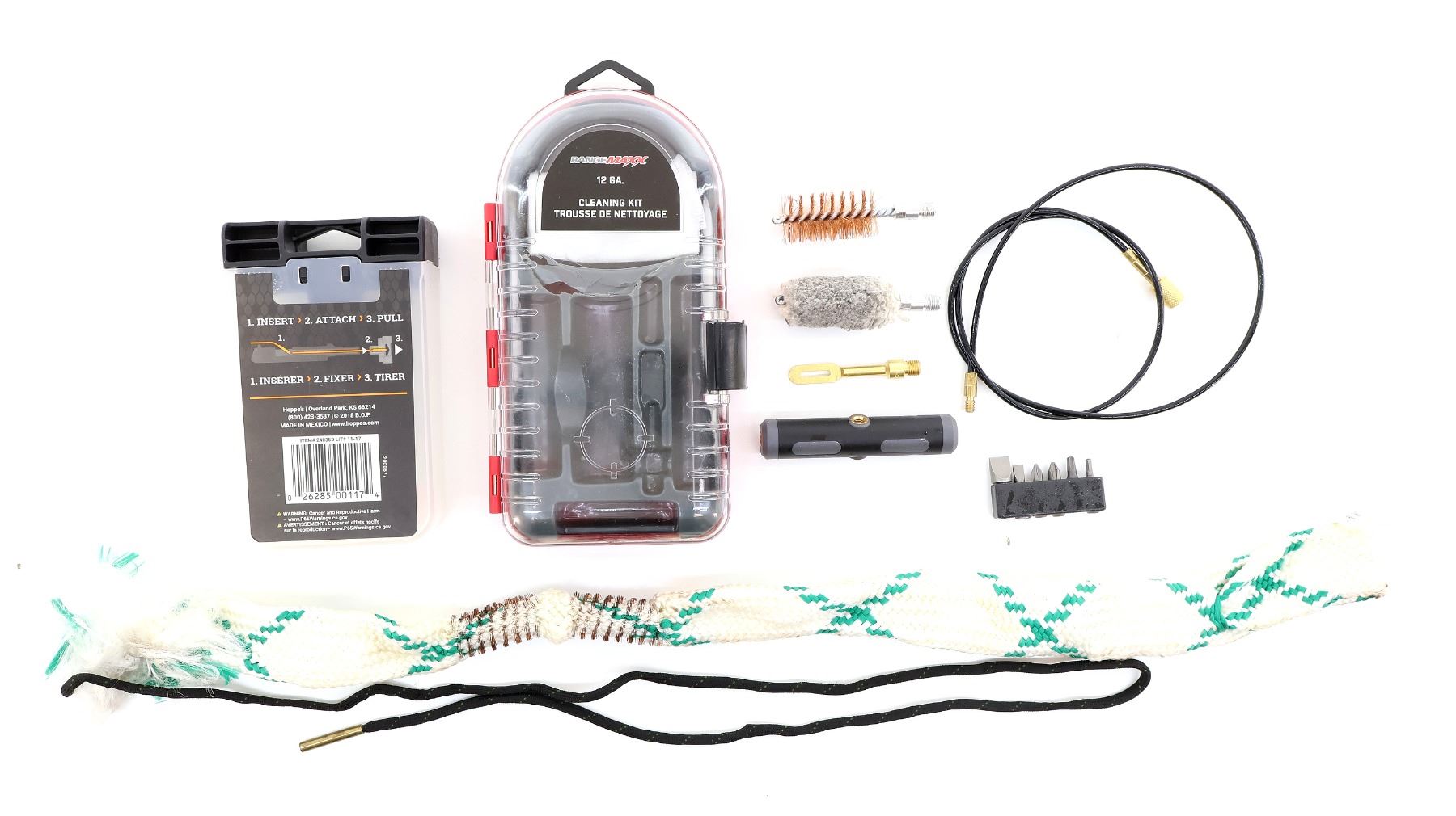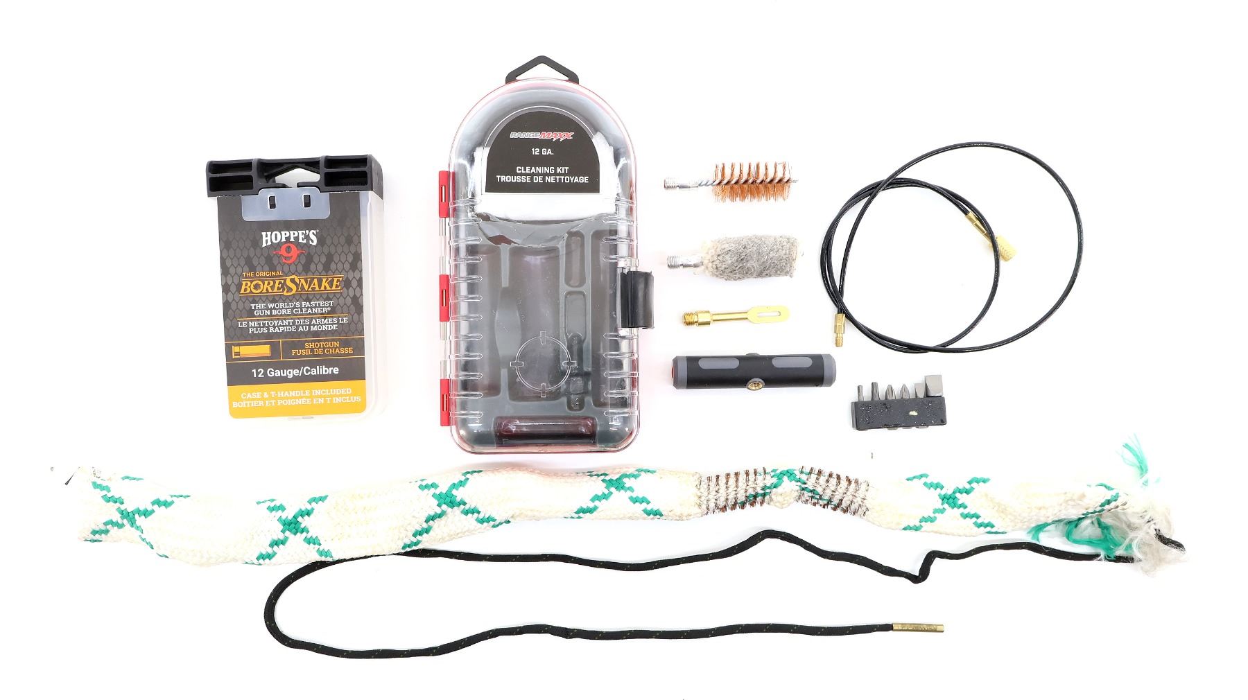 LOT INCLUDES; (1) RANGEMAXX 12 GA. CLEANING KIT, INCLUDES; 33" PULL-THROUGH CABLE, JAG, BRUSH, MOP, ETC., SHOWS WEAR & TEAR / USE MARKS & (1) HOPPE'S 12 GA. BORE SNAKE, ITEM #: 24035D, SHOWS WEAR & TEAR / USE MARKS. SEE PHOTOS.
