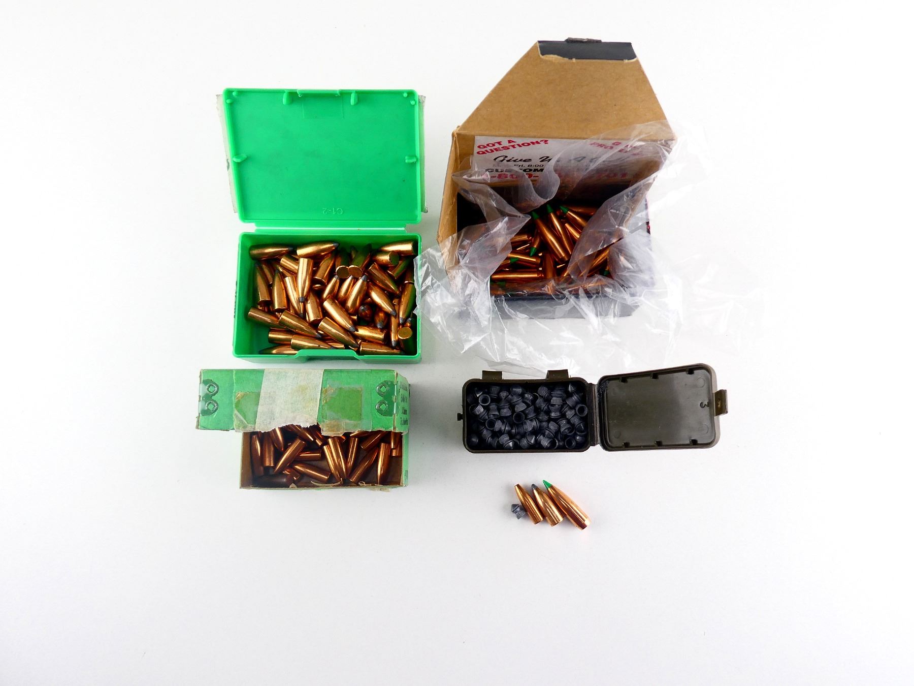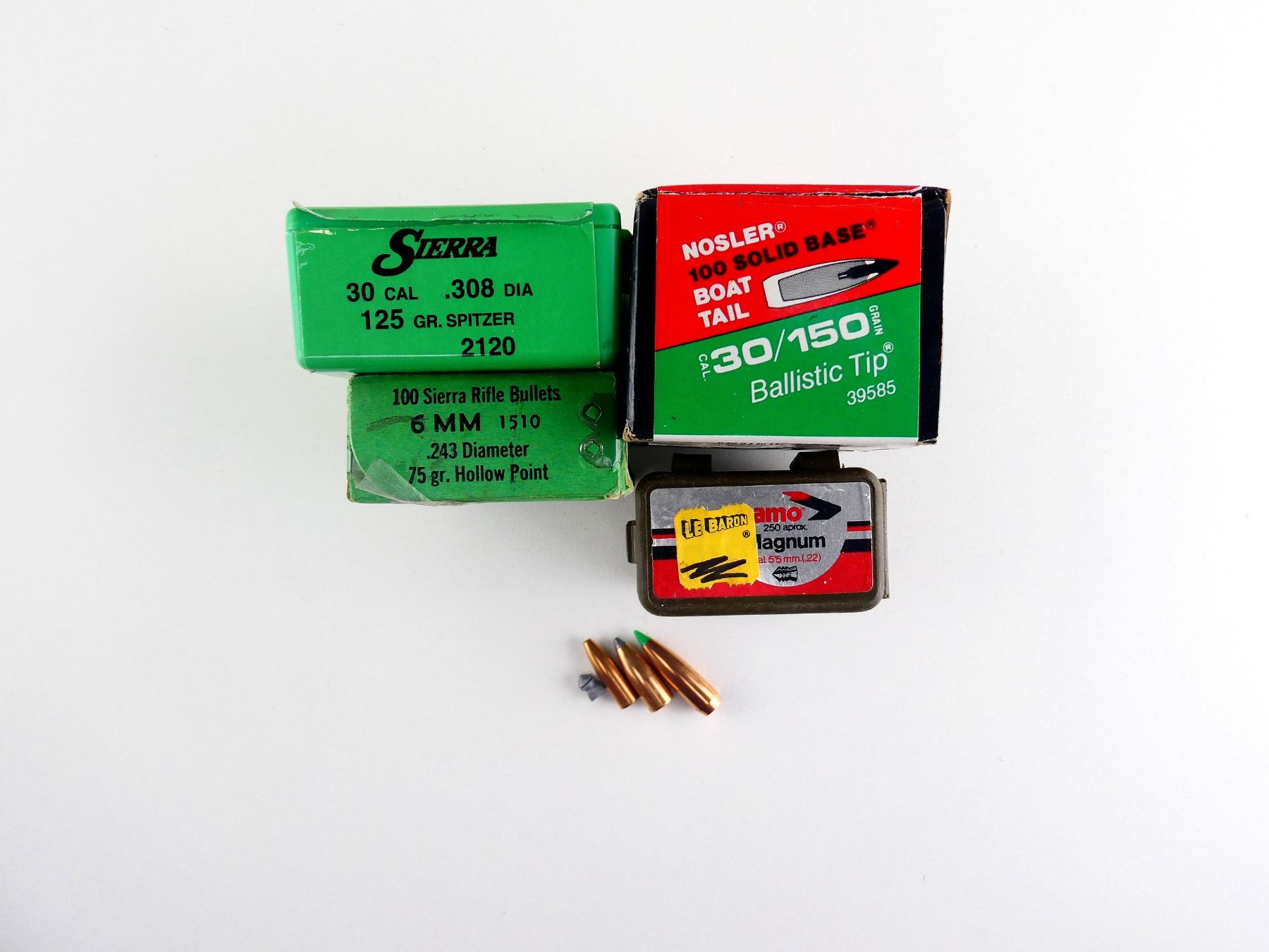 LOT INCLUDES; APPROX. 2 LBS BULLETS, APPROX. DIA .243", .308", ETC., ASSORTED MANUFACTURERS INCLUDING; NOSLER, SIERRA, ETC., 125 GRNS (STATED ON BOX NOT CONFIRMED), SPITZER, 150 GRNS (STATED ON BOX NOT CONFIRMED), BT, 75 GRNS (STATED ON BOX NOT CONFIRMED), HP, ETC.