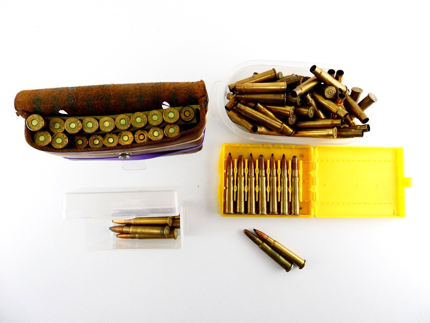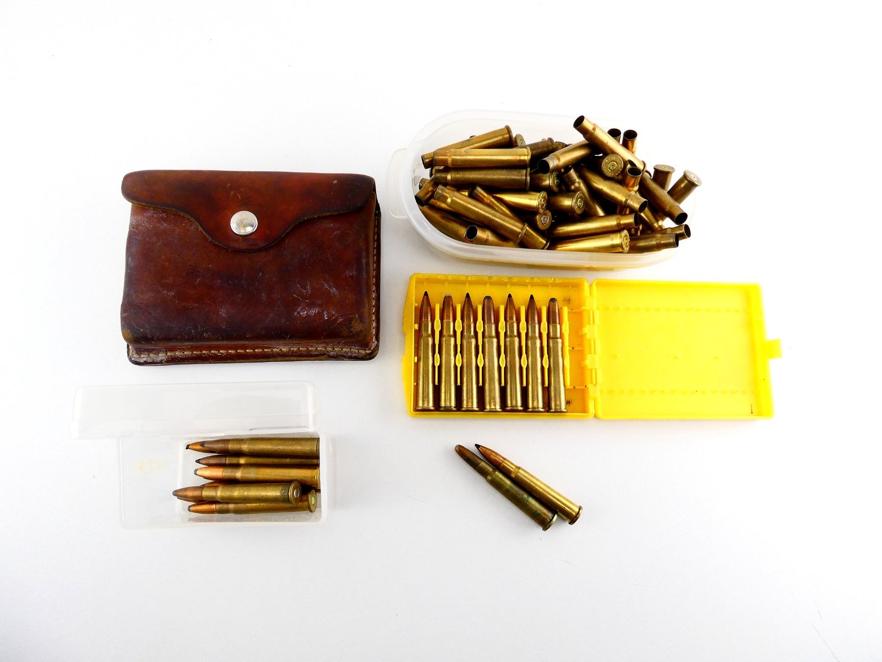 LOT INCLUDES; APPROX. (37) RNDS, VARIOUS MANUFACTURERS INCLUDING; REMINGTON, NNY, IMPERIAL, ETC., (57) NON-PRIMED BRASS CASES, (1) LEATHER AMMO POUCH, (1) PLASTIC POCKET AMMO PACK, ETC.