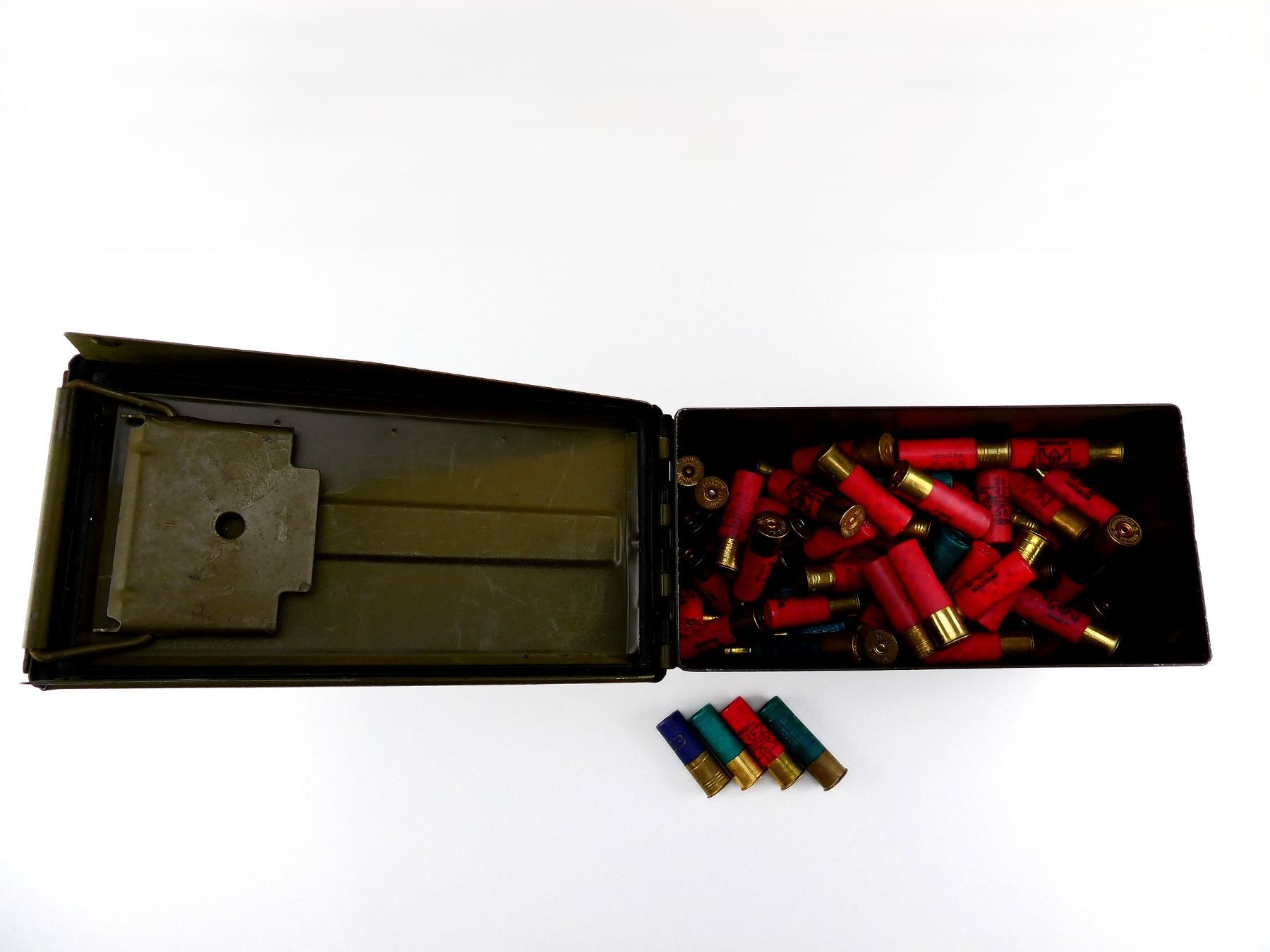 LOT INCLUDES; APPROX. (123) RNDS, VARIOUS MANUFACTURERS, ASSORTED SHOT SIZES INCLUDING; #2, #4, #6, #00 BUCK, ETC., (1) METAL AMMO TIC, APPROX. OAL 12"X6"X7", SEE PHOTOS.