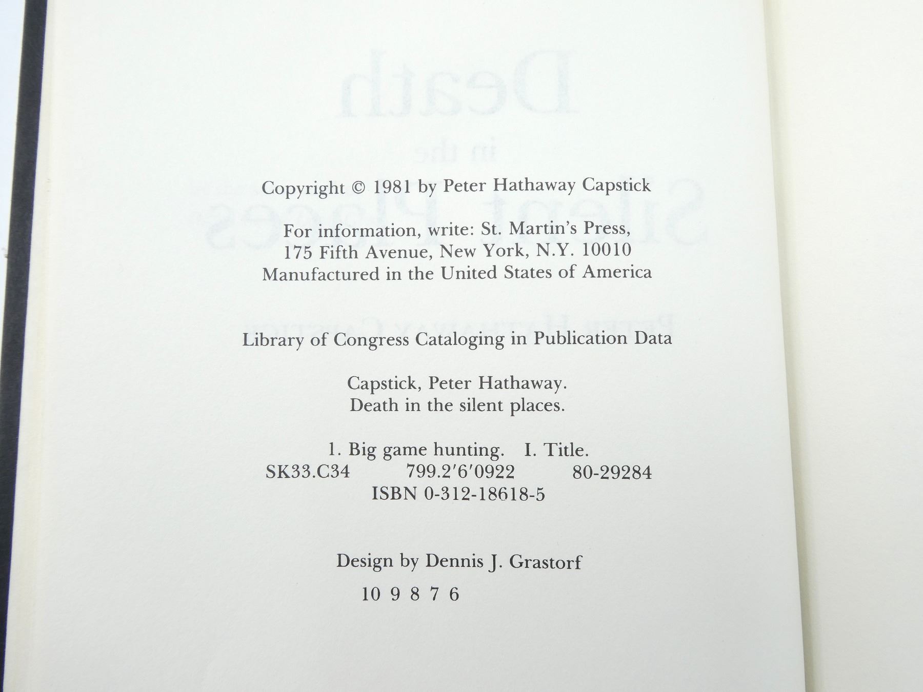 LOT INCLUDES; (1) "DEATH IN THE SILENT PLACES" BOOK BY PETER HATHAWAY CAPSTICK, HARD COVER, ISBN: 0-312-18618-5, (1) "THE WANDERINGS OF AN ELEPHANT HUNTER" BOOK BY W.D.M. BELL, HARD COVER WITH DUST COVER, ISBN: 1-57157-224-4 & (1) "MAN-EATERS OF KUMAON" BOOK BY JIM CORBETT, HARD COVER, FIRST CANADIAN EDITION, COPYRIGHT 1946. SEE PHOTOS.
