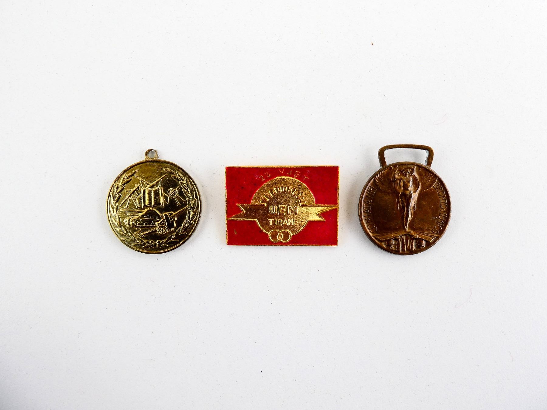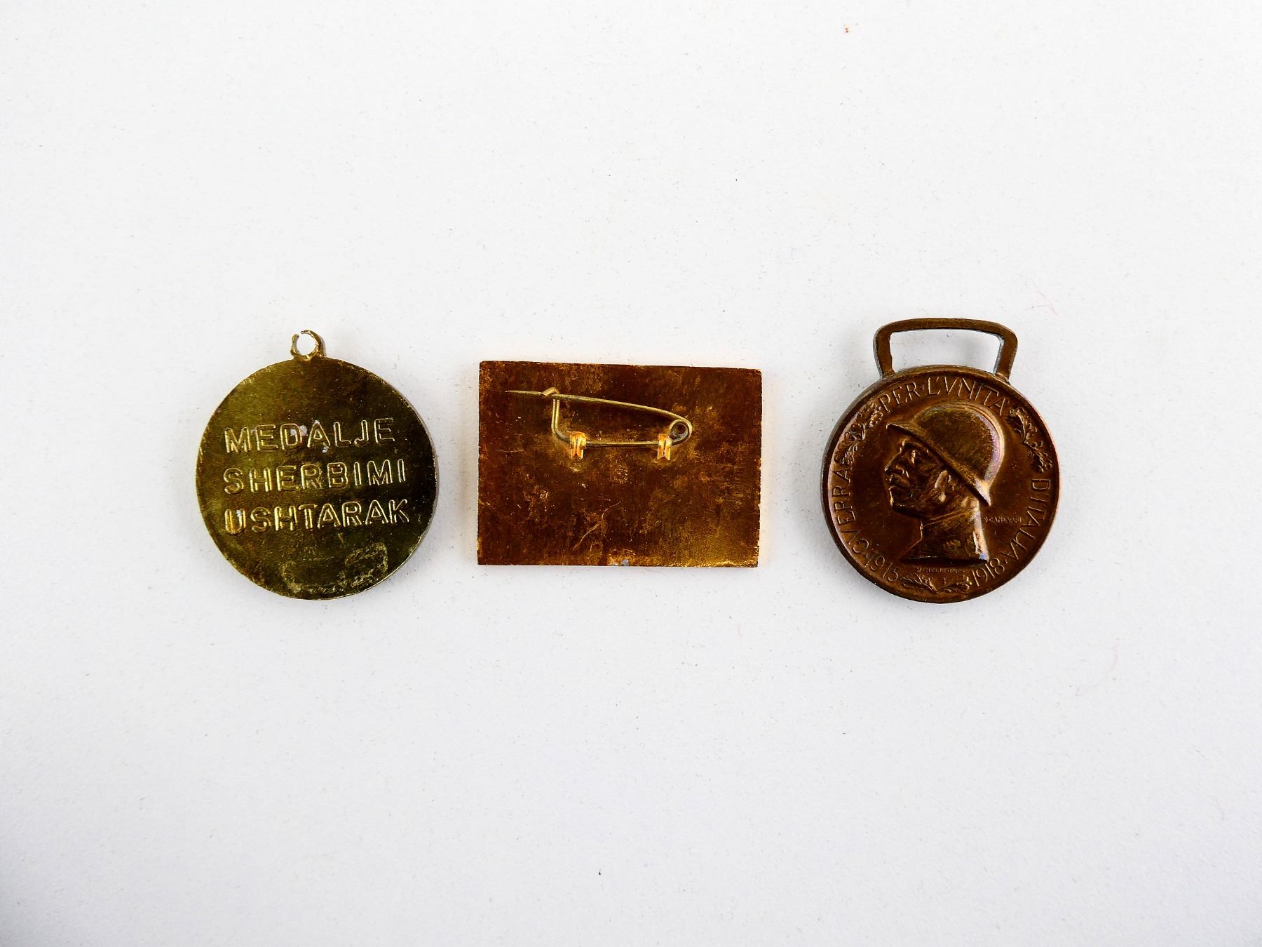LOT INCLUDES; (1) WWI ITALIAN COMMEMORATIVE MEDAL FOR THE ITALO-AUSTRIAN WAR (1915-1918), MISSING RIBBON, (1) ALBANIAN MEDAL FOR MILITARY SERVICE, MISSING RIBBON & (1) 25 ANNIVERSARY OF THE UEM (UZINA ELEKTRO MEKANIKE) BADGE, WHICH IS AN ELECTROMECHANICAL PLANT IN TIRANA ALBANIA. SEE PHOTOS.