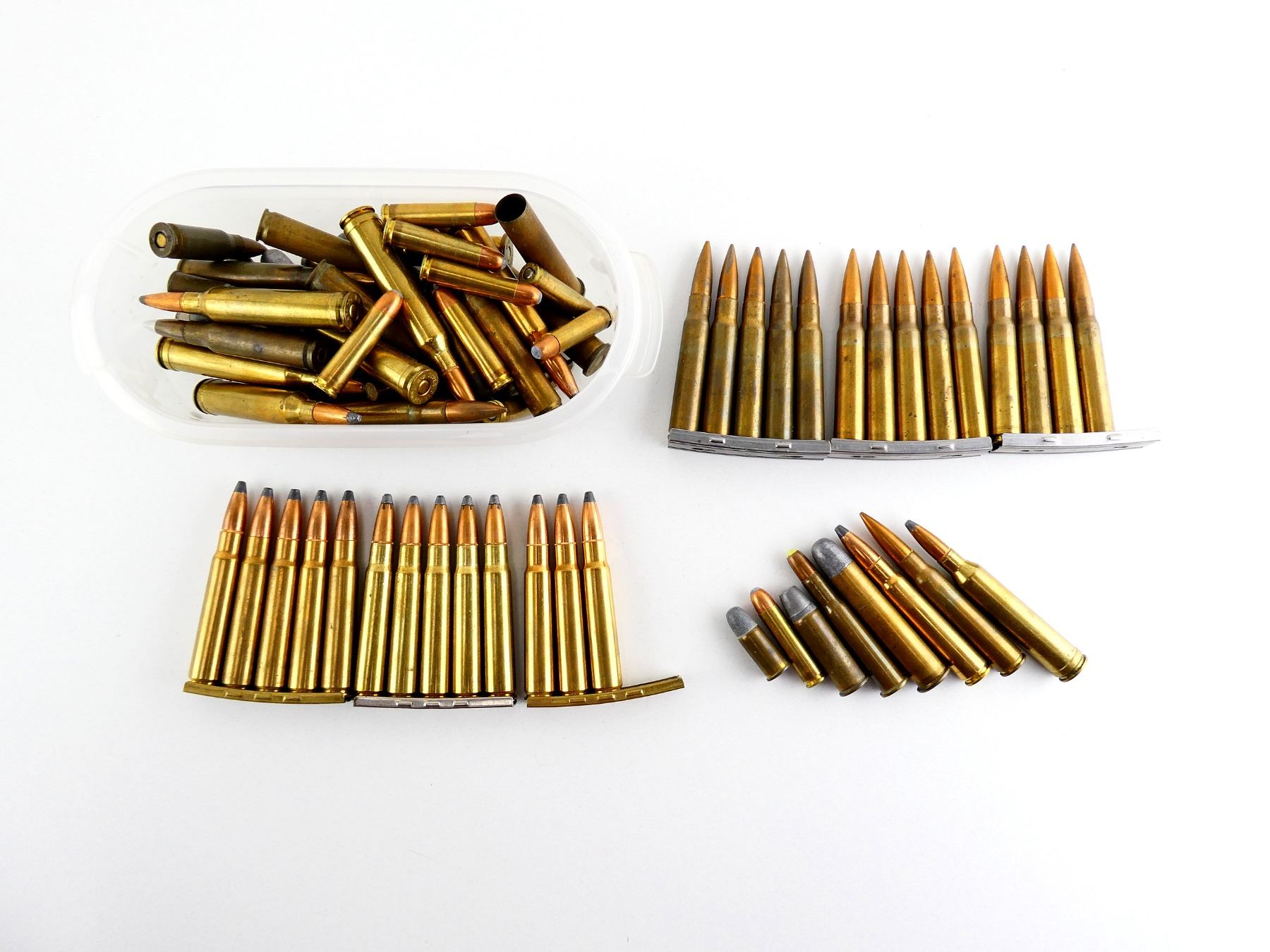 LOT INCLUDES; APPROX. (81) RNDS, VARIOUS CALIBERS INCLUDING; 8MM MAUSER, 7MM REM MAG, .45-70 GOVT, .30 CARBINE, ETC., (1) NON-PRIMED BRASS CASE, (6) STRIPPER CLIPS, CONTAINS SOME MILITARY RNDS.