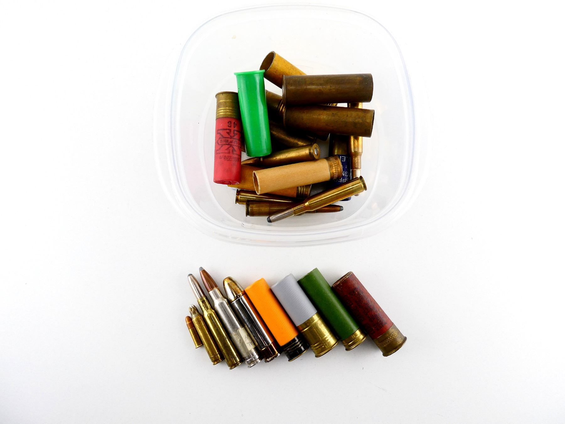 LOT INCLUDES; APPROX. (17) RNDS, VARIOUS CALIBERS INCLUDING; 7MM, 7X57MM, 6.5X54 MS, .338 WIN MAGNUM, 12 GAUGE 2 3/4" SHOT SHELLS, ETC., (6) PRIMED SHOT SHELL HULLS, (2) BLANKS, ETC.