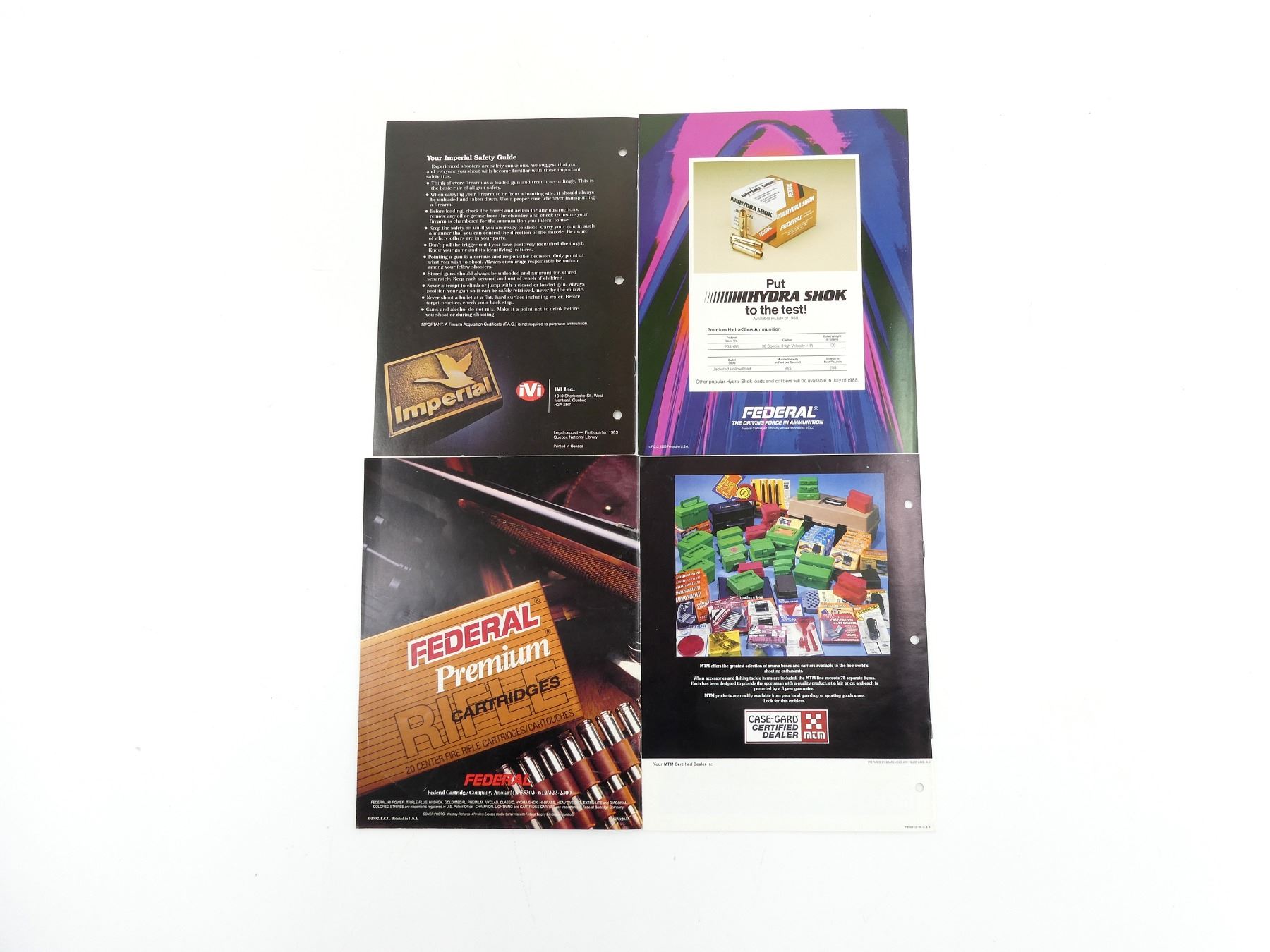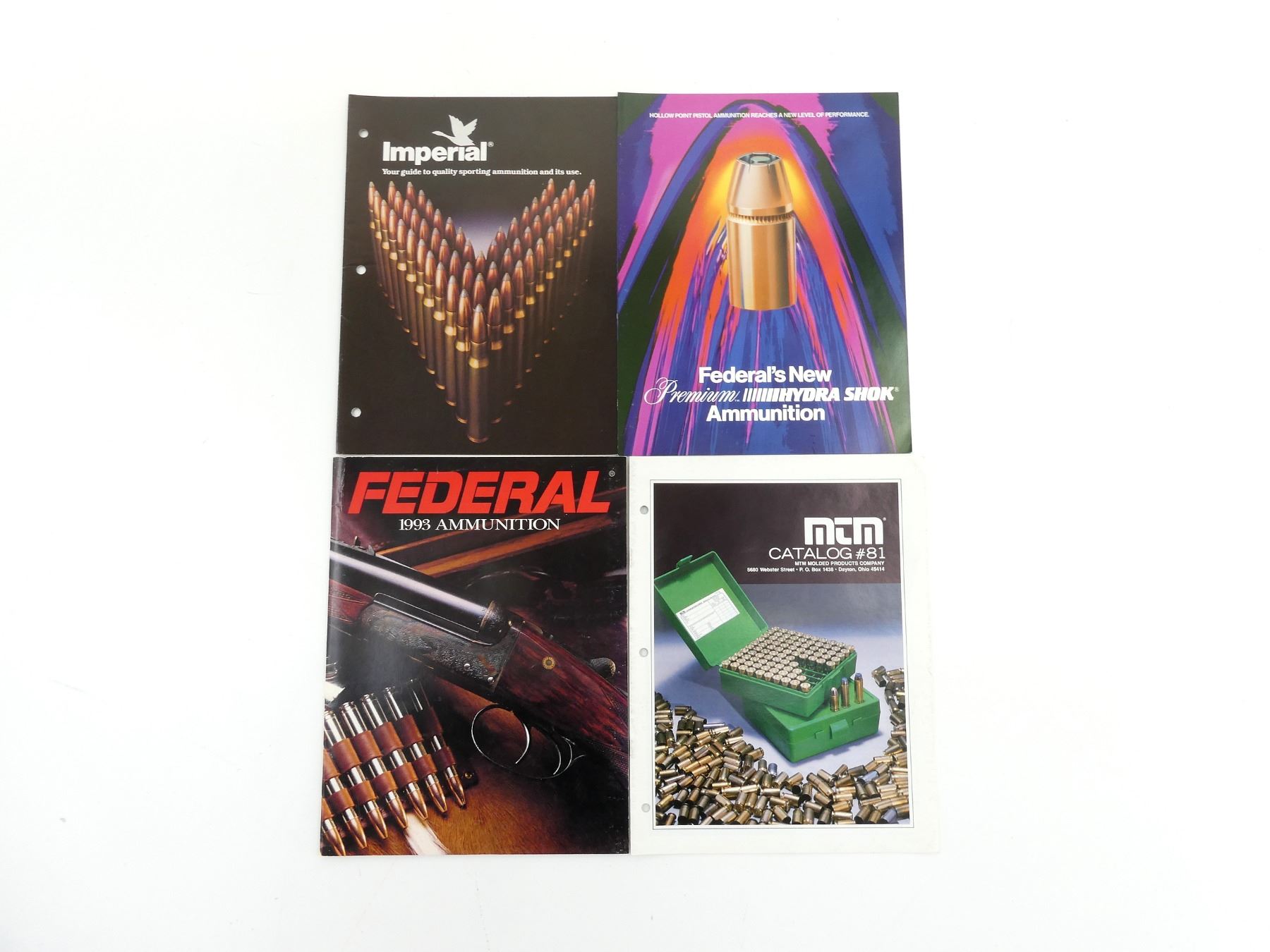 LOT INCLUDES; (1) "IMPERIAL YOUR GUIDE TO QUALITY SPORTING AMMUNITION AND ITS USE", SOFT COVER, (1) "MTM CATALOG #81", SOFT COVER, (1) "FEDERAL'S NEW PREMIUM HYDRA SHOK AMMUNITION", SOFT COVER & (1) "FEDERAL 1993 AMMUNITION", SOFT COVER. SEE PHOTOS.