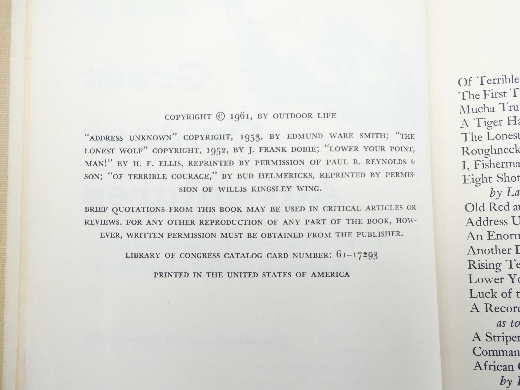 LOT INCLUDES; (1) "PETERSON FIELD GUIDES, ANIMAL TRACKS" BOOK BY OLAUS J. MURIE, SOFT COVER, ISBN: 0-395-91094-3, (1) "HUNTING UPLAND BIRDS" BOOK BY CHARLES F. WATERMAN, SOFT COVER, ISBN: 0-88317-051-5, (1) "BEAR, SPIRIT OF THE WILD" BOOK BY PAUL NICKLEN, HARD COVER WITH DUST COVER, ISBN: 978-1-4262-1176-8 & (1) "GREAT OUTDOOR ADVENTURES" BOOK BY OUTDOOR LIFE, HARD COVER, COPYRIGHT 1961. SEE PHOTOS.