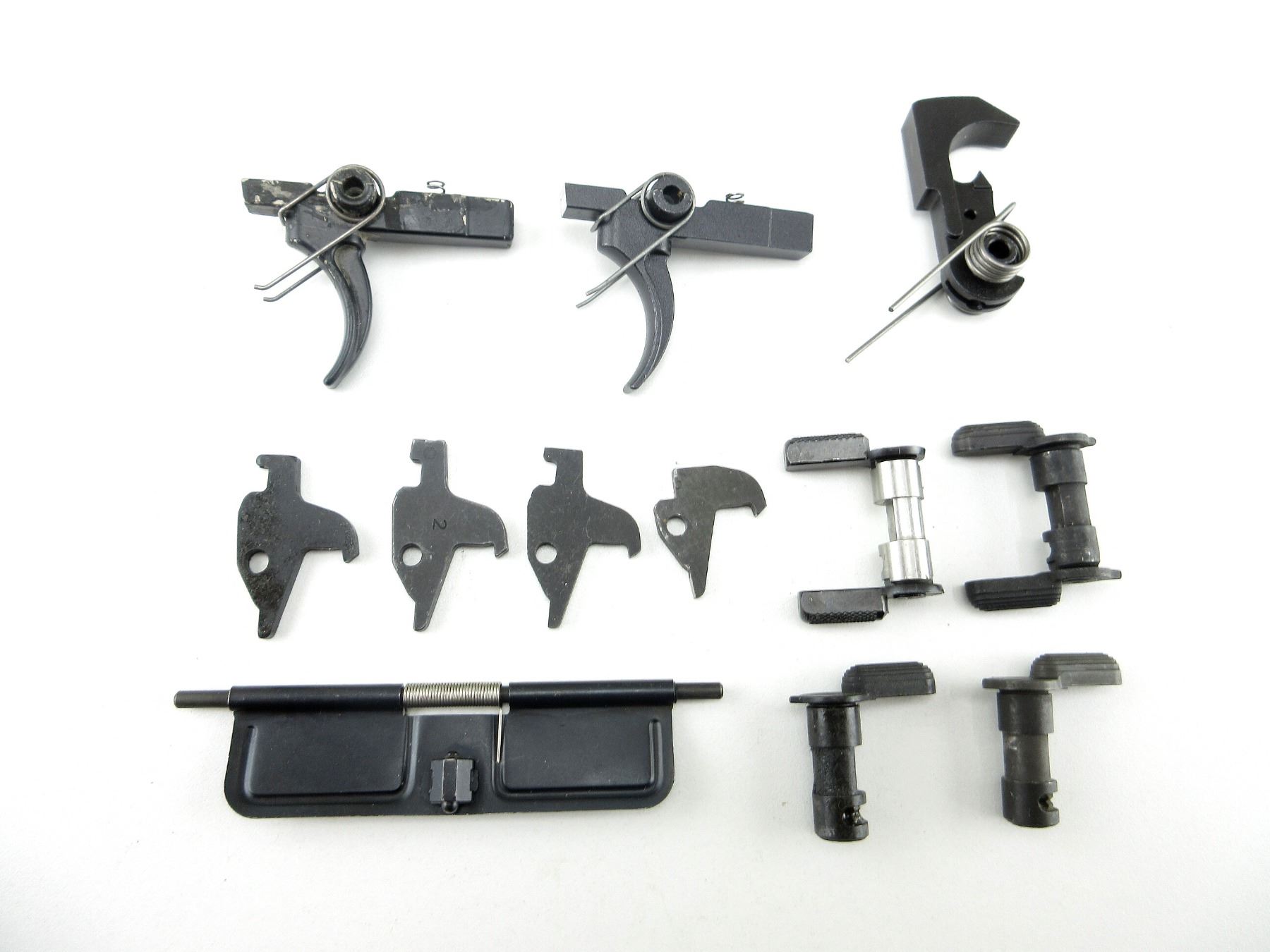 LOT INCLUDES; TRIGGERS WITH SPRINGS, AMBIDEXTROUS SAFETIES, STANDARD SAFETIES, DISCONNECTORS, HAMMER WITH SPRING, EJECTION PORT COVER ASSEMBLY, ETC. MAY REQUIRE FITTING. SEE PHOTOS.
